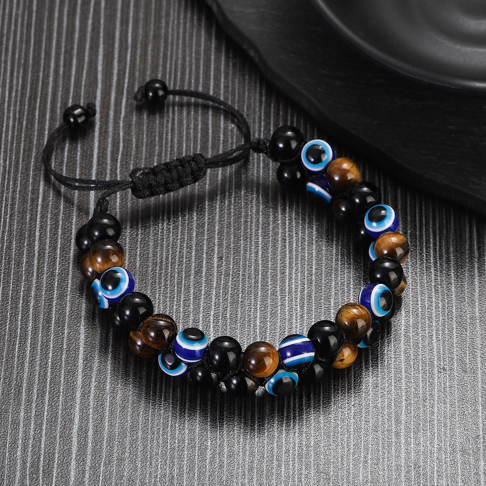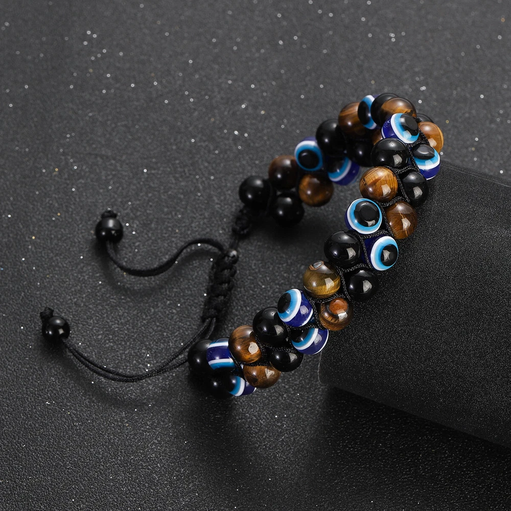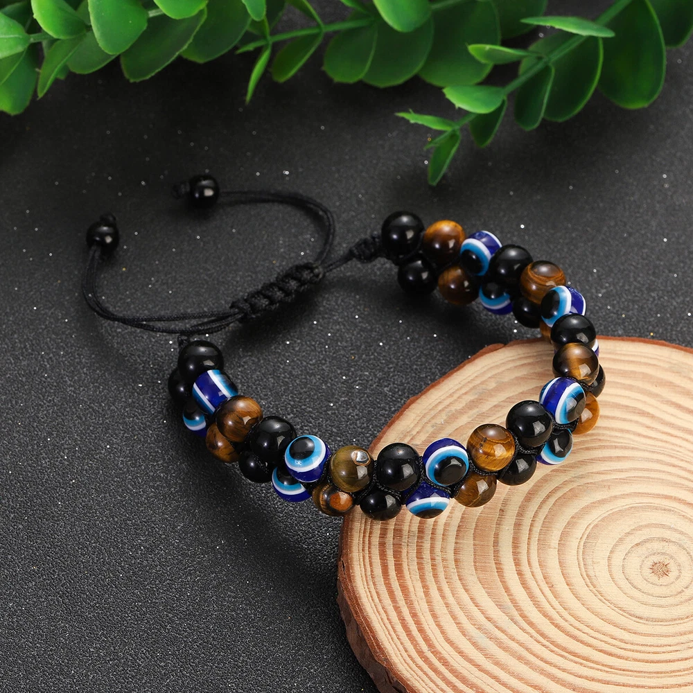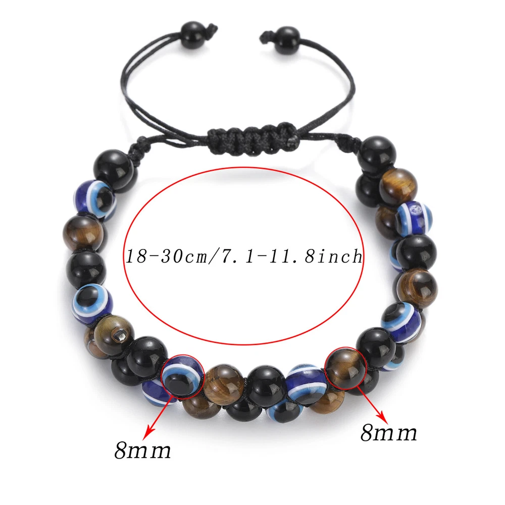 【Piritual Energy Healing Stone Bracelet】This healing crystal stones are known for their great energy.Black Obsidian have strong healing properties that provide power to face fears, absorb negative energy and transform stress into positivity. The brown tiger eye is noble and domineering,attracts wealth,brings strengthens belief and brave. The Devil's Eye is also called the Guardian's Eye. Not only can it protect the health of friends, loved ones,and family,but it can also bring luck to them. 【Exquisite Handmade Bracelet】Each healing stone has a natural texture, which has been polished by professional artisan to ensure that the stones are delicate.None of them is repeated. Every single piece looks similar but unique.We carefully select and craft each handmade bracelet,use the wave weaving method to weave three different healing stones together, which is very stable. The high quality beaded bracelets are durable and imply auspiciousness. 【Stretch Adjustable Design】This protection bracelet comes in stretch adjustable size design and is designed for people with wrist 6.7” - 8.3”. You can easily adjust to fit your hand circumference,and pair them with your other jewelry. This 8mm natural stones protection bracelet is good for men and women,no need to take it off when take shower or swimming.Whatever the occasion, this triple protection bracelet will look fantastic. 【Ideal Gift with Good Wishes】This triple protection bracelet can be a wonderful gift for your lover, mom, dad, kids, best friends and anyone who is important to you. It is a meaningful gift to bringing luck and prosperity and happiness.This is a good wishes for Christmas,Birthday, Mother's Day, Father’s Day, Anniversary, Graduation, Thanksgiving,Valentine's Day