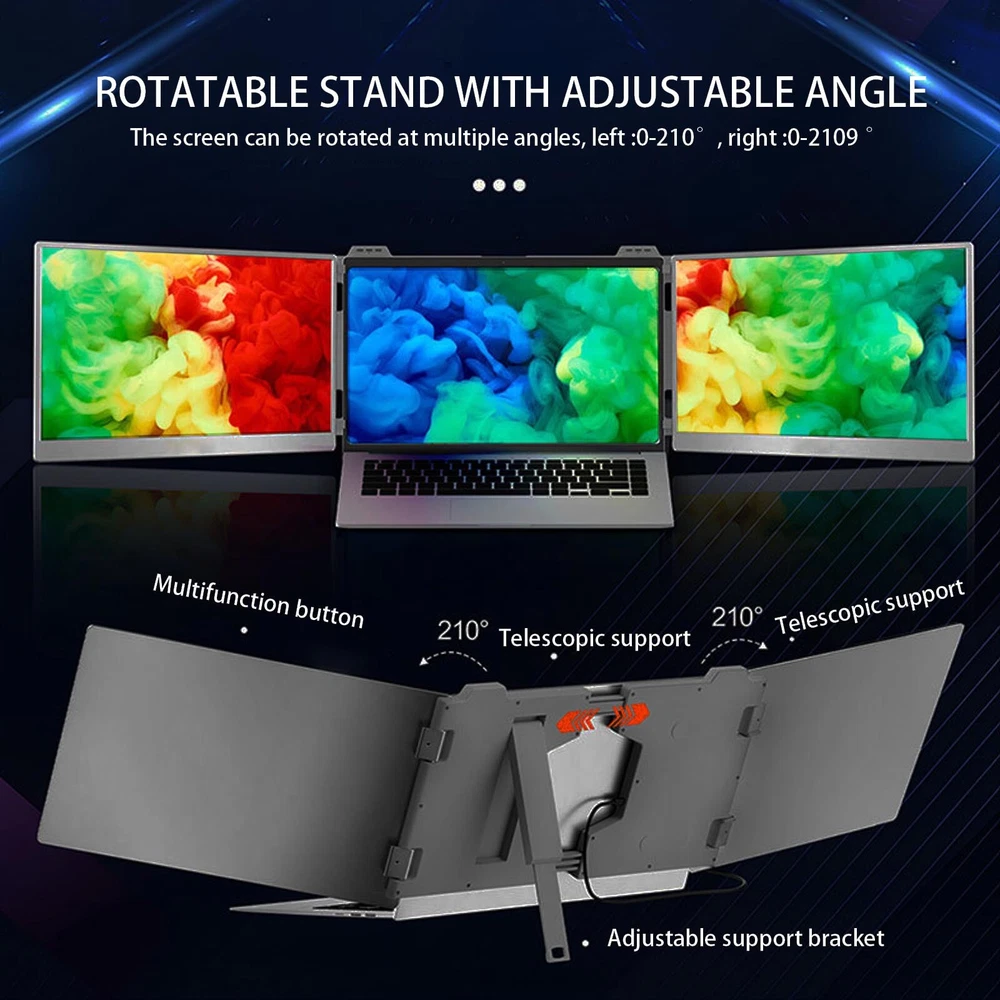 15.6-inch portable triple-screen display 1080P laptop dual display extender titanium color Three-screen display, efficient office: office, design, editing and entertainment are carried out at the same time, and work efficiency is rapidly improved. One-line direct connection: No need to install drivers, two displays can be connected with only one Type-C data cable. Rotatable bracket, angle can be adjusted The screen can be rotated at multiple angles, left: 0-210°, right: 0-210° Ultra-narrow frame and ultra-thin design High-end and fashionable appearance, simple and atmospheric, travel on business, put it in the bag and carry it with you Ultra-narrow frame 100% SRGB color gamut HDR high dynamic contrast 15.6 inches: recommended laptop size: 15.6”-16.1” Length (left to right): 310-375mm Width (top to bottom)>165mm Computer display thickness<8mm Payment: The buyer is responsible for any applicable import duties and local taxes. Usually there's not any charges for small parcel. But please verify with your customs before making your purchase. Return: If you are not completely satisfied with your purchase, simply return the item to us in its original condition within 14 days of receipt. We will issue a full refund on receipt, excluding the return delivery charge. About US: We are a professional foreign trade e-commerce company, mainly engaged in foreign trade B2C platform business. Our foucs includes instrument meters and accessories, household items, car accessories, Led lighting etc. Our company is energetic and creative and wish to bring you great service and amazing experience.