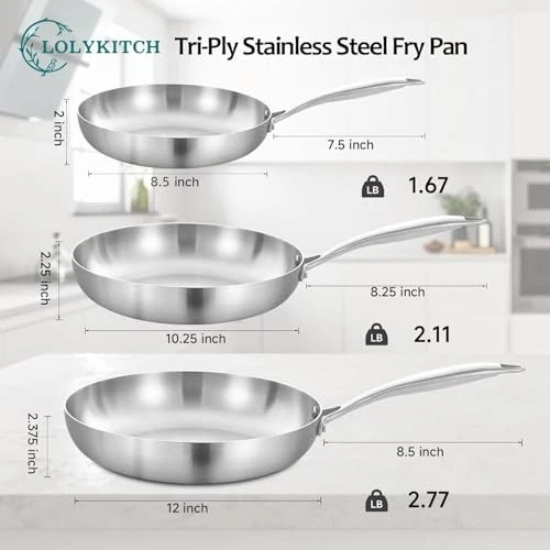 Return Policy Fast Delivery Trusted seller 8.5-10-12 Inch Tri-ply Stainless Steel Frying Pans Set of 3,Stir-Frying Pans,Skillets,Induction Cookware,Pots and Pans Set,Oven and Dishwasher Safe,Riveted Handle. Product Description 【Efficient Heating & Versatile Cooking】 3-ply stainless steel pan heats rapidly and evenly. Ideal for various cooking methods: low heat for eggs, medium-low for general cooking, and medium-high for searing meat. Avoid heating empty pan for optimal performance and longevity 【PremiumTri-Ply Construction】 pan features a high-purity aluminum core sandwiched between two layers of durable stainless steel.The 18/0 food-grade stainless steel cooking surface with starburst finish ensures excellent durability, non-reactivity with food, and preserves natural flavors 【Energy-Efficient Design】 frying pan set save up to 20% fuel with its efficient heating technology. Perfect for eco-conscious cooks who demand high performance while reducing energy consumption. Experience superior cooking results with less energy input 【Ergonomic & Versatile Design】Featuring a detachable stainless-steel handle that stays cool for safe handling and easy storage. Includes a tight-sealing glass lid with steam vent for effortless monitoring during cooking.Perfect for various cooking methods from stovetop to oven 【Health-Conscious Choice】 stainless steel set are PFOA-Free and SGS Certified, ensuring safe and healthy cooking.Our commitment to your well-being makes this pan ideal for health-conscious cooks seeking both convenience and peace of mind in their kitchen 【Versatile Cooking Companion】 stainless steel pan excels in frying, stir-frying, steaming, baking, and searing. Ideal for both home and commercial kitchens, it's also perfect for outdoor cooking. Experience culinary versatility with one premium pan 【Durable & Easy Maintenance】Premium tri-ply construction ensures compatibility with all stovetops and oven-safe up to 500°F(glass lid 300°F). Durable design allows for easy cleaning and is dishwasher-safe, perfect for busy professionals and families seeking convenience Shipping Returns Payment Shipping Shipping is FREE to all addresses other than APO/PO boxes in the lower 48 states. All our stock ships from US-based warehouses. Shipped via USPS or UPS (depending on location and package weight) Unless stated otherwise, all orders will ship within 24-72 hours of your payment being processed. Check our feedback to see the great reviews of FAST shipping we offer. Returns Seller does not accept returns Payment We currently accept payment via eBay managed payments only. Once payment is cleared, we will dispatch your shipment within 1-3 business days. Please refer to the "Shipping" tab for more information regarding shipping speed to your destination.