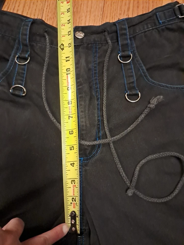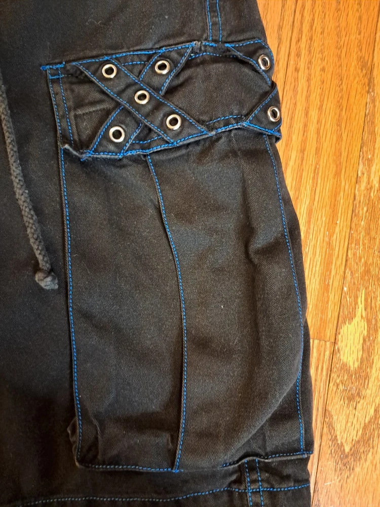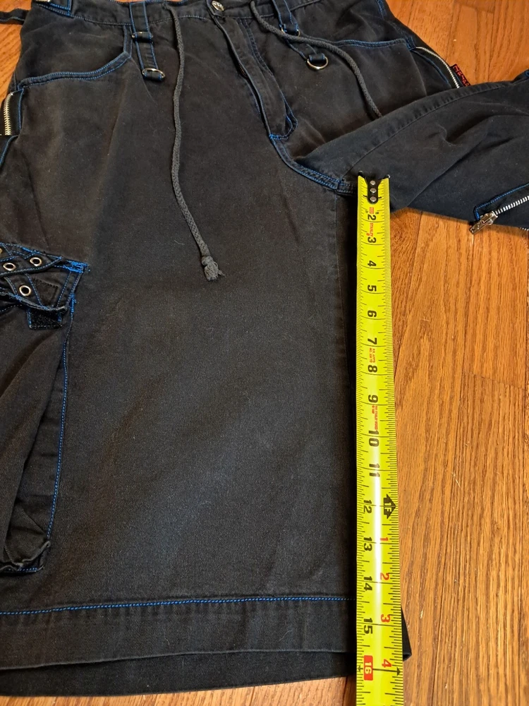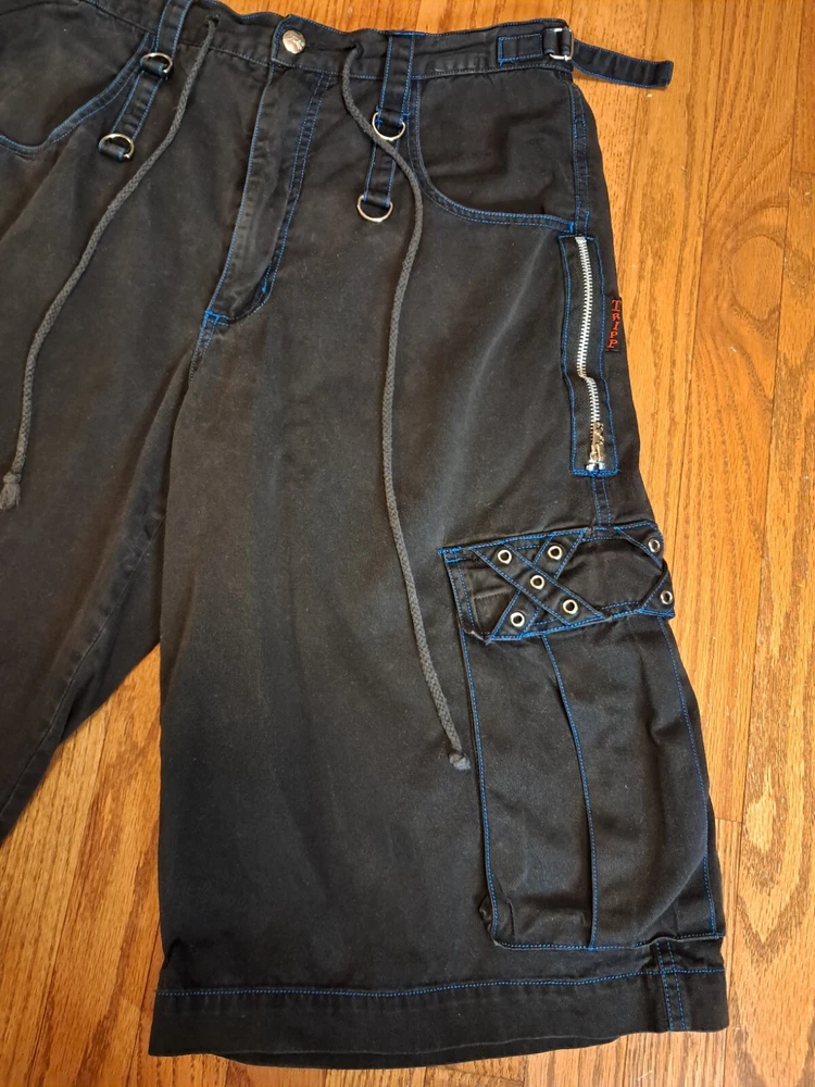 Tripp NYC Shorts Medium Vintage Y2K Goth Punk Black W Blue Stitching Zippers Smoke free pet free home Black and drawstring material shows some fading