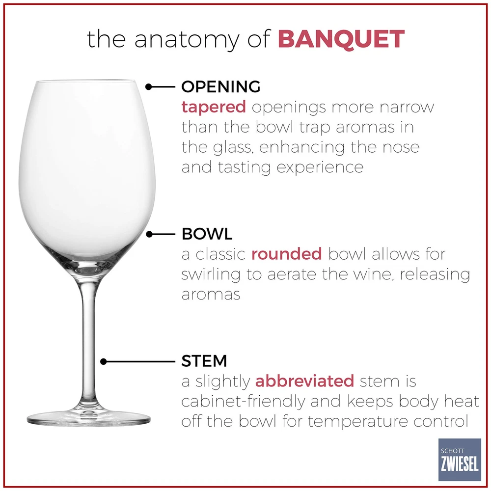 Tritan Crystal Glass Since 1872, we have been dedicated to serving the world’s guests and finest hosts. ZWIESEL GLAS has never just been about glass, but has always echoed the possibilities inherent in glass. We strive to create unique products at the highest level of manufacturing, skill, and craftsmanship that offer extraordinary experiences of enjoyment and community. The sound of a toast with a ZWIESEL glass is the unmistakable sound of authentic hospitality. Our machine-made series, , not only impress with their high brilliance and special resistance to breakage and dishwashing, but are also characterized by their sustainability. Only regional and tested materials are used for production which ensures 30% less energy consumption and significantly less carbon dioxide and nitrogen emissions during production. Set of 6 wine/water stemware glasses in the Banquet collection; water goblet style; 16 oz capacity; 8. 5-Inch tall, 3. 13-Inch wide Made of Tritan crystal; composed of titanium oxide and zirconium oxide; Tritan is a world wide patented crystal glass material Banquet barware collection: features a classic, rounded profile design Completely dishwasher safe; do not force bowl tightly over dishwasher rack prongs; do not twist stem and bowl while holding one or the other tightly