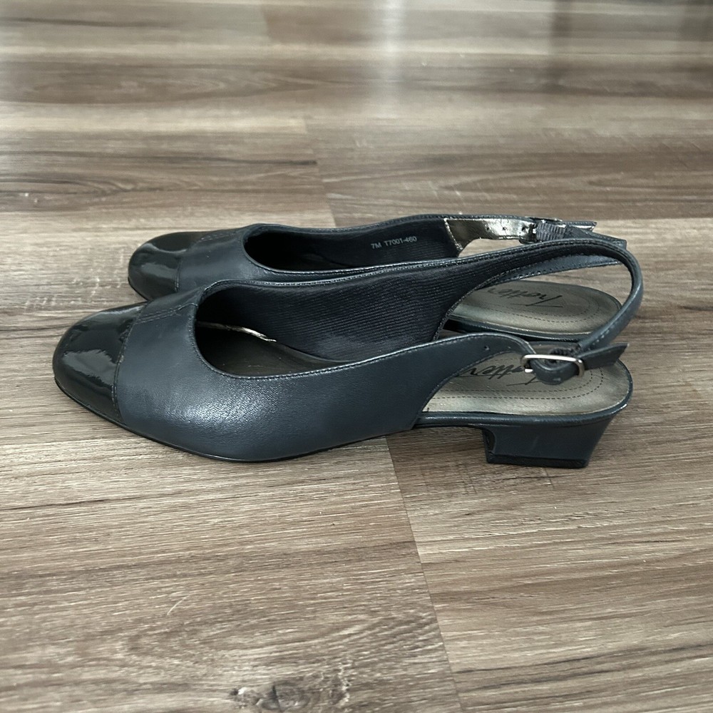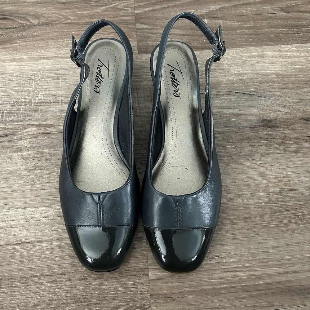 Trotters Blue Leather Patented Toe Square Kitten Heel Slingback Heels Women 7M. Trotters Blue DEA Leather Patented Toe Square Kitten Heel Slingback Heels Women Size 7M in great preowned condition/ adjustable strap with stretch/ Sqoval toe, super cute #24 Heel 1.5” Approximate measurements All final sale Work, office, business, sophisticated, preppy, preppy Koket feminine dainty
