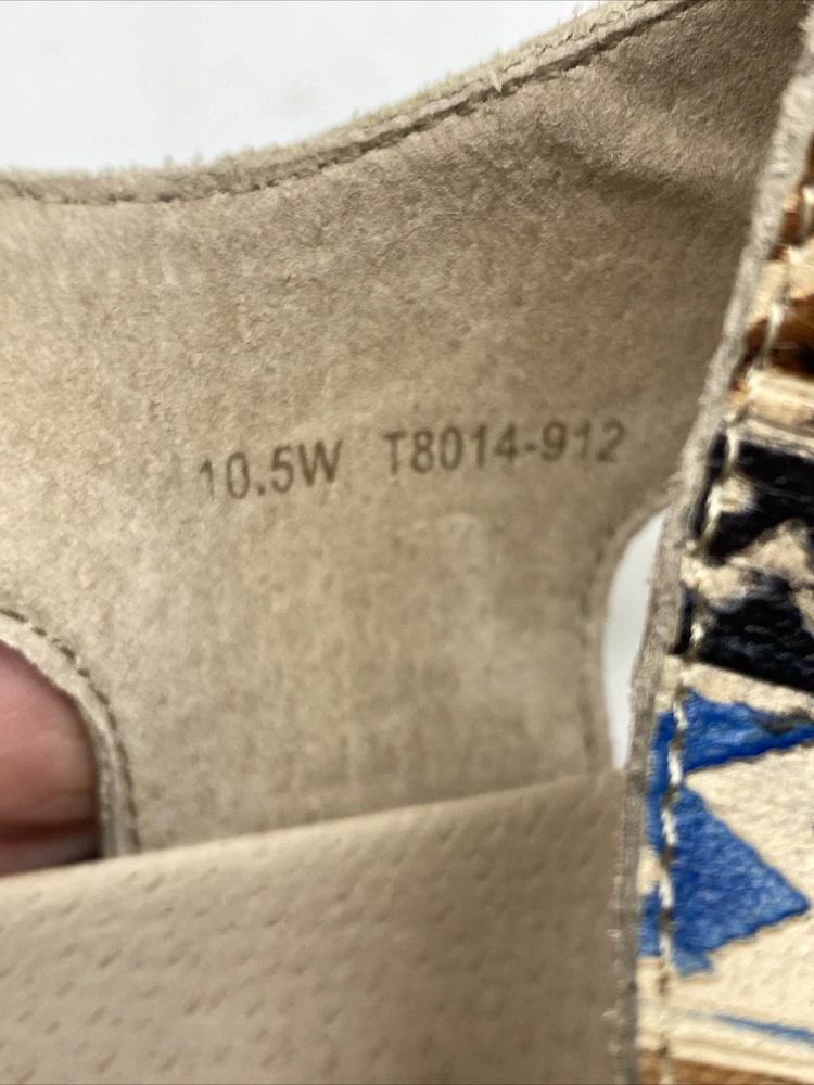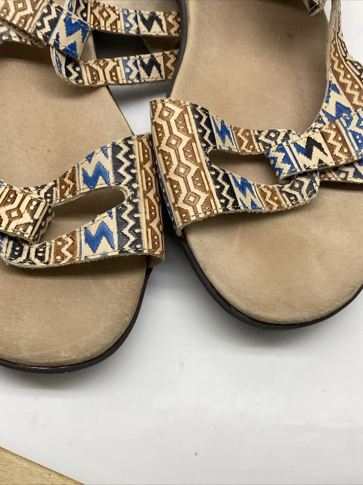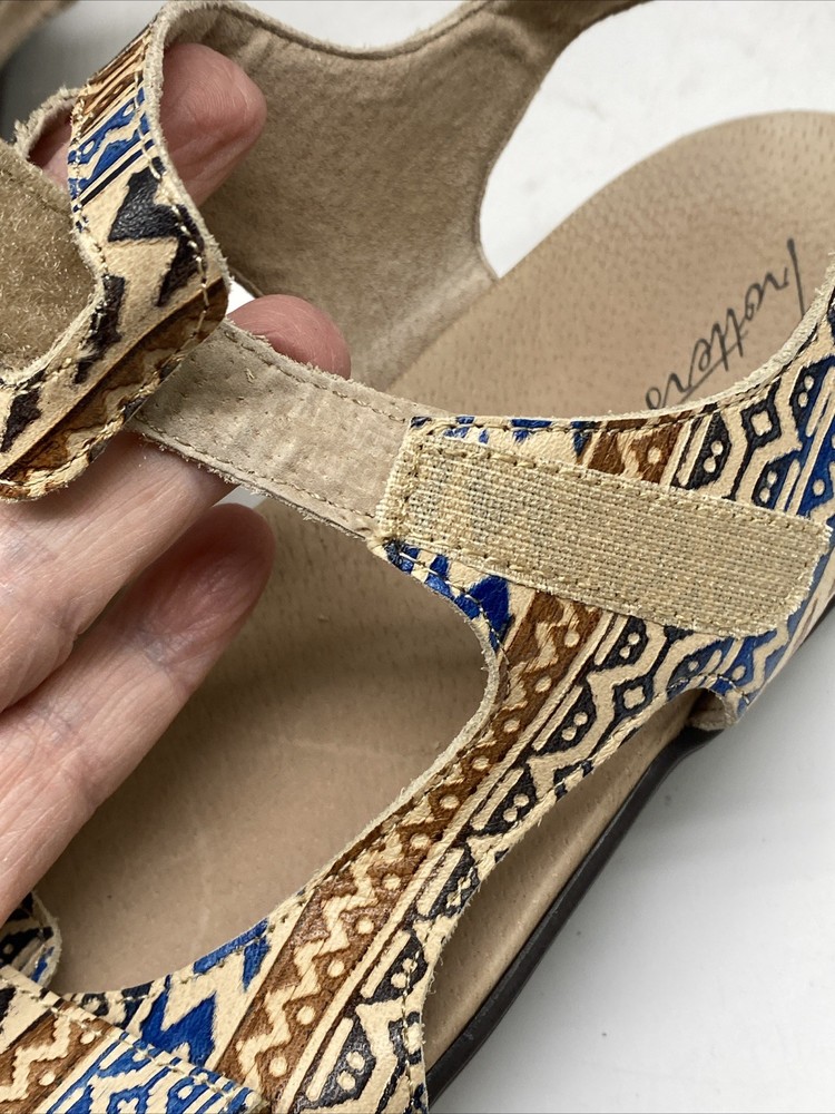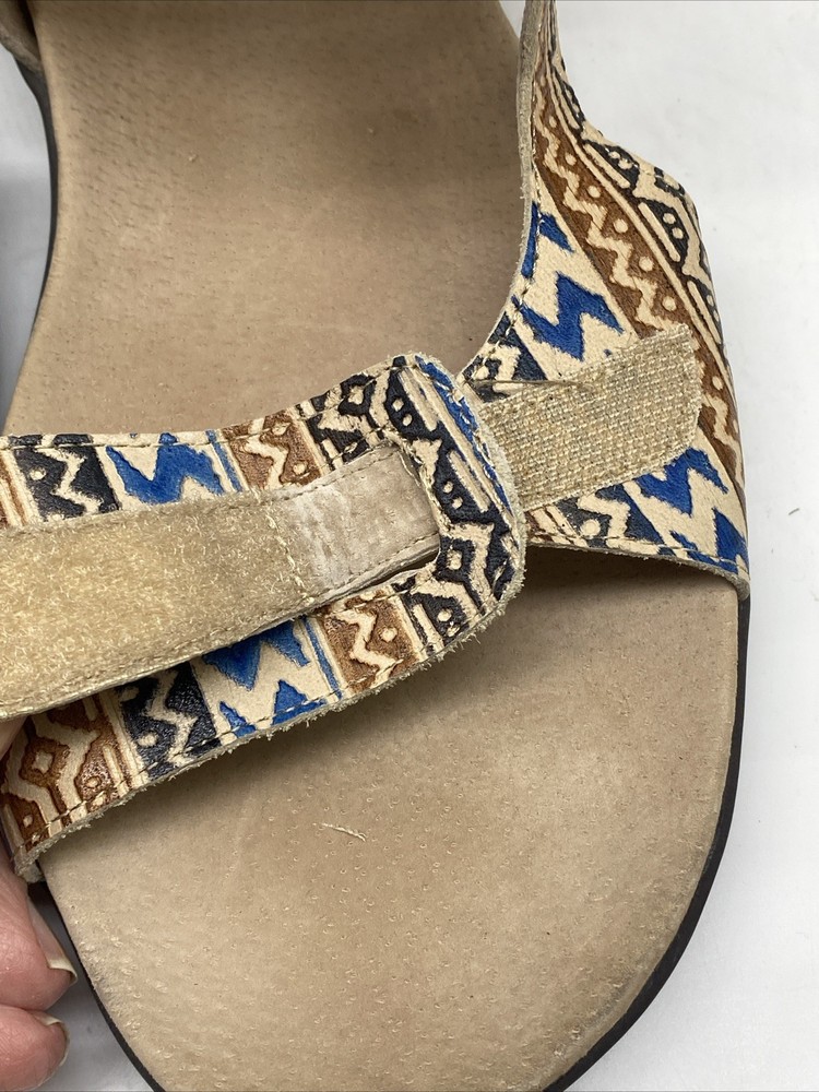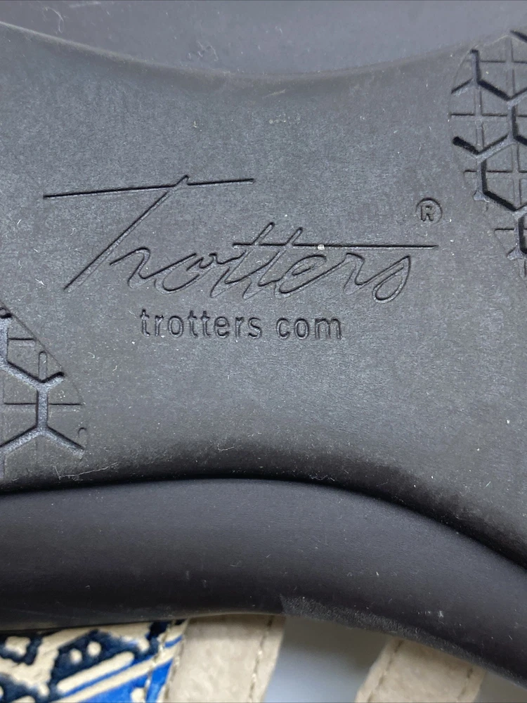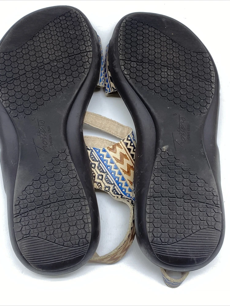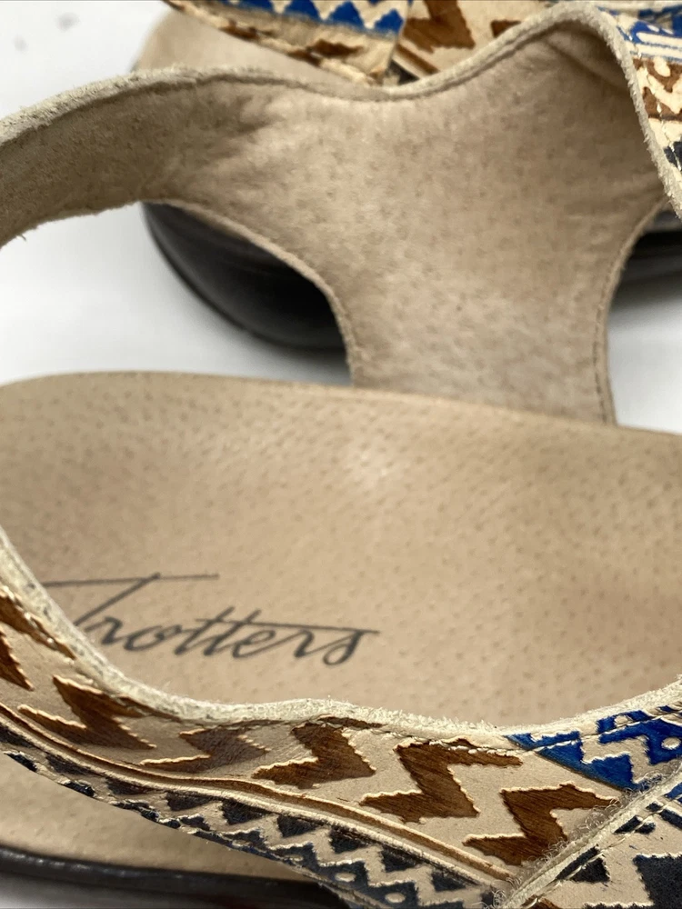 The Trotters Women's Sandals in Beige Aztec pattern offer both style and comfort for casual occasions. Featuring a slip-on closure and low wedge heel, these sandals are easy to wear and provide arch support. Made with leather uppers and breathable synthetic lining, they are lightweight and perfect for summer, fall, and spring. The Aztec theme adds a unique touch to the design, making these sandals a versatile choice for any woman's wardrobe. crafted with quality materials and a comfortable fit, these sandals from Trotters are sure to be a favorite for everyday wear.