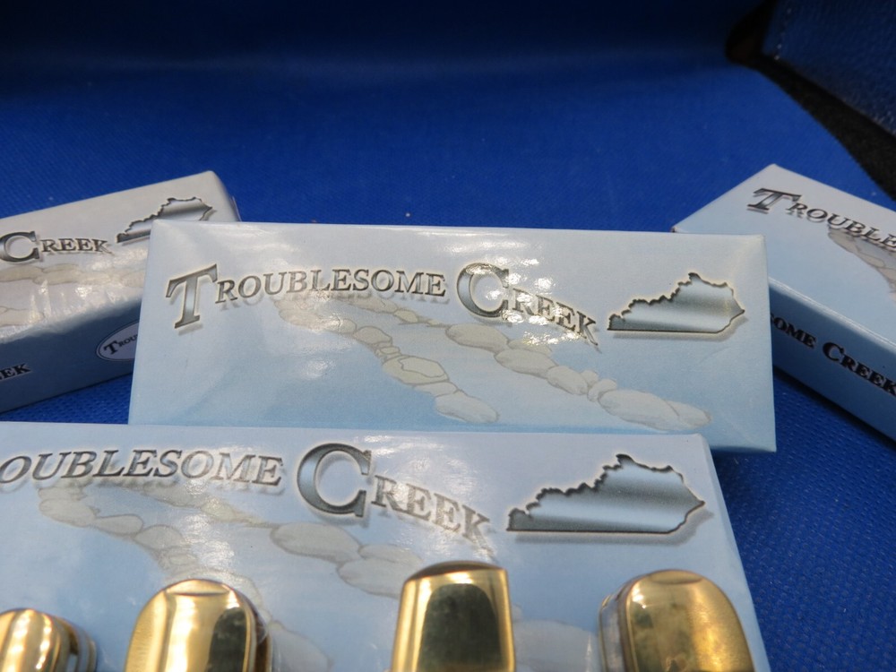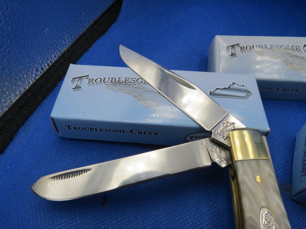 The TROUBLESOME CREEK 5 KNIVE COLLECTION features a variety of pocket knives with beautiful celluloid handles in white, brown, and gray colors. The knives in this assortment have drop point blades, slipjoint lock mechanisms, and are manually opened. The collection includes knives with 2, 3, or 4 blades, all made with stainless steel handles. Each knife is part of the modern folding knives category and is a collectible item that showcases different assorted patterns. KNIVES ARE ALL BRAND NEW WITH BOXES AND YOU WILL RECIEVE THE ACTUAL KNIVES PICTURED WE KNOW YOU HAVE A CHOICE WHERE YOU SHOP… THANKS FOR SHOPPING WITH US AT NO PRESSURE SALES,LLC PLEASE BE SURE AND VISIT OUR OTHER ITEMS Thanks for looking YOU WILL RECEIVE THE ITEM PICTURED UNLESS IT IS A MULTIPLE LISTING OR OTHERWISE STATED.ALL BONE KNIVES COME FROM BOVINE (COW) BONE UNLESS OTHERWISE STATED !!