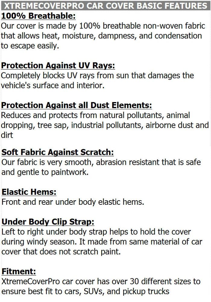 XTREMECOVERPRO PLATINUM SERIES WATERPROOF BREATHABLE CAR COVER XTREMECOVERPRO CAR COVER BASIC FEATURES 100% Breathable: Our cover is made by 100% breathable non-woven fabric that allows heat, moisture, dampness, and condensation to escape easily. Protection Against UV Rays: Completely blocks UV rays from sun that damages the vehicle's surface and interior. Protection Against all Dust Elements: Reduces and protects from natural pollutants, animal dropping, tree sap, industrial pollutants, airborne dust and dirt Smooth Fabric Against Scratch: Our fabric is very smooth, abrasion resistant that is safe and gentle to paintwork. Elastic Hems: Front and rear under body elastic hems. Under Body Clip Strap: Left to right under body strap helps to hold the cover during windy season. It made from same material of car cover that does not scratch paint. Fitment: XtremeCoverPro car cover has over 30 different sizes to ensure best fit to cars, SUVs, and pickup trucks ADDITIONAL FEATURES FOR DIFFERENT SERIES Pro Series Pro Plus Series Silver Series Black Fabric with Double Yellow Stitching: Beautiful black with yellow stitching car cover makes your car like in a show room vehicle Gray Fabric with Double Stitching: Gray color with same color double stitching seams provides an incredible strength and durability. Pro Series is not waterproof Plus the basic features Soft Cotton Fabric Against Scratch: Extra soft, smooth, abrasion resistant cotton lining that safe and gentle to paintwork Black Fabric with Double Yellow Stitching: Beautiful black with yellow stitching car cover makes your car like in a show room vehicle Gray Fabric with Double Stitching: Gray color with same color double stitching seams provides an incredible strength and durability. Pro Plus Series is not waterproof Plus the basic features 100% Waterproof: No water can pass through but allows moisture to escape easily. Double Stitching with 100% Leak-proof Heat Welded Seal Strong double sitiching with leak-proof heat welded seal provides true 100% waterproof and all weather protection for your vehicle. Under Body Adjustable Drawstring: adjustable drawstring helps to tie up the cover and helps to hold the cover during windy season. Also helps the cover to fit more snug. Silver Series is made by PVC vinyl. It is heavier material. Plus the basic features Gold Series Platinum Series Diamond Series 100% Waterproof: No water can pass through but allows moisture to escape easily. 100% Leak-proof Ultrasonic Heat Welded Seams provides true 100% waterproof and all weather protection for your vehicle. Lightweight: eco friendly non-woven fabric reduces time and effect during process of install and remove the cover. Under Body Adjustable Drawstring: adjustable drawstring helps to tie up the cover and helps to hold the cover during windy season. Also helps the cover to fit more snug. Plus the basic features Soft Cotton Fabric Against Scratch: very soft, smooth, abrasion resistant that safe and gentle to paintwork 100% Waterproof: No water can pass through but allows moisture to escape easily. 100% Leak-proof Ultrasonic Heat Welded Seams provides true 100% waterproof and all weather protection for your vehicle. Lightweight: eco friendly non-woven fabric reduces time and effect during process of install and remove the cover. Under Body Adjustable Drawstring: adjustable drawstring helps to tie up the cover and helps to hold the cover during windy season. Also helps the cover to fit more snug. Plus the basic features Soft Cotton Fabric Against Scratch: very soft, smooth, abrasion resistant that safe and gentle to paintwork 100% Waterproof: No water can pass through but allows moisture to escape easily. Double Stitching with 100% Nano-coated Waterproof Seams provides true 100% waterrpoof and all weather protection for your vehicle. Lightweight with Nano Repellent Coating: eco friendly fabric reduces time and effect during process of install and remove the cover. Extra nano coating repels water, snow, and other liquid. Under Body Adjustable Drawstring: adjustable drawstring helps to tie up the cover and helps to hold the cover during windy season. Also helps the cover to fit more snug. Plus the basic features PAYMENT INFORMATION We Accept the Following Payment: - PayPal - Credit Card About PayPal and Credit Cards: We are PayPal verified for 100% secure payments. PayPal allows you to send payment with VISA, MasterCard, Discover, American Express, bank account and PayPal balance. PayPal is our recommended payment method because it shortens the time required to wait for and process your payment. Additionally, we will receive all of your shipping information automatically when we receive your payment. If you do not have a PayPal account, please visit PayPay website for more details. Signing up for PayPal is 100% free and takes only few minutes to sign up. SHIPPING INFORMATION For Contiguous United States Shipping Information: - Economy Service (1-10 business days) For all contiguous U.S. packages take 1-10 business days depending on location. After your order shipped out, we will provide you with a tracking number that can be monitored at eBay order status. IMPORTANT: FedEx does NOT deliver to P.O. BOX. For AK, HI, VI, GU, PR, and Military Base Shipping Information: - USPS Priority Mail (2-5 business days, Military base might takes 20 business days) For Alaska, Hawaii, U.S. Virgin Islands, Guam, Puerto Rico, APO and AFO package is shipped by USPS with tracking number. After your order shipped out, we will provide you with a tracking number that can be monitored at USPS website For International Shipping Information: - USPS International Priority Mail All international package is shipped by USPS International Priority Mail. Normally it takes about 14-28 business days depends on location and custom inspection time. After your order shipped out, we will provide you with a tracking number that can be monitored at USPS website Import duty, tax, and charges are not inclu