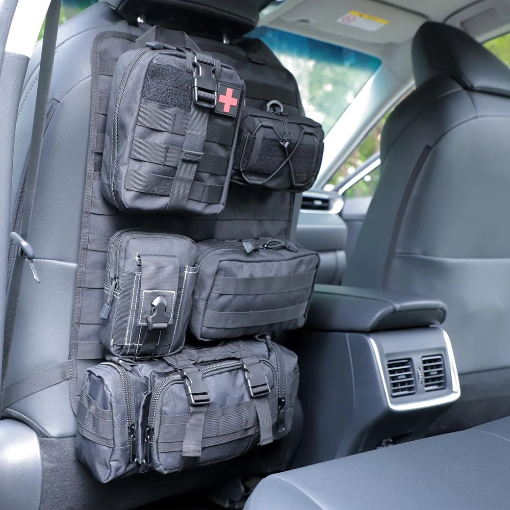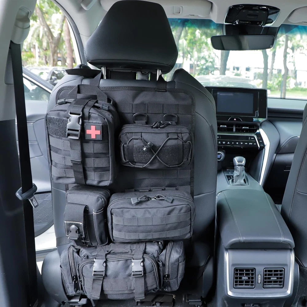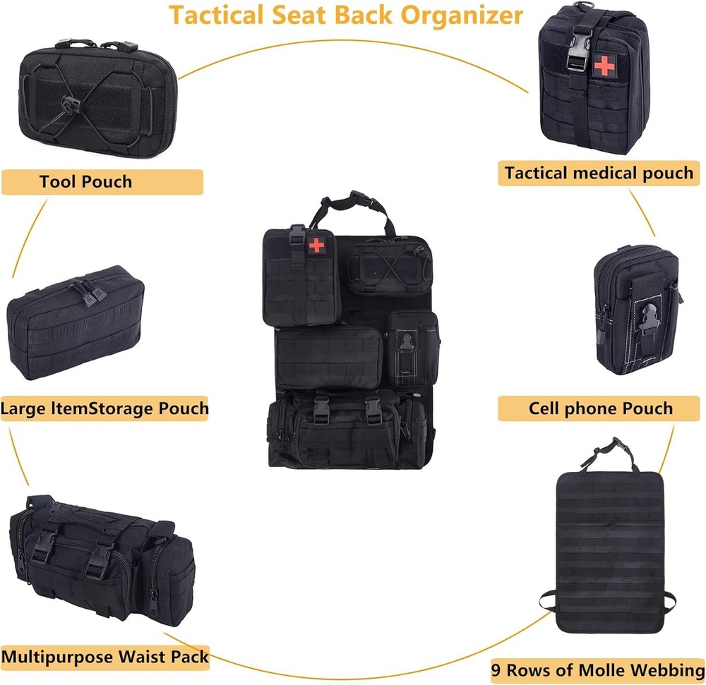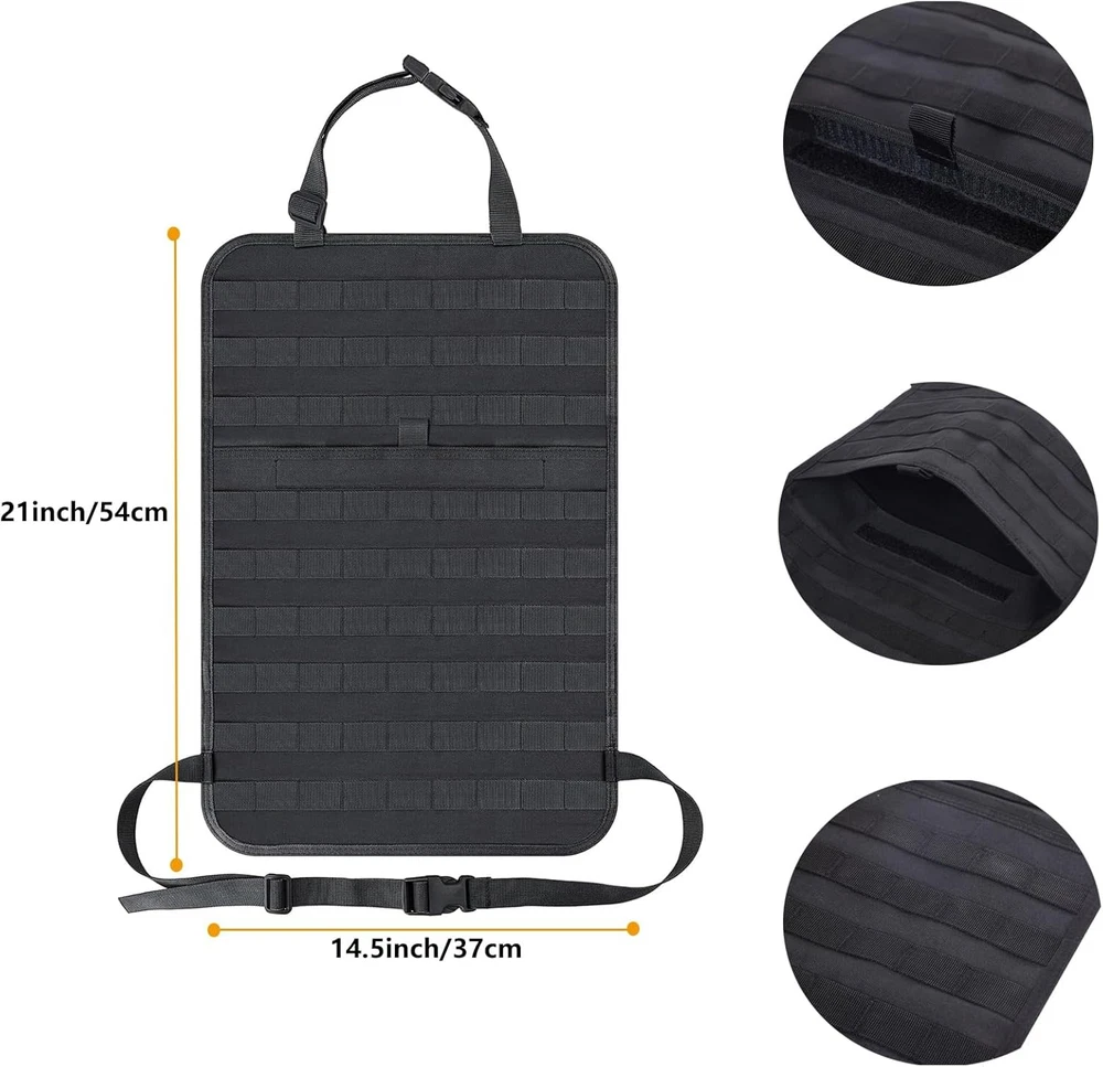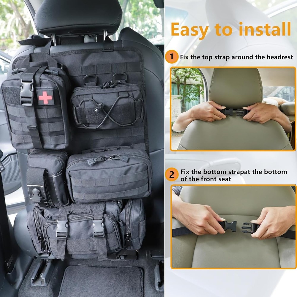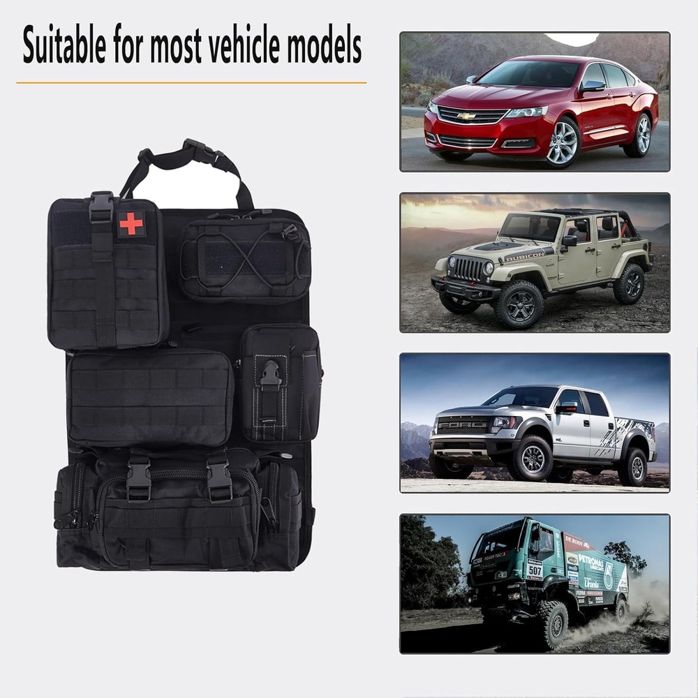 truck seat organizer and storage tactical car back Black Product Details Specific Uses For Product: Automobiles Material: Nylon Special Feature: Adjustable Color: Black Brand: Wohegyy Product Dimensions: 15.7"D x 11.8"W x 4"H Number of Compartments: 6 Shape: Rectangular Number of Items: 6 Manufacturer: Wohegyy Model: Tactical Car Seat Back Organizer Bag Item Weight: 4.4 pounds Country of Origin: China Item model number: WH-24-02-19 Manufacturer Part Number: WH-24-02-19 Special Features: Adjustable Specific Uses For Product: Automobiles Material: Nylon Special Feature: Adjustable Color: Black Brand: Wohegyy Product Dimensions: 15.7"D x 11.8"W x 4"H Number of Compartments: 6 Shape: Rectangular Number of Items: 6 Manufacturer: Wohegyy Mounting TypeItem Weight: Wall Mount4.4 Pounds 【sturdy and easy to install】There are slots in each bag to keep tools secure so they are not moving around in the bags. They are easy to clip on and off and easy to get to to release and particular bag. 【well made with 1000D nylon material】This truck seat organizer is made of nylon fabric, they are very durable can stand wear and tear, are also water-resistant. The Zippers are sturdy, stitching is solid. 【large capacity and Multi-purpose】 There are Molle bags on the back to help you store your tactical gear and personal belongings, saving space and saying goodbye to clutter in the car. Molle bags in different sizes help you sort your items easily, so you can quickly find what you're looking for.These bags can also be used as a shoulder bag or as a mobile phone bag. 【Suitable for most car models】Molle Panel with size: 21*14.5 inch. The maximum circumference of the fixed strap is 59in. Suitable for most vehicle seat back, SUV, truck, pickup, etc.(Not suitable for integrated pillows) 【Package】1*tactical molle seat back organizer,1*Tactical Molle Bag,1*Medical Pouch,1*Cell Phone Pouch,1*Large Item Storage Pouch.1*Multipurpose Waist Pack. Suitable for storing mobile phones, tactical pens, Keychains, GPS devices, digital cameras, medical supplies or any necessary small tools you need,perfect for your outdoor activities.