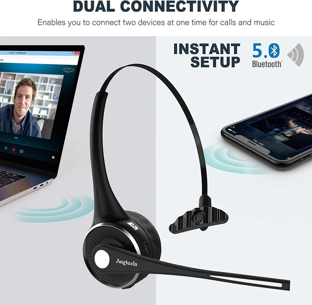 【NOISE CANCELING MIC】 - Advanced noise-canceling technology isolates your voice from the noise around you, so you can stay focused on what you want. 270° flexible mic can be positioned for better voice capture and background noise reduction. Provide crystal-clear conversations even in the busiest work environment. Perfect for when you’re working or studying from home or taking conference calls, in the car and outdoor. 【CREATED FOR COMFORT】 - Weights only 1.7oz, featuring with balanced over-the-headset design and soft protein memory-foam padding, the headset provide you comfortable wearing experience for intensive all-day use. Designed with stretchable headband, you can adjust it to a suitable width according to your head's size. 【EASY CONTROLS & MUTE FUNCTION】- wireless bluetooth headphones provides an intuitive and simple interface to adjust volume, play/pause music, and answer/end calls. key to power on and enter pairing mode, wake up Siri, etc. Just press the “+” and “-” buttons simultaneously to mute your microphone, you can easily block the sound in your side during a conversation when needed. 【MULTI-POINT CONNETCTION & WIRELESS FREEDOM】 - Widely with most Bluetooth-enabled devices, like cellphone, computer, and laptop, etc. Simultaneously connect any Bluetooth devices via Bluetooth 5.0 and seamlessly switch between the at will. The 33 feet wireless range provides freedom to roam while staying connected. Transition between chats, video conferencing or music throughout your day—all with the same headset. 【TALK ALL DAY & 3 YEAR 】- With up to 15 hours of talk time, Angeteela trucker wireless headset allows you make reliable wireless calls throughout the day on a 2- hour single charge. Designed with a sleek magnetic charging base, you can easily drop it in for a charge and storage, you can also charge the headset with the usb cable directly. 3 YEAR & always-ready friendly ensured.