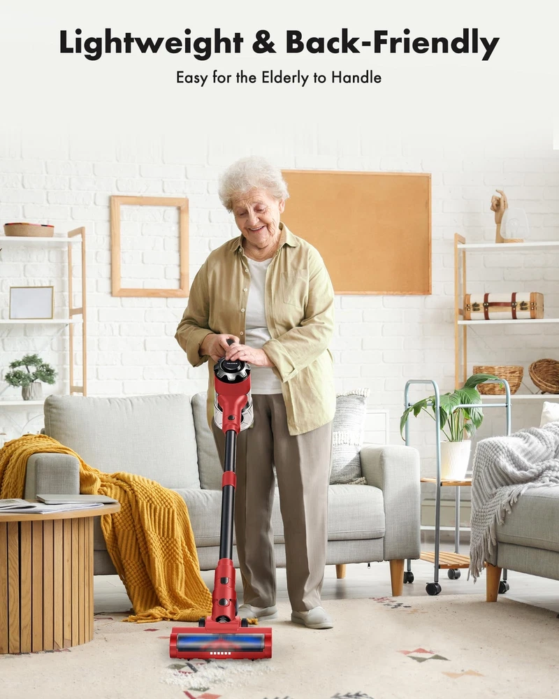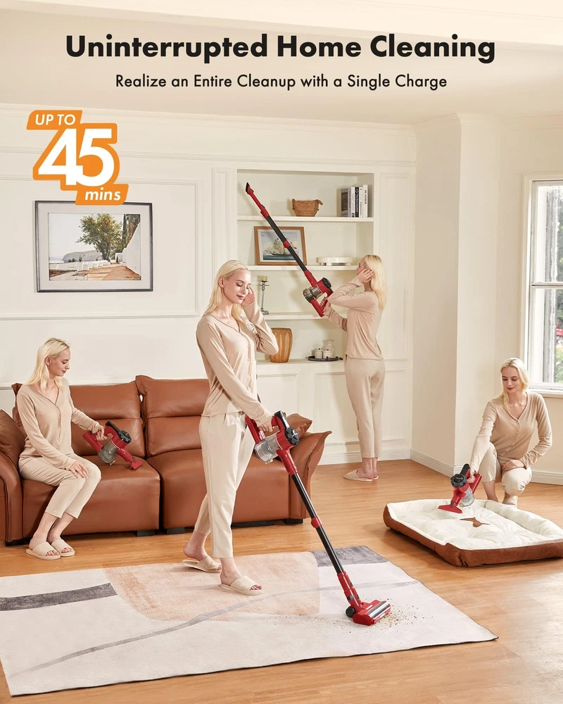 Trucozie Cordless Vacuum Cleaner, Powerful Lightweight Stick Vacuum with 45mins Runtime, 8-in-1 Rechargeable Cordless Vacuum for Carpet Tile, Pet Hair, Hard Floors, Red [LED DISPLAY & DE-TANGLE DESIGN] With this lightweight cordless vacuum in hand, you can keep every surface in your home fresh and spotless. It features an easy-to-read LED screen, allowing you to monitor the status of the stick vacuum cleaner at any time. The V shape de-tangle floor brush can lift all the long hair and dirt from carpets or hard floors. [8-IN-1 MULTIFUNCTIONAL VACUUM] Cordless and weighing less than 3.3 pounds, Trucozie T350 is effortless to maneuver and handle, without putting strain on your back. Equipped with a 2-in-1 brush and a sofa brush, it can be transformed into a handheld vacuum in seconds. Now, curtains and cobwebs are no longer beyond reach. Use the included crevice tool to suck up crumbs on car seats. [UP TO 45 MINS RUNTIME BATTERY] Equipped with a rechargeable 7*2200mAh battery pack, the Trucozie wireless vacuum cleaner can clean an entire house on a single charge. Energy-saving Mode:45mins, Mid:25mins, Max:20mins. (Measured at the hand vacuum in standard mode.) NOTE: the battery should be installed when in use. [5 STAGES FILTRATION] With the 5 stage advanced filters system, the vacuum cleaner cordless efficiently captures 99.99% of dust particles as small as 0.1um to avoid secondary pollution. We recommend cleaning the HEPA filter every 2-3 weeks and replacing them every 3 months for optimal performance (2 HEPA filter included). [LED DETECTS INVISIBLE DUST] The floor brush has 6 LED lights, which can instantly illuminates under furniture, letting no dust escape detection or elimination under your bed frame. With this cordless vacuum for home, you can redefine clean above, under and beyond. [IDEAL CHOICE] Presented in a sleek and modern design, Trucozie cordless hard floor vacuum cleaner is an captivating addition to any home. It's a cordless vacuum that you can use with ease. Whether for the elderly, busy professionals, or new homeowners, it's a considerate and convenient choice. [AFTER-SALES-SERVICE] Each Trucozie battery powered vacuum cleaner comes with 12-month protection plan and 24/7 customer service. If you encounter any problems, please contact us via message or email.