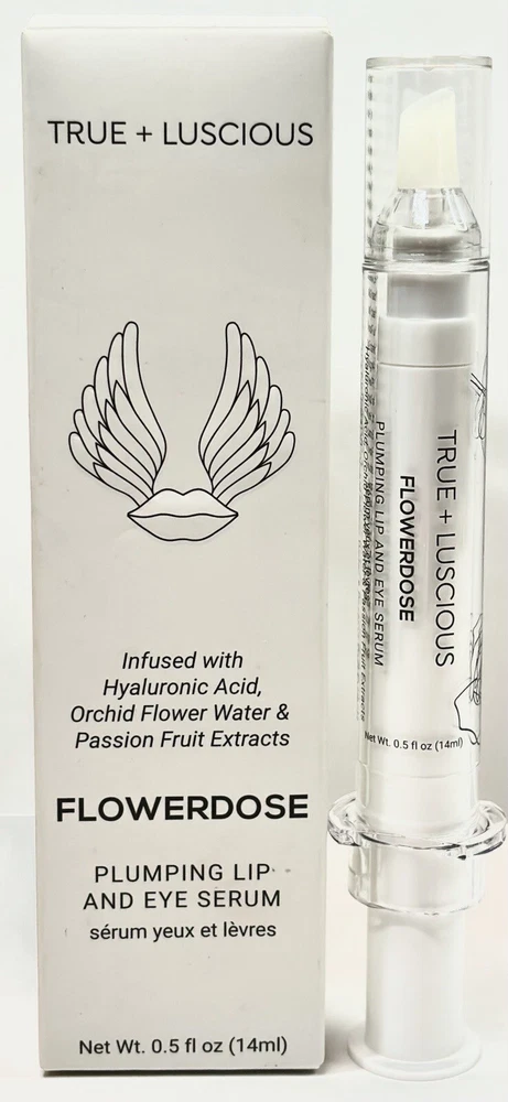 True & Luscious Flowerdose plumping lip and eye serum. Full size. New in box, never used. 0.5fl oz 14ml. An intensely hydrating, anti-aging serum that visibly plumps and revives your lips and under-eye area. This antioxidant-dense formula is infused with moisture-boosting Hyaluronic Acid and potent botanical actives including Orchid Stem Cells, Rose, Passion Fruit, and Plumeria extracts to help visibly reduce fine lines, restore elasticity, heal stressed skin and protect the moisture barrier. This multi-use wonder serum can be used as a protective primer under lipstick/concealer and as an addition to your skincare routine as a hydration accelerator. Developed with pro-makeup artists and tested all skin types, including sensitive skin. INGREDIENTS: Orchis Maculata (Orchid) Flower Water, Propanediol, Water, Butylene Glycol, Passiflora Incarnata (Passion) Fruit Extract, Plumeria Rubra Flower Extract, Helianthus Annuus (Sunflower) Sprout Extract, Malus Domestica Fruit Cell Culture Extract, Caesalpinia Spinosa Fruit Pod Extract/Caesalpinia Fruit Extract, Maltodextrin, Glycerin, Rosa Gallica Flower Extract, Rosa Damascena Flower Oil, Swertia Chirata Extract, Lavandula Angustifolia (Lavender) Flower Extract, Caesalpinia Spinosa Fruit Pod Extract, Hedychium Spicatum Extract, Orchis Maculata Flower Extract, Sodium Carbomer, Hydroxypropyl Methylcellulose, Sodium Hyluronate, Hydroxyethylcellulose, Caprylic/Capric Triglyceride, Panthenol, Ascorbic Acid, Xanthan Gum, Mentha Arvensis Leaf Oil, Phenoxyethanol, Caprylyl Glycol, Ethylhexylglycerin, Hexylene Glycol