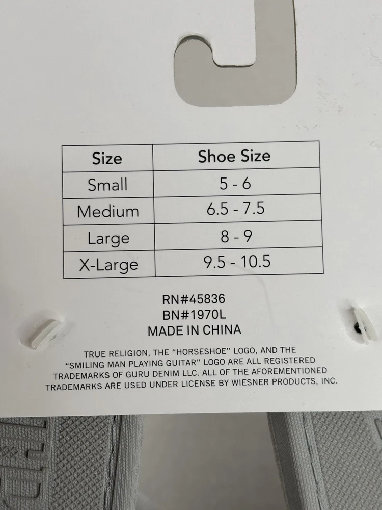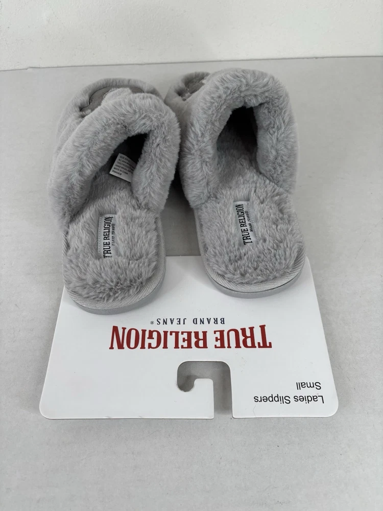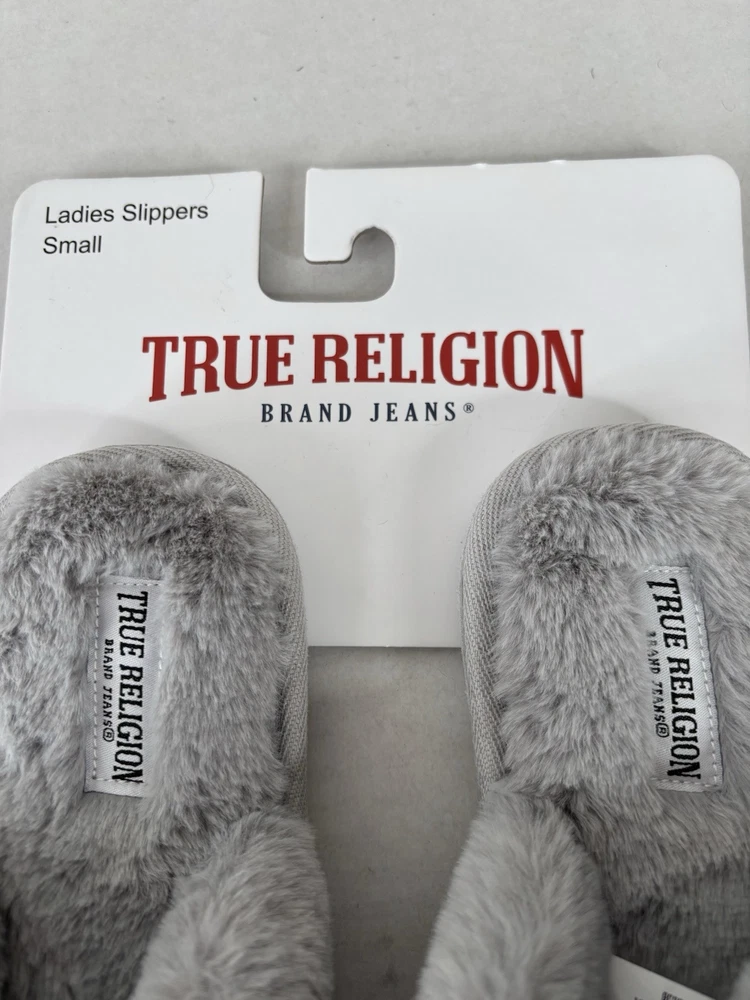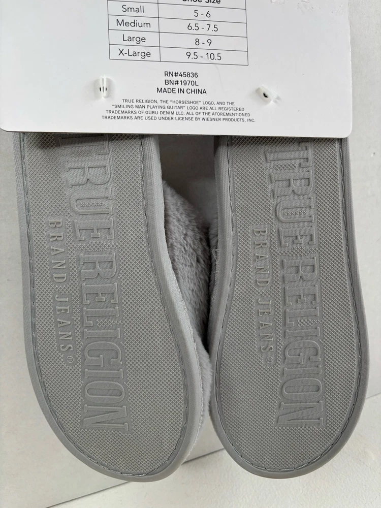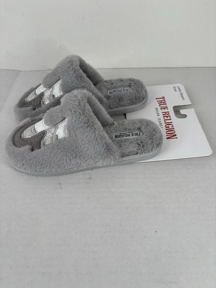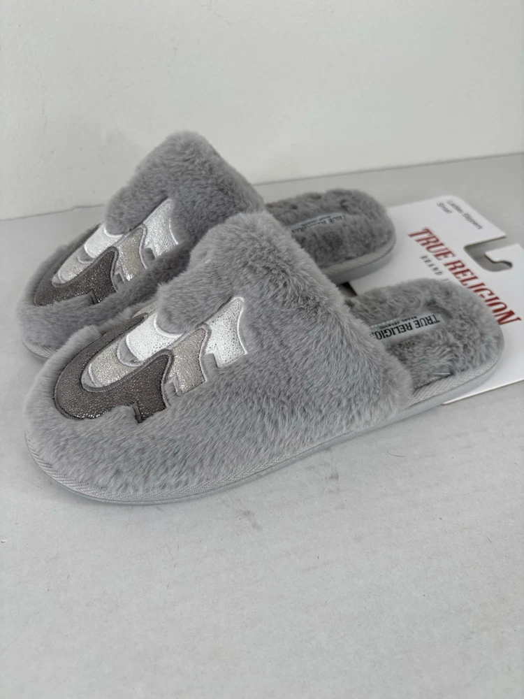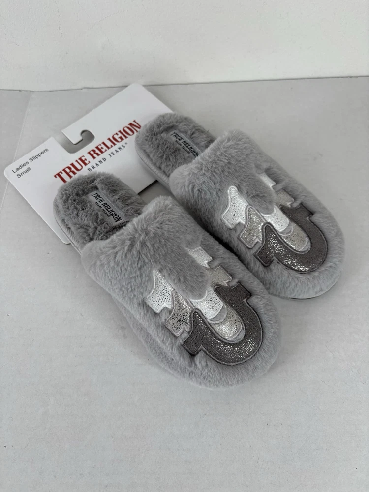 True Religion Women's GRAY Glitter Furry Slippers Small 5-6 Horseshoe Logo