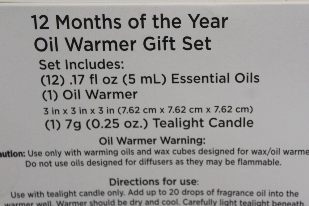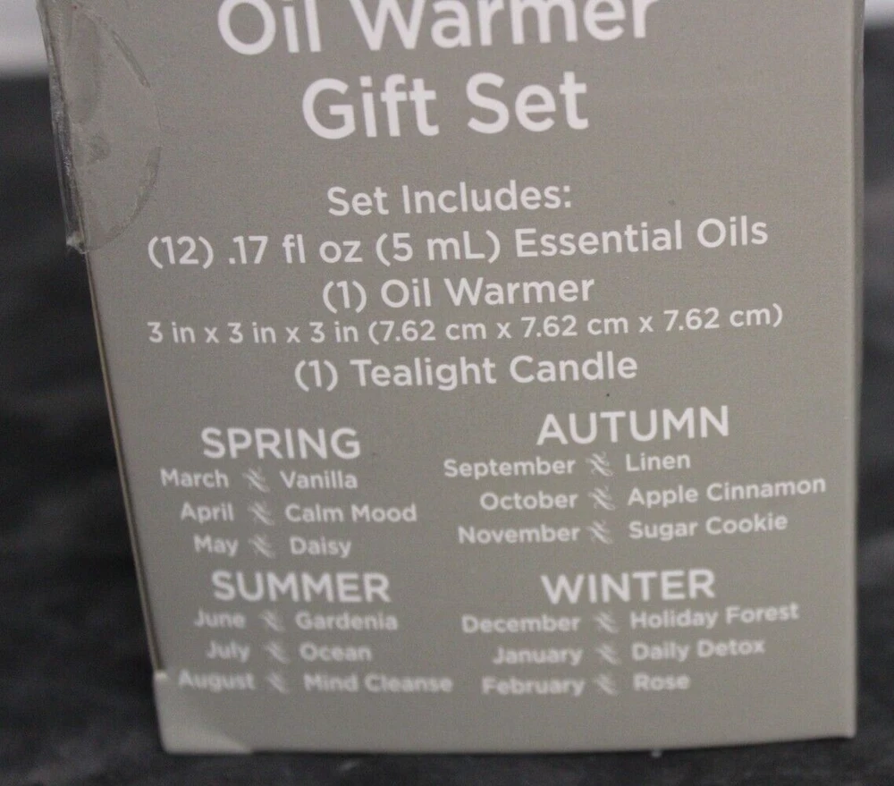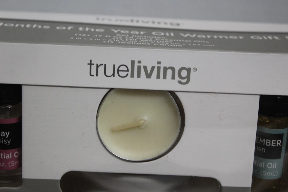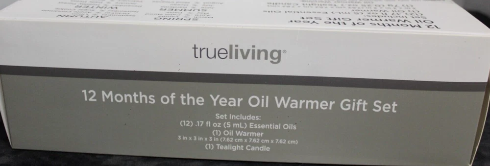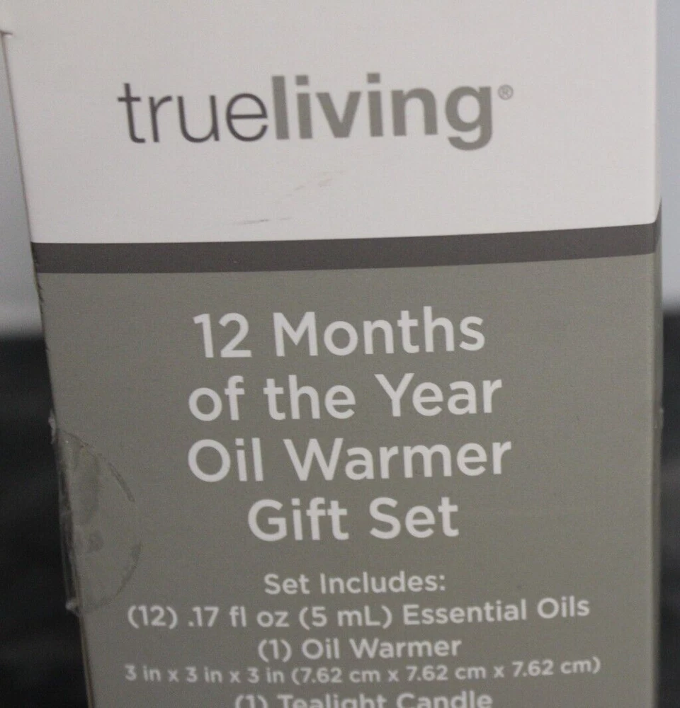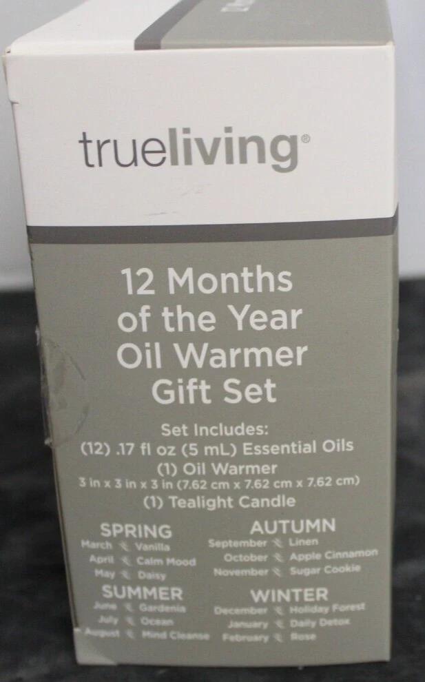 True living 12 Months of the year oil warmer Gift set. Set includes (12) .17 Fl oz Essential oils. (1) Oil Warmer and (1) Tea Light. It comes in its original Sealed box. Scents are vanilla, calm mood, Daisy, gardenia, ocean, mind cleanse, linen, apple cinnamon, sugar cookie, holiday forest, daily detox, and rose. This set would make a great gift for yourself or that special someone. Comes neatly boxed. Please see the pictures as they are part of the description. Thank you for viewing my item. Please check out my store as I have similar items listed and list frequently.