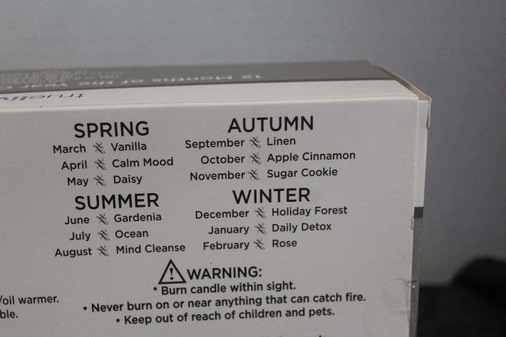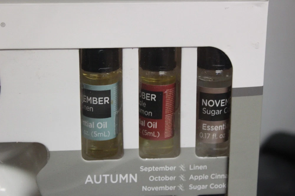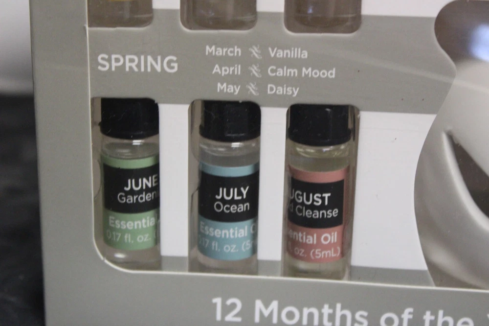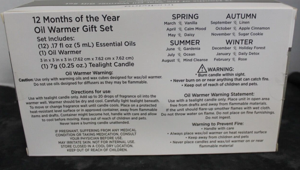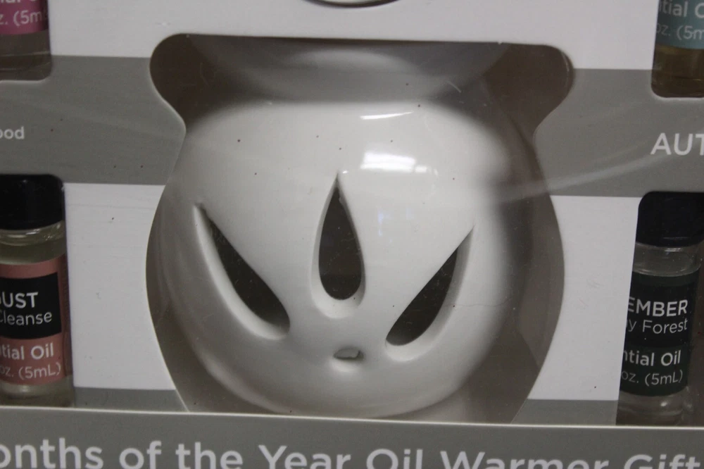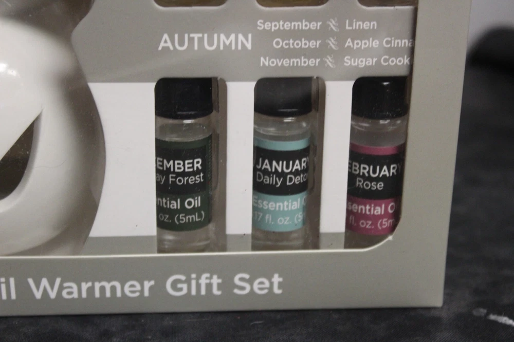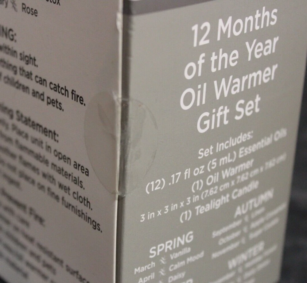 True living 12 Months of the year oil warmer Gift set. Set includes (12) .17 Fl oz Essential oils. (1) Oil Warmer and (1) Tea Light. It comes in its original Sealed box. Scents are vanilla, calm mood, Daisy, gardenia, ocean, mind cleanse, linen, apple cinnamon, sugar cookie, holiday forest, daily detox, and rose. This set would make a great gift for yourself or that special someone. Comes neatly boxed. Please see the pictures as they are part of the description. Thank you for viewing my item. Please check out my store as I have similar items listed and list frequently.