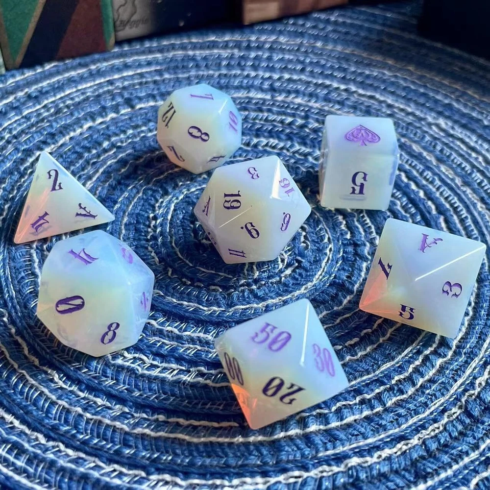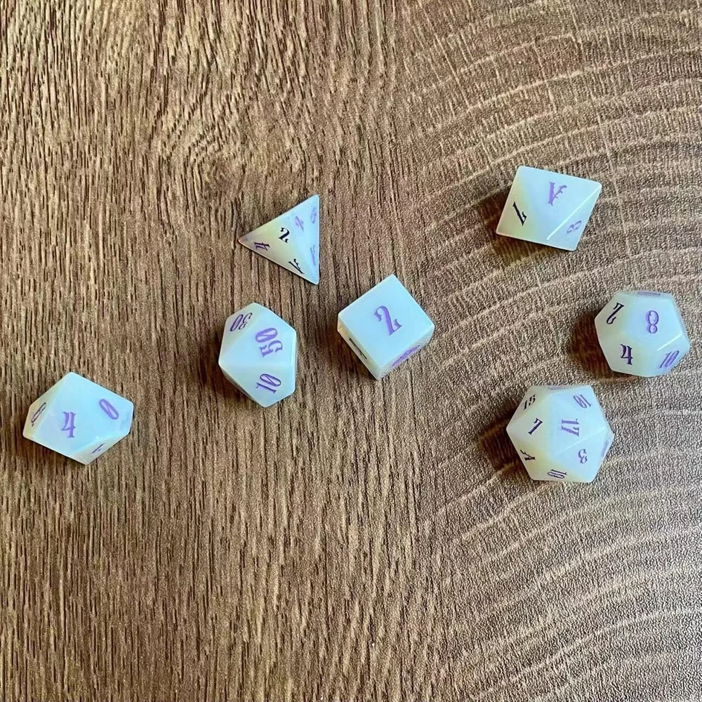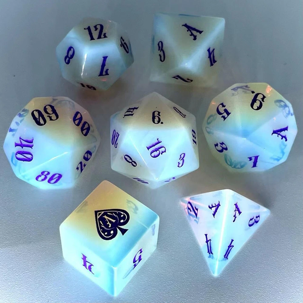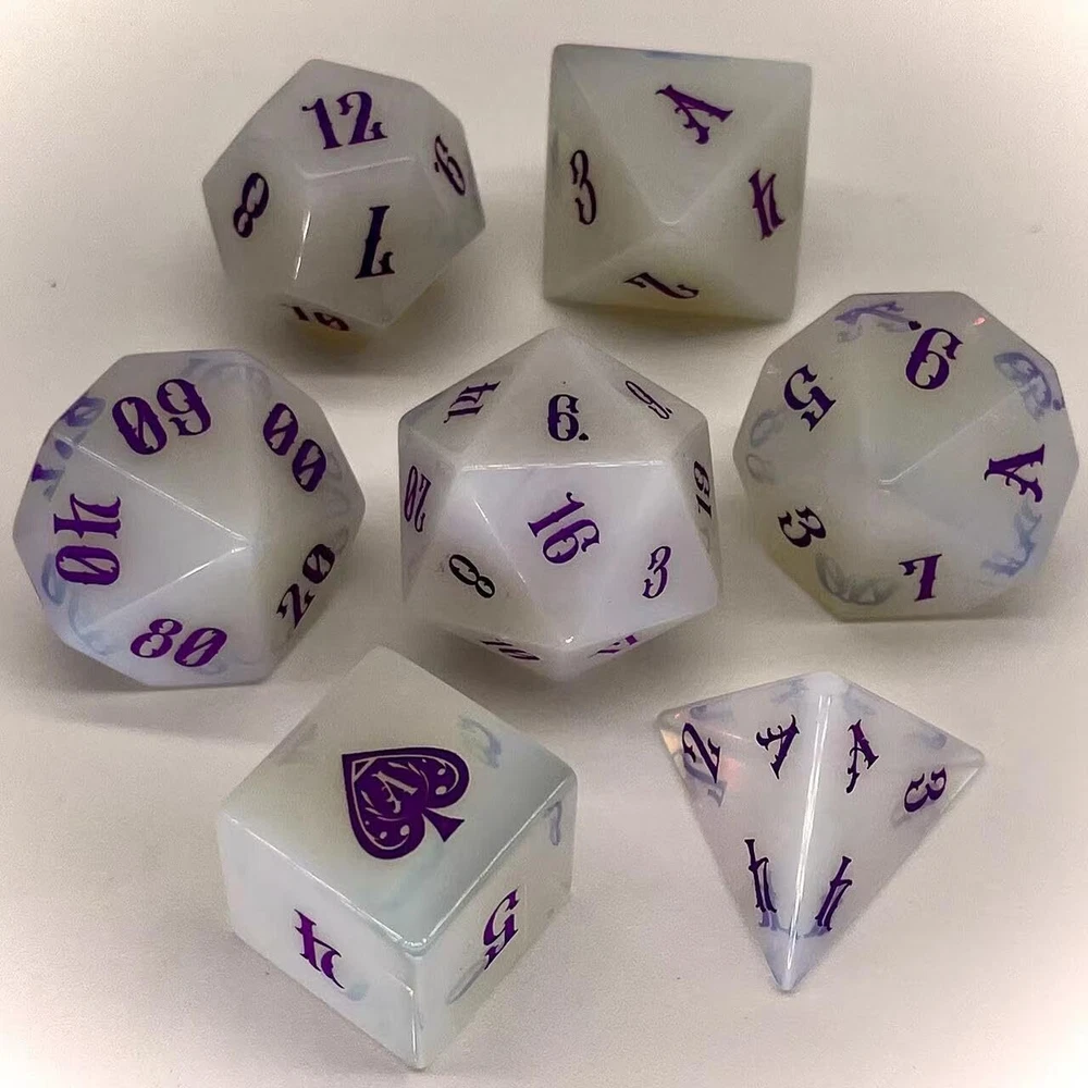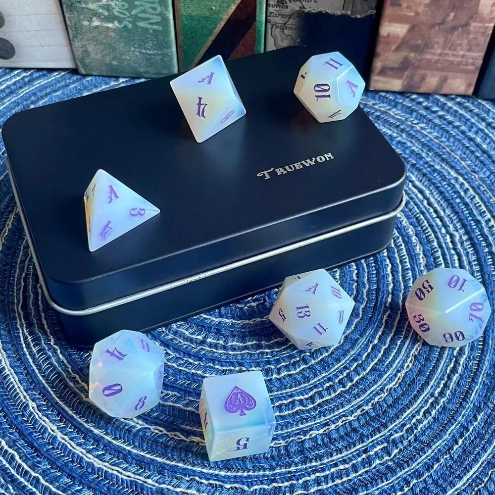 Truewon Opal Dice Set of 7 Handmade Stone Dices for RPG,DND Made Gemstones. (Glass Opal) 2025 version Glass Opal (synthetic gem)dice design:Purple color Art font;The number '1' of D6 is replaced by a ♠ with a special pattern;The number '1' of other dice is replaced by the letter 'A';The numbers 6 and 9 are distinguished by the small ♠ in the lower right corner. Note:The raw material of this dice set is Synthetic Opal Glass.Natural Opal is a very precious gemstone in ancient Greece and Rome. At that time, it was named Upala in Sanskrit, meaning top gemstone. Natural opal is small and expensive, not suitable for making dice.The Synthetic Opal we use is a specially processed glass that has a faint optical effect called Diffraction due to its smoky inclusions. In the production of opal glass, the glass blocks are translucent to opalescent due to the non-uniform size and distribution of the fumed silica particles. This results in uneven colouring of the opal dice we produce as well. Don't worry, we'll distribute the dice again so that each set looks evenly colored. Each set contains 7 dices: D4, D6, D8, D12, D20, 2*D10 (0-9 & 00-90). Updated to 2025 version accessories:1*Black metal box with Truewon logo;1* High-density sponge dice holder inside the box;1*crocodile pattern PU bag that can hold the whole box;1*Collapsible PU dice tray. What are gem dice? Usually we think that the dice made by cutting, grinding and engraving numbers from natural gemstones are called gemstone dice. Some dice made of special glass and synthetic gemstones are also reluctantly considered gemstone dice. (Synthetic gemstones are artificial substitutes for some natural gemstones due to their high price, too small particles, unique chemical properties, etc.) What are the Pros and Cons of gem dice? Pros: They are made of gemstones, have some collectible value, some dice have optical effects, every face distinct from the next, featuring the natural striations, layers, and even trapped detritus that characterizes each stone. Cons: They don't have the springiness of acrylic dice, nor the heaviness of metal dice. They need to be treated more carefully especially D4. Why Choose Truewon's Gem Dice? We were one of the first two sellers to sell Gem Dice on Amazon, with the earliest reviews in 2019. From 2019 to the present, we update some new styles (material, font, pattern, color, etc.) every year, and some of the dice are out of print. We use higher prices to get better gem raw materials, and we carefully select each gem dice to match into a set. Size and Weight Standard TRPG dice size, weight about 66g/2.3oz. Each Package Contains 7 dices: 1*D4, 1*D6, 1*D8, 1*D12, 1*D20, 2*D10 (D10&D00) 1*dice tray 1*dice box 1*PU crocodile pattern bag Note: These dice are made from natural gemstones (synthetic gemstones and special glass dice are shown in the title), the dice shown are for illustration only to demonstrate variation in appearance - color, shape, size, etc. Although we will Multiple matches are made to reduce color differences, but natural streaks and trapped debris make each die unique. Warm Notice Small parts, please keep them away from children. Shipping We offer FREE shipping on all orders! We use a selection of shipping services such as UPS, FedEx, USPS etc. We only ship to the lower 48 states, no APO/FPO addresses or PO Boxes allowed. Local pickups and combined shipping options are not provided at this time. Return You can return a product for up to 30 days from the date you purchased it. Any product you return must be in the same condition you received it and in the original packaging. Please keep the receipt. Payment We accept payment by any of the following methods: PayPal Please pay as soon as possible after winning an auction, as that will allow us to post your item to you sooner! Feedback Customer satisfaction is very important to us. If you have any problem with your order, please contact us and we will do our best to make you satisfied. Contact Us If you have any queries, please contact us via ebay. We usually respond within 24 hours on weekdays. Please visit our eBay store to check out other items for sale! Thank you for shopping at our store.