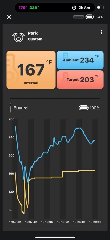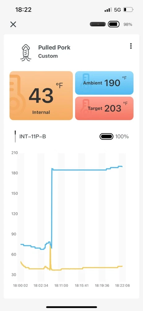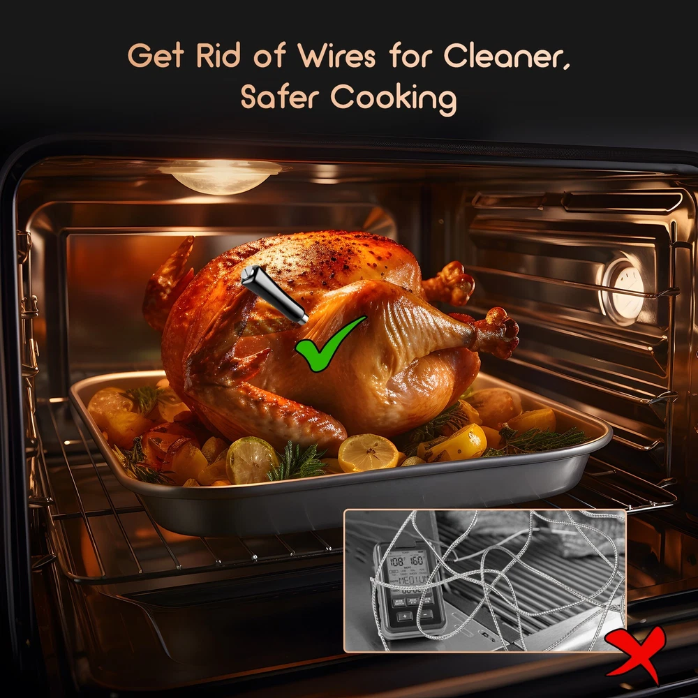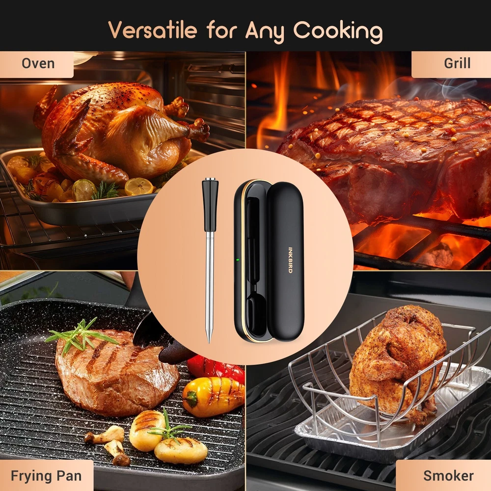 [Charge for 5 mins, Cook for 5 hrs] The grill thermometer dock has a built-in 500mAh lithium battery and can fully charge the probe in just 25 minutes. the wireless thermometer can be used continuously for 25 hours, even in high-temperature environments, making it particularly suitable for overnight cook. This thermometer for cooking is versatile and ideal for use in grills, smokers, ovens, frying pans. (Remember to insert it deep enough and beyond the safe cooking line every time you grill.) [Wireless Meat Probe & Bluetooth 5.1 Connection] This wireless meat thermometer frees you from tangled wires and liberalizes your operation. The advanced Bluetooth 5.1 technology enables you to remotely control and monitor cooking progress at any time over 300ft long distance. Moreover, this meat thermometer can locally store 30 minutes of offline data and automatically synchronize with the App after a Bluetooth connection without lost data. [2-In-1 Temperature Probe] Two temperature sensors at both ends allow the probe to get oven and food temperatures simultaneously. It supports a food temperature range of -10~100℃/14~212℉ and an ambient temperature range of 0~300℃/32~572℉, with a measurement accuracy of ±1℃/±1.8℉. Precise temperature control makes every cut of meat you grill perfectly to your taste, making every meal of daily life a celebration. (Remember to insert it deep enough and beyond the safe cooking line every time you grill.) Package Contents Charging Case*1 Wireless Probe*1 USB-C Charging Cable*1 User Manual*1 You can create, monitor, and optimize the cooking progress through the INKBIRD app, making cooking smarter and simpler. The human-centered App has a preset USDA recommended meat taste list that contains 26 types of meat with custom taste preferences and cooking time and features multiple alarm functions like target temperature alarm, target temperature pre-alarm, high/low-temperature alarm, and count-up/down timer to prevent overcooking and undercooking. [IP67 Waterproof Rating & High-Quality Material ] The food-grade stainless steel probe is rust-resistant and corrosion-resistant and will not affect the original taste of food. The zirconia ceramic handle has high resistance to wear and heat and can withstand a high-temperature environment for a long time. Moreover, the probe has an IP67 high waterproof rating, making it easier to clean and dishwasher safe. ******************************************************************************** *Model: INT-11P-B *Connection Method: BLE 5.1 *Bluetooth Connection Distance: 300ft/91m (without obstacles, for reference only) *Probe Waterproof Rating: IP67 (dishwasher safe) *Sensor Number: 2 sensors of the probe for measuring food temperature and ambient temperature *Probe Measurement Accuracy: ±1℃/±1.8℉ *Temperature Measurement Range: *Food Temperature:-10~100℃/14~212℉ *Ambient Temperature:0~300℃/32~572℉ *Probe Battery Life: 25 hours at high temperature; 7 days at room temperature *Probe Charging Time: 25 minutes for full charge *Probe Response Time: about 3 seconds *Probe Calibration: ±7℃/±12℉ [Charge for 5 mins, Cook for 5 hrs] The grill thermometer dock has a built-in 500mAh lithium battery and can fully charge the probe in just 25 minutes. the wireless thermometer can be used continuously for 25 hours, even in high-temperature environments, making it particularly suitable for overnight cook. This thermometer for cooking is versatile and ideal for use in grills, smokers, ovens, frying pans. (Remember to insert it deep enough and beyond the safe cooking line every time you grill.) *********************************************************************** ****************************************************************** [Wireless Meat Probe & Bluetooth 5.1 Connection] This wireless meat thermometer frees you from tangled wires and liberalizes your operation. The advanced Bluetooth 5.1 technology enables you to remotely control and monitor cooking progress at any time over 300ft long distance. Moreover, this meat thermometer can locally store 30 minutes of offline data and automatically synchronize with the App after a Bluetooth connection without lost data. ======================================================== [2-In-1 Temperature Probe] Two temperature sensors at both ends allow the probe to get oven and food temperatures simultaneously. It supports a food temperature range of -10~100℃/14~212℉ and an ambient temperature range of 0~300℃/32~572℉, with a measurement accuracy of ±1℃/±1.8℉. Precise temperature control makes every cut of meat you grill perfectly to your taste, making every meal of daily life a celebration. (Remember to insert it deep enough and beyond the safe cooking line every time you grill.) Package Contents Charging Case*1 Wireless Probe*1 USB-C Charging Cable*1 User Manual*1 You can create, monitor, and optimize the cooking progress through the INKBIRD app, making cooking smarter and simpler. The human-centered App has a preset USDA recommended meat taste list that contains 26 types of meat with custom taste preferences and cooking time and features multiple alarm functions like target temperature alarm, target temperature pre-alarm, high/low-temperature alarm, and count-up/down timer to prevent overcooking and undercooking. [IP67 Waterproof Rating & High-Quality Material ] The food-grade stainless steel probe is rust-resistant and corrosion-resistant and will not affect the original taste of food. The zirconia ceramic handle has high resistance to wear and heat and can withstand a high-temperature environment for a long time. Moreover, the probe has an IP67 high waterproof rating, making it easier to clean and dishwasher safe. ********************************************************************** ******************************************************************************** Model: INT-11P-B Connection Method: BLE 5.1 Bluetooth Connection Distance: 300ft/91m (without obstacle