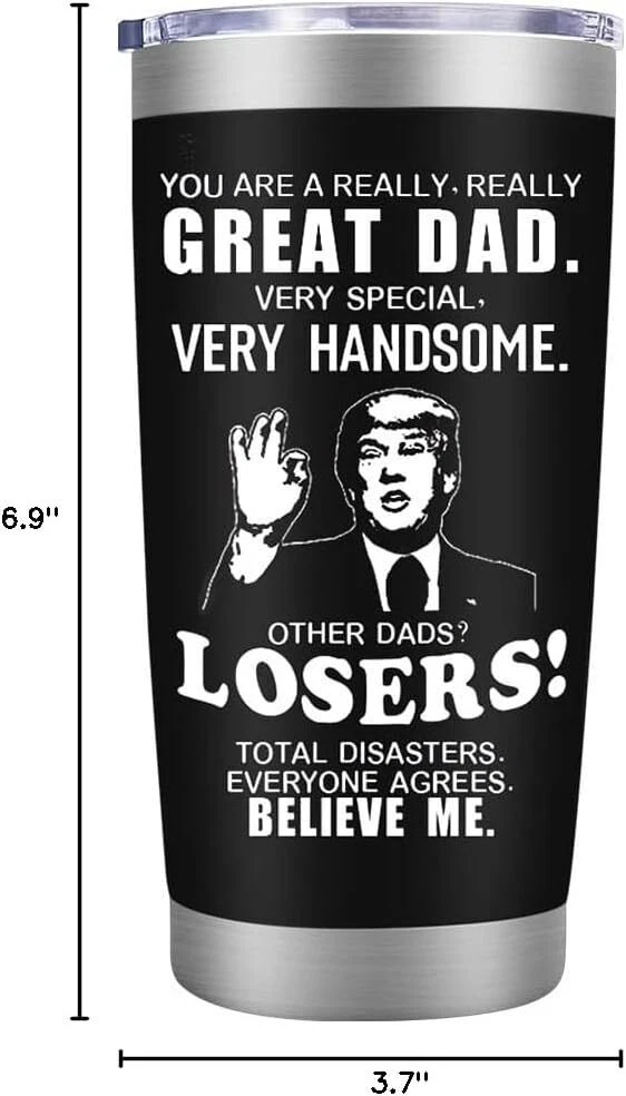 Funny GIFTS:This coffee tumbler 20 oz is very suitable for birthday,anniversary,Valentine's Day,Thanksgiving Day,Father's Day,Christmas and other important holiday or occasion to give to father. GIFT FOR ANY OCCASION:This insulated tumblers with lids is Perfect for office,party,vehicle and home.Imagine your father drinks coffee,water,beer from his new tumbler,He will tell you that you found best dad ever gifts for him HIGH QUALITY:This coffee insulated tumbler 20 oz have Featuring a leakproof cap. and This metal water mugs with lids is made from food-grade stainless steel,double-wall vacuum,durable,unbreakable,rust-resistant,keep your drinks ice cold longer and warm beverages piping hot CUP HOLDER FRIENDLY:The Christmas 20 oz dad tumbler design will fit most car,vehicle,bike,and boat cup holders TRAVEL READY:This 20 oz coffee dad tumbler can carry around your beverages whether out at the mall,soccer game,or park.Stay refreshed and hydrated no matter what adventure life takes you on Product Description UNIQUE FATHERS DAY GIFTS FROM KIDS The best present for dad at Christmas,Fathers Day gifts from son daughter,dad appreciation gifts,dad birthday gifts,Thanksgiving Day,Halloween,no matter the occasion. Delight he with the meaningful message and beauty of this unique present. VACUUMED INSULATED TUMBLER This tumbler body is made from 18/8 food-grade stainless steel,double-wall vacuum,durable,unbreakable,rust-resistant,Perfect for water, coffee, tea, beer, juice, ice cream, cocktails and more. The tumbler can keep drinking hot 5 hours and keep cold 9 hours. Keep your dad stay hydrated during a long activity day. A DAILY REMINDER OF YOUR LOVE There’s no present more necessary than an insulated tumbler. He will take this tumbler everywhere to enjoy he favorite drink.And proudly let people know this sweet gift is a congratulation from hIS child.The tumbler design will fit most car,vehicle,bike,and boat cup holders.