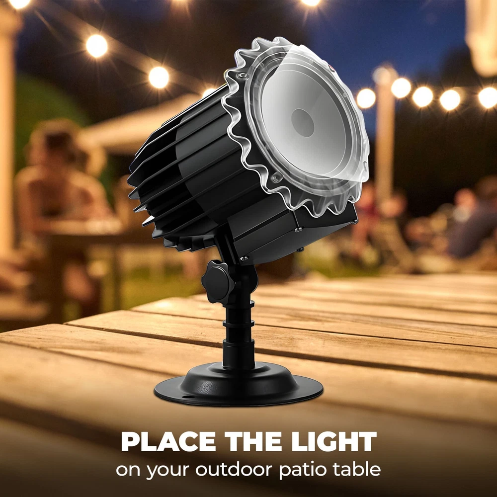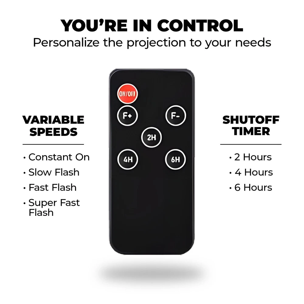 Crystal-Clear Brilliance: Our laser light boasts a remarkable range of 10 to 27 feet, allowing you to customize the projection distance for an optimal viewing experience, no matter the space. All-Weather Versatility: Rain or shine, this laser light is built to last. Its weatherproof design makes it ideal for both indoor and outdoor use. Effortless Setup: Ditch the complicated instructions! This laser light projector boasts plug-and-play simplicity. Place it on a table, flat surface, or soft grass for a dramatic ground-level effect. 5 Function Remote Control: The Remote Keys Include On/Off, Quick Flashing, Slow Flashing, 2-Hour Timer, 4-Hour Timer, and 6-Hour Timer. Package Include: 1 Laser Light Projector; 1 Remote Control; 1 Power Supply Transformer; 1 Ground Stake (outdoor use); 1 Table-Top Mounting Plate (indoor use); 1 Instruction Manual