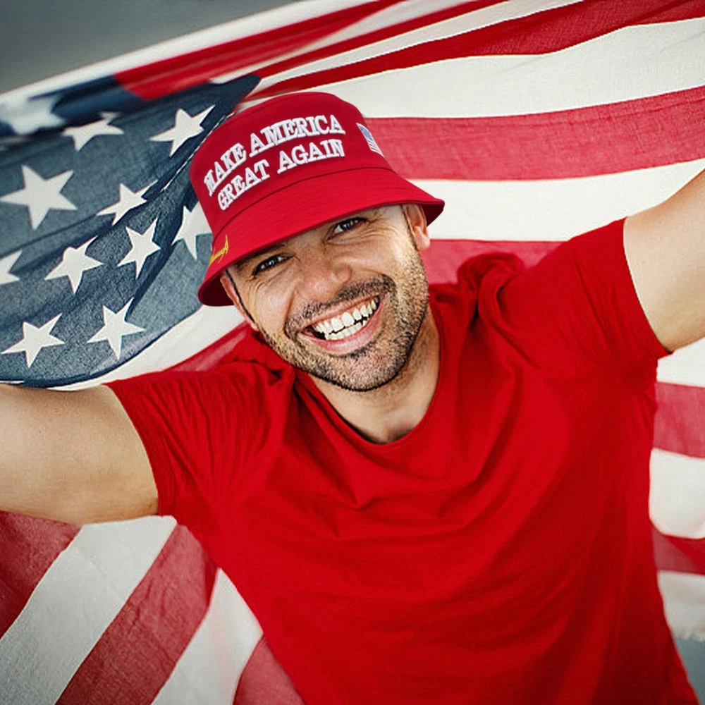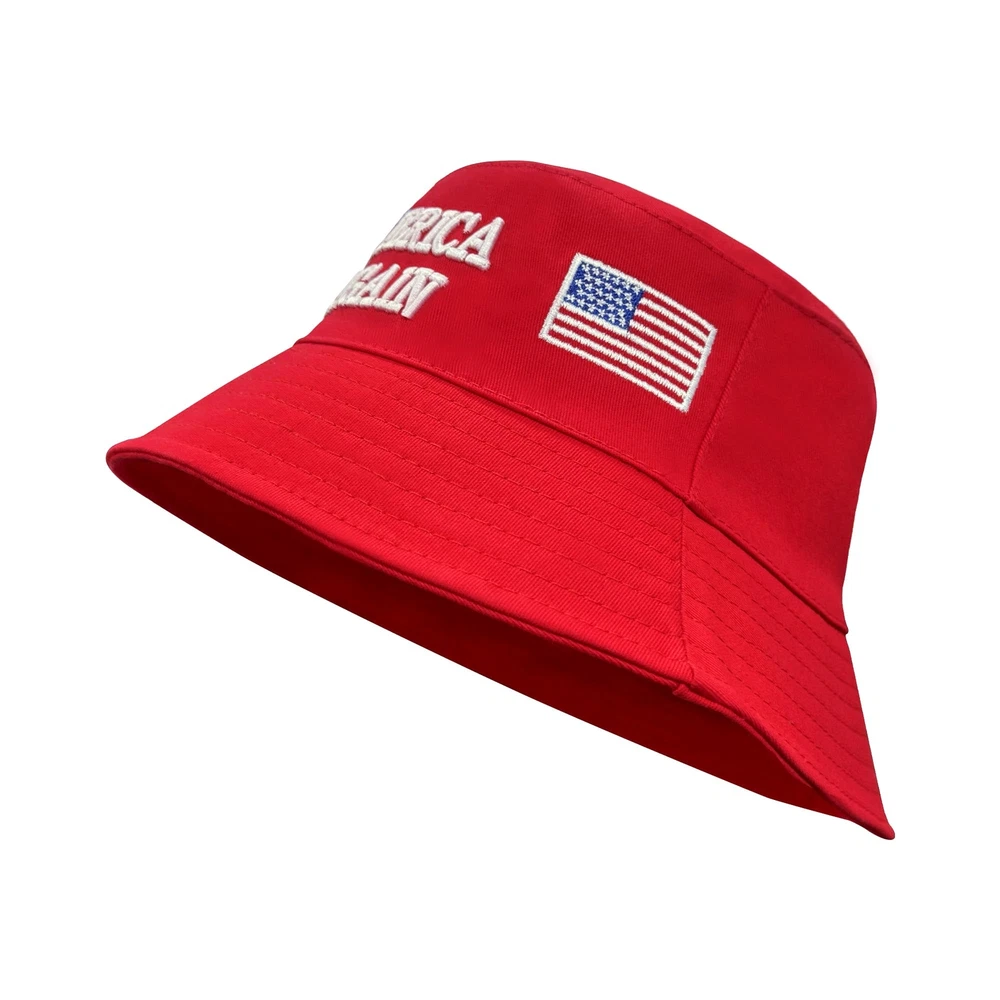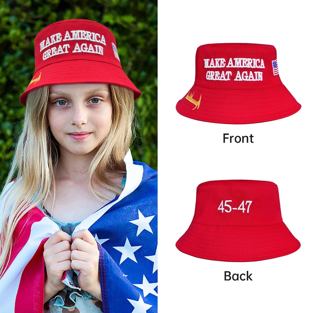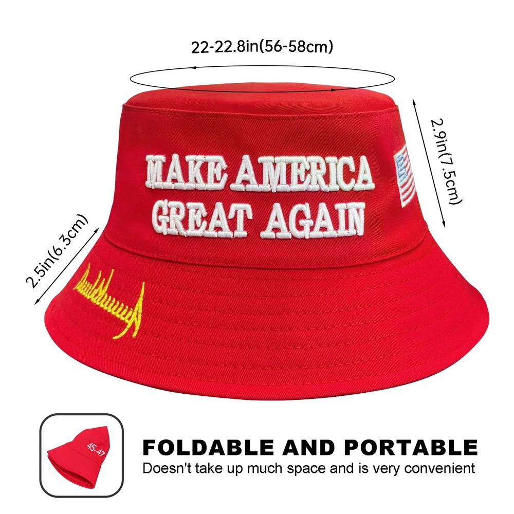 Description Maga Bucket Hat, Donald Trump Bucket Hat 2024 for Women Make America Great Again Flag Embroidery Summer Outdoor Sun Beach Hat MAKE A STATEMENT: Forget all those same old hats and upgrade your hat collection with this "Make America Great Again " 45-47 MAGA hat. If you are looking for an excellent combination of style and ergonomic design, this Trump 2024 bucket hat is the way to go.New Trump 2024 bucket hats for Trump fans.If you wear this Trump hat, you will be the center of attention HASSLE FREE WASHING: Made from high quality 100% cotton fabric, we can assure you that this Trump 2024 45-47 MAGA hat is designed to last. When it’s time for washing, simply toss it in the washing machine and let it do the rest,Simple as that GREAT FIT: We have designed this embroidered MAGA bucket hats for men women to have a perfect fit on any head size. One size fits most adult women and men BREATHABLE HEAD CAPS: This Trump maga sun hat has eyelets on its top for extra breathability. No more sweating, no more uncomfortable hats. The large 3-inch will protect you from sun rays. Prevent wind from blowing on your face as well BEST GIFT: If you are a Donald Trump's fans and looking for a patriotic and inspiring Donald Trump hat to wear on daily basis.We would like to recommend this Make America Great Again hat to you. The inspirational quote Slogan and the beautiful embroidered American flags on each side of the the adjustable MAGA baseball caps will be adored