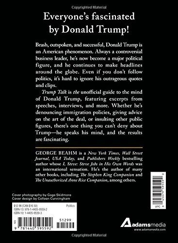 << The item is a Size >> An unbiased collection of Trump's greatest quotes! Brash, outspoken, and successful, Donald Trump is an American phenomenon. Always a controversial business leader, he's now become a major political figure, and he continues to make headlines around the globe. Even if you don't follow politics, it's hard to ignore his outrageous quotes and clips.Trump Talk is the unofficial guide to the mind of Donald Trump, featuring excerpts from speeches, interviews, and more. Whether he's denouncing immigration policies, giving advice on the art of the deal, or insulting other public figures, there's one thing you can't deny about Trump--he speaks his mind, and the results are fascinating. An unbiased collection of Trump's greatest quotes! Brash, outspoken, and successful, Donald Trump is an American phenomenon. Always a controversial business leader, he's now become a major political figure, and he continues to make headlines around the globe. Even if you don't follow politics, it's hard to ignore his outrageous quotes and clips.Trump Talk is the unofficial guide to the mind of Donald Trump, featuring excerpts from speeches, interviews, and more. Whether he's denouncing immigration policies, giving advice on the art of the deal, or insulting other public figures, there's one thing you can't deny about Trump--he speaks his mind, and the results are fascinating. Adams Media Corp