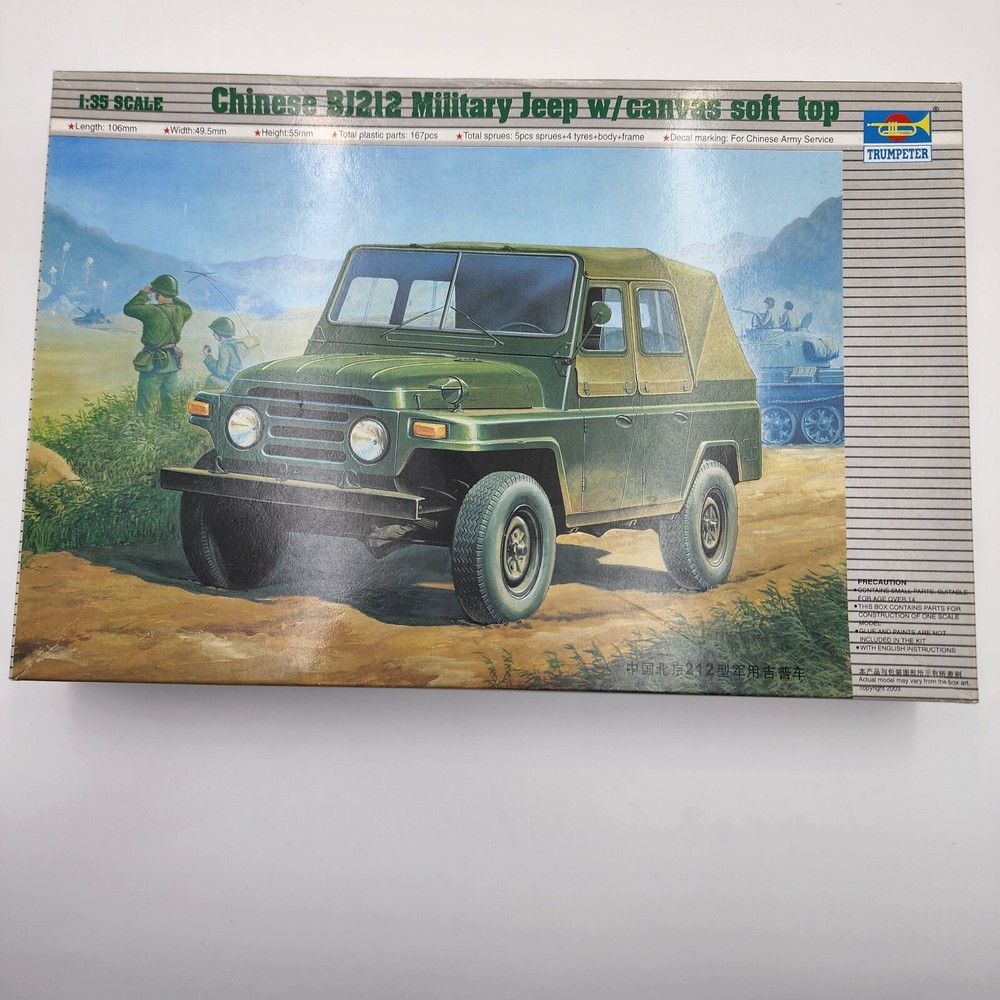 Brand: Trumpeter Model: Chinese BJ212 Military Jeep Scale: 1/35 See photos for further details. Buy with confidence! *Parts pictured are shipped without the kit box, if kit box is pictured it's only to show which kit the part comes from!* *Yes, we combine shipping! Just add the items to your cart and send a request for an invoice!* All orders shipped within 2 business days Please check out my other listings for lots of other model kits! Cars, tanks, airplanes, boats, and more! Visit my store!