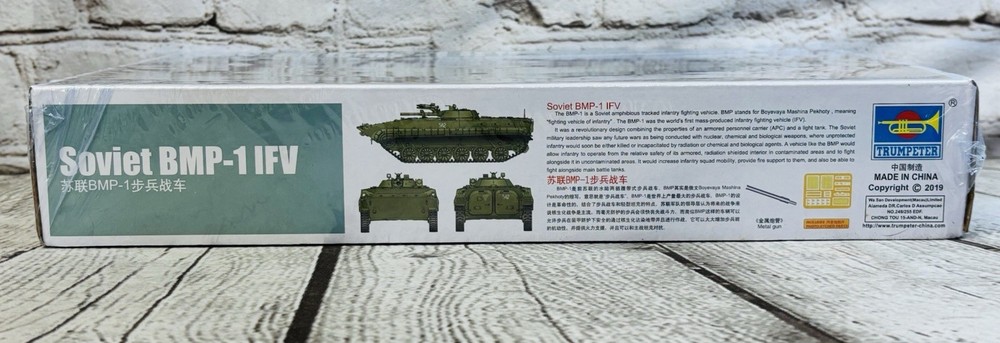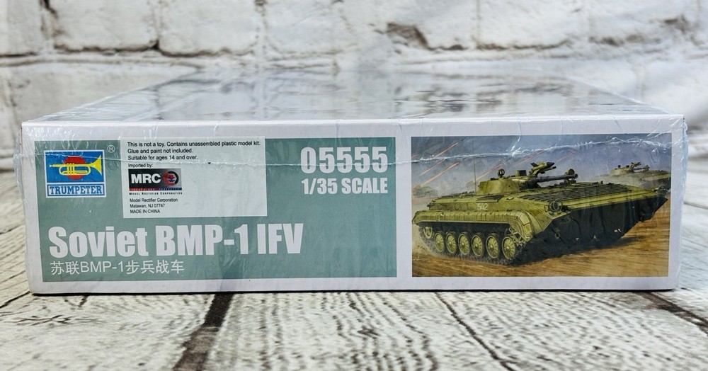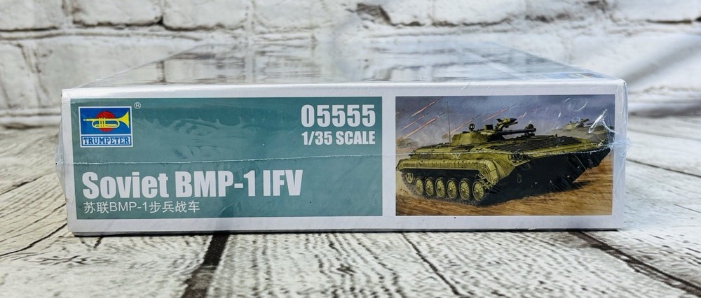 Trumpeter Soviet BMP-1 IFV 1/35 Scale Model Kit #05555 New Sealed This is a brand new and sealed 1/35 scale model kit by Trumpeter featuring the Soviet BMP-1 Infantry Fighting Vehicle (IFV). Highly detailed with over 460 plastic parts, this kit offers an authentic build experience for military modelers. •Brand: Trumpeter •Scale: 1/35 •Model: Soviet BMP-1 IFV •Kit #: 05555 •Includes over 460 parts for a highly detailed build •Length: 191mm – Width: 85mm •Glue and paint not included •Suitable for ages 14 and up •Made in China – Copyright ©2019 Perfect addition to any Cold War or modern military model collection. Ships securely.