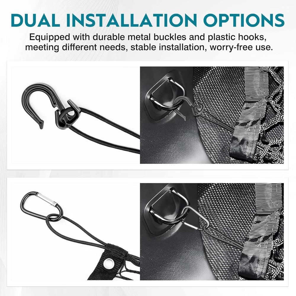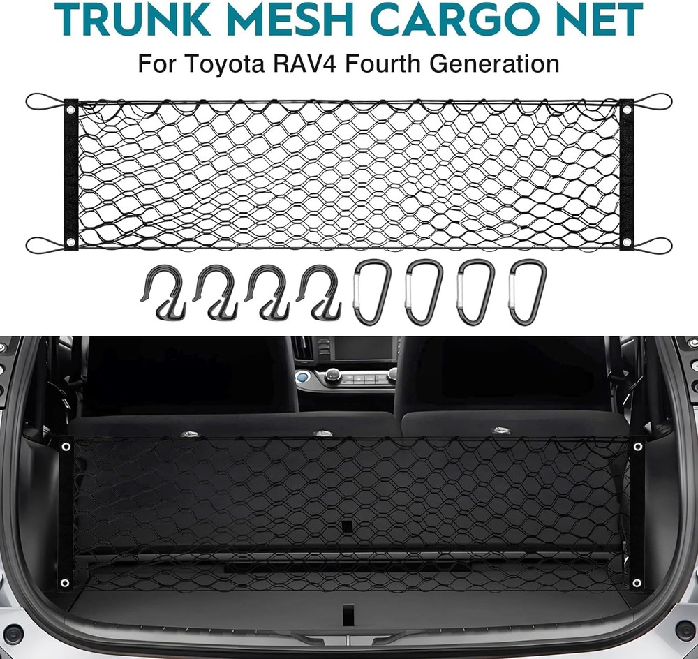 About this item Cargo Net for RAV4: This trunk mesh cargo net is compatible with 2013-2018 RAV4. It perfectly fits your vehicle and is easy to load and unload items. Double Layer Mesh Design: The double layer mesh design of the cargo net offers enhanced security and organization for your belongings. Keep your groceries, sports equipment, and luggage securely in place during travel. Enhanced Organization & Stay in Place: With this cargo net, you can efficiently organize the items in your trunk or back seat. No more items sliding around or spilling during sudden stops or sharp turns. Upgraded Nylon Material: This cargo net is made from premium-quality nylon material, providing exceptional durability and strength for securing items. Say goodbye to flimsy nets that break easily! Complete Kit: The cargo nets come with two types of hooks, allowing you to choose your preferred installation method. Enjoy a hassle-free setup and benefit from a neatly organized car interior. Package Dimensions: 9.37 x 5.24 x 1.77 inches.
