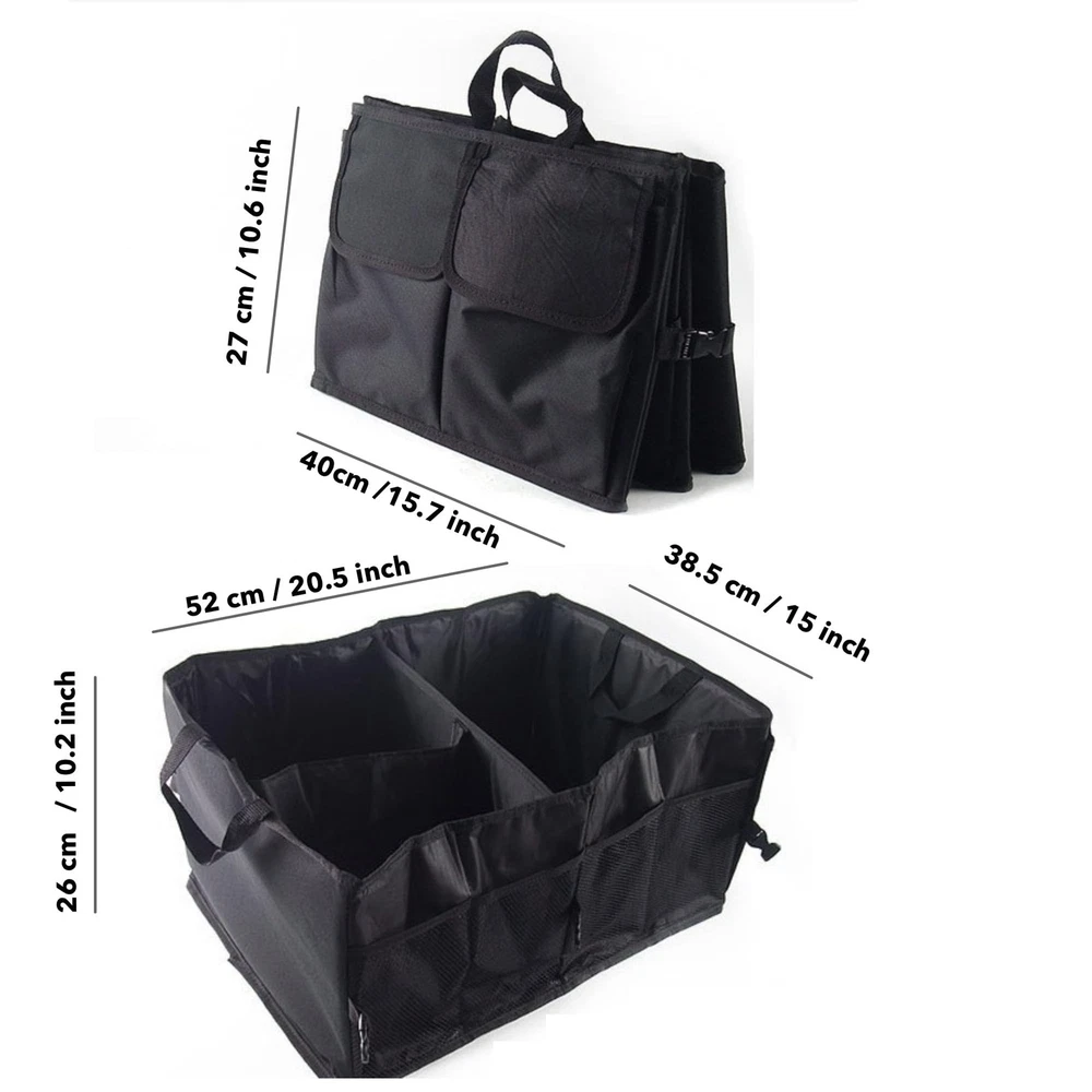 Trunk Organizer for Car - 52L Large Capacity Collapsible Multi Compartments Storage Organizer, Portable Car Storage Box for most Cars/Suv, Black Product Details Specific Uses For Product: Organizer Material: Polyester Special Feature: Foldable Color: Black Brand: GCFTIFF Finish Type: Unfinished Mounting Type: Tabletop Mount Product Dimensions: 15"D x 20.5"W x 10"H Item Weight: 1.1 Pounds Number of Compartments: 3 Specific Uses For Product: Organizer Material: Polyester Special Feature: Foldable Color: Black Brand: GCFTIFF Finish Type: Unfinished Product Dimensions: 15"D x 20.5"W x 10"H Capacity: 52 Liters Number of Items: 1 Manufacturer: GCFTIFF Item Weight: 1.1 pounds Item model number: ZC0402-TO01 Finish: Unfinished Special Features: Foldable Included Components: Trunk Organizer Batteries Included?: No Batteries Required?: No Date First Available: April 2, 2024 Durable Materialsthe foldable car trunk organizer is manufactured with the strongest and most durable oxford polyester fabric with reinforced stitching on areas that receive the most wear which can withstand the heavy use and pass the test of time with repeated use Collapsible Design Car Storage OrganizerIt has 3 compartments and sidewalls with removable divider can be resized to fit large or small vehicle spaces and conveniently folds away when not in use,Large space storage,3 compartments , 4 mesh pockets , a2 closed pockets, can hold more items and quick access items Easy to install & Use It is super easy to install and fold this storage box. You can just fold it to store it when not in use. It takes up less space. Just take this organizer with you when you are going shopping or having a picnic. When the surface is dirty, it is so easy to clean the surface with a damp cloth Versatile Use Trunk Organizer For Car is the best solution to keep your car tidy. It fits all vehicles ( truck, suv, van, jeep, car etc.)great for carrying and organizing groceries, toys, sporting equipment, tools etc in your trunk, solve the chaotic scene of the trunk with this organizer.the trunk organizers are not limited to just car use; they can also be employed in various settings, such as at home or in the office. Waterproof & Non-SlipIt is water resistant and abrasion resistant, easy to install and cleanThe non-slip bases of these organizers ensure that they stay in place while driving, reducing the risk of spills or items rolling around in the trunkNow, Try it , Gone are the days of a messy car.