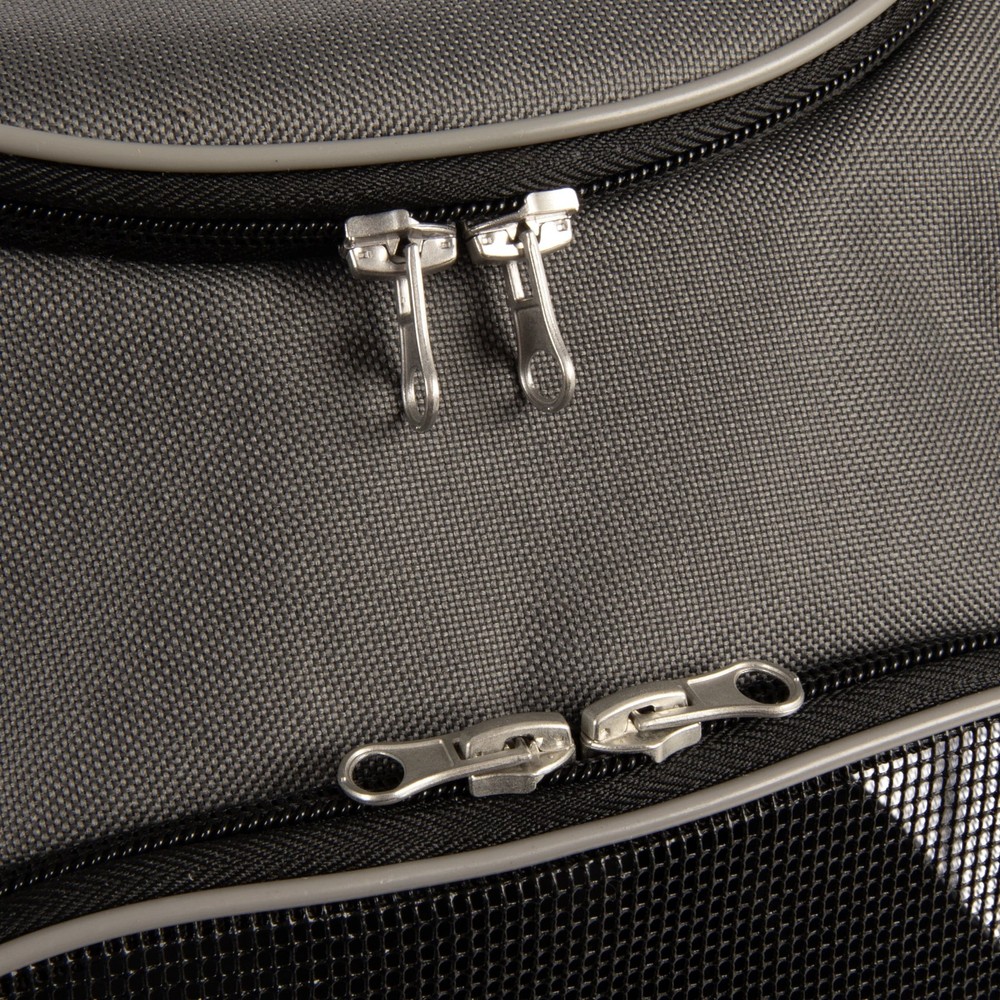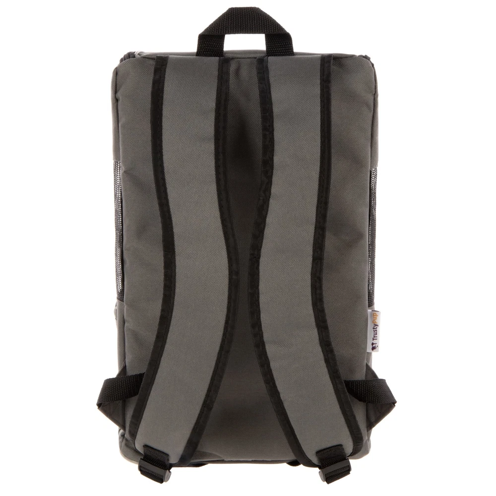 TrustyPup® Medium Gray Cat and Dog Travel Pet Backpack will have you transporting your pet in style and comfort. A removable, washable plush liner cradles your pet, while the stability board provides a stable surface to stand on. Coated mesh panels supply ample airflow and give your pet a lookout window while out and about. Locking zippers prevents your pet from pawing the zipper open. A zippered storage pocket can conveniently carry pet travel accessories. Great for hikes, running errands, travel, and going about town. Ideal for smaller cats and dogs weighing 16 lb (7 kg) or less. Medium Backpack: Meant for standing pets that measure up to 9.5" (24 cm) from the floor to the top of their back and 16" (42 cm) from base of tail to front of chest, and weighing at most 16 lbs (7 kg); round up weight and measurements, do not exceed capacity limits for pet's safety Convenient Storage: Zippered storage pocket holds pet and pet parent accessories such as a phone, keys, collapsible bowls, treats, waste bags, leash, important pet travel documents, etc. Optimal Airflow: Coated mesh panels stand up to claws and offer ventilation for your pet as well as a convenient window to look in on your pet without opening the carrier Comfort: Luxurious faux lambswool liner offers a cushy surface for your pet to lounge on; wide adjustable backpack straps for pet parent comfort Features: Locking zippers help to ensure pet does not claw open the carrier; stability board gives soft-sided carrier a solid base for pets