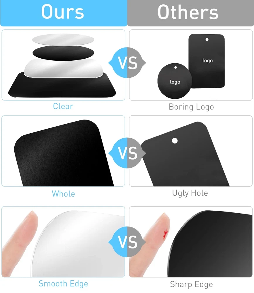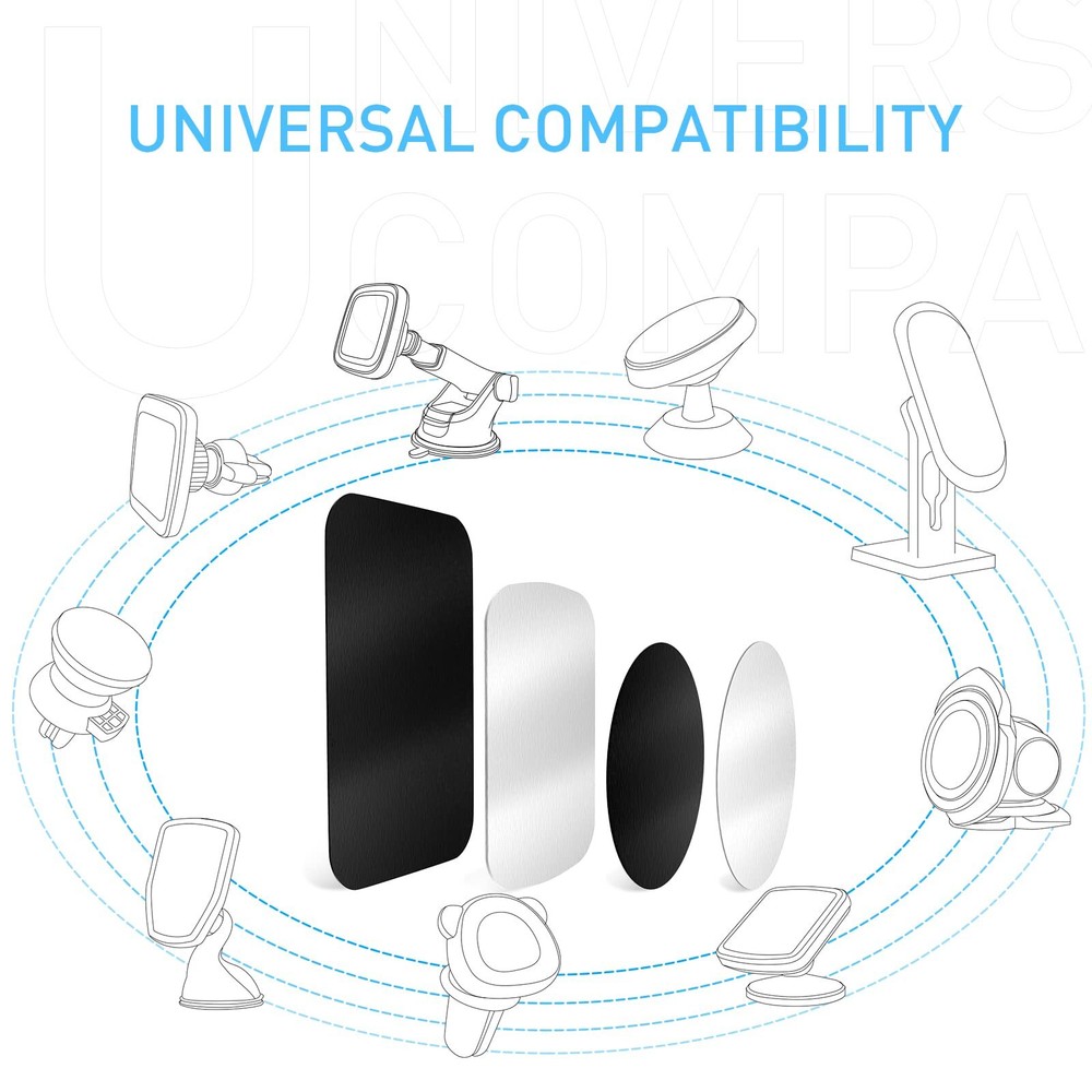 【Statement:】These plates don't have any magnet. They are just replacements compatible with magnetic car mounts. 【Package:】4 pack. Black X2(1 rectangle and 1 round). Silver X2(1 rectangle and 1 round). 【Dimension:】The black rectangle is 2.56” X 1.77”; The silver rectangle is 1.97” X 1.5”; The round ones’ diameter is 1.57”. 【Compatibility:】Fit for all kinds of magnetic car mount holders. 【Usages:】Stick to the back of your phone or put it between your phone and the case. Strong adhesive has been pre-applied on one side of the metal plate.