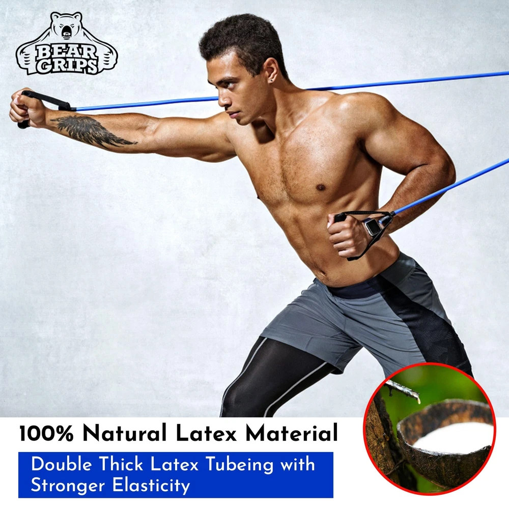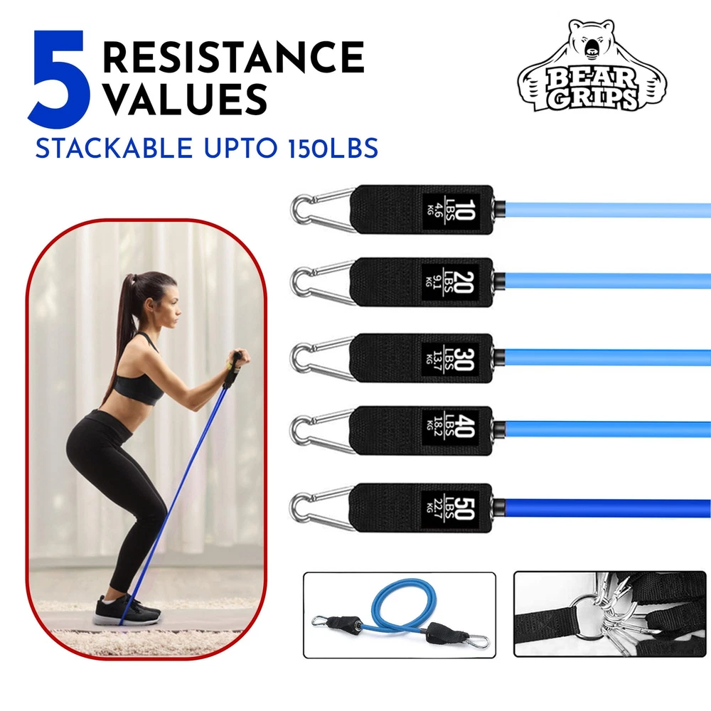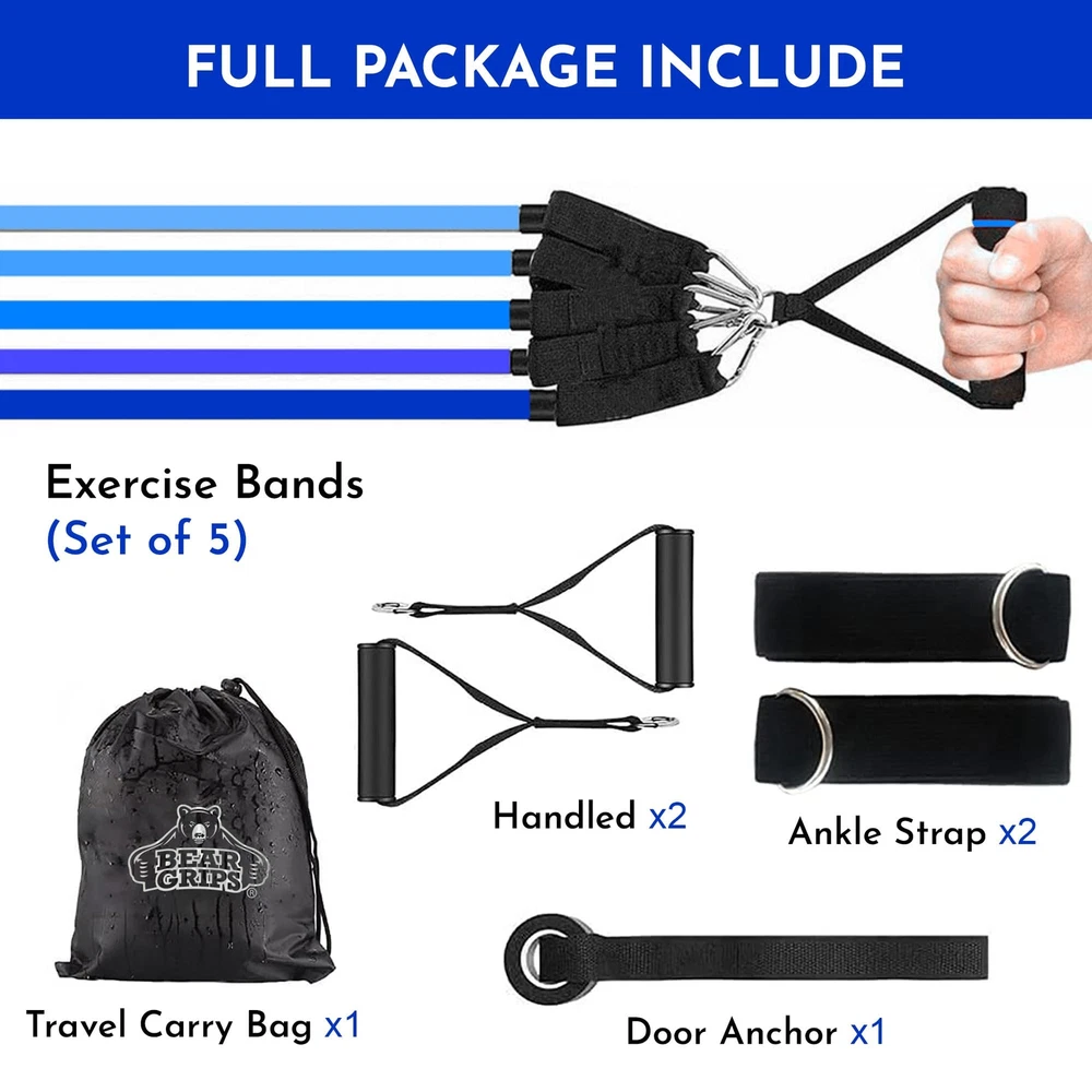 TubeBandSet Blue 11pc 𝐀𝐃𝐉𝐔𝐒𝐓𝐀𝐁𝐋𝐄 𝐓𝐔𝐁𝐄 π‘π„π’πˆπ’π“π€ππ‚π„ 𝐁𝐀𝐍𝐃𝐒: Improve your fitness with a core power pilates bar. This home workout equipment leg bands feature uniquely color-coded 5 resistance bands with handles that offer a dynamic range of resistances. From 10 lbs to 50 lbs, these long resistance bands incrementally step up by 10 lbs, reaching a maximum of 150 lbs of combined resistance. The heavy resistance bands for working out enable you to adjust your exercise intensity 𝐍𝐎𝐍-π“πŽπ—πˆπ‚ πŒπ€π“π„π‘πˆπ€π‹π’: Our workout equipment home gym fitness bands are made with premium raw all-natural latex which is non-toxic, skin-friendly, and durable. The workout bands resistance for women and men's remarkable durability is complemented by their non-toxic nature, prioritizing safety and comfort. Our stretch bands for exercise are important for people with sensitive skin, as these tube bands are crafted to prevent any irritation or discomfort π‚πŽπŒππ‘π„π‡π„ππ’πˆπ•π„ 𝐒𝐄𝐓: This 48" long 3-piece exercise tubes with handles set is designed to provide a comprehensive workout solution. Our abs workout equipment includes 5 color-coded stretching bands, 2 cushioned handles, 2 ankle straps, a door anchor, and a carrying bag for your convenience. With this arm exercise equipment, you will have everything you need for a workout, no matter where you are - at home, outdoors, or on the road π“πŽπ“π€π‹ ππŽπƒπ˜ π“π‘π€ππ’π…πŽπ‘πŒπ€π“πˆπŽπ: Transform your exercise regimen with our exercise bands resistance bands set that can take your workout to the next level. These booty band workout sets challenge various muscle groups, providing a complete experience that can help you achieve a stronger, fitter, and more energetic body. From sculpted arms and back to toned legs and a confident core, these elastic bands for exercise will unlock your body's full potential πˆπŒππ‘πŽπ•π„ ππŽπ’π“π”π‘π„ 𝐀𝐍𝐃 𝐒𝐓𝐑𝐄𝐍𝐆𝐓𝐇: Our home excersing equipment elastic band offer holistic benefits that go beyond muscle building and toning. Not only that these exercise equipment for home workouts also actively aid in improving your posture, relieving pressure, and strengthening your core. By taking this comprehensive approach to fitness, you're not only exercising but also nurturing your body with these heavy resistance bands for working out 𝐏𝐄𝐑𝐅𝐄𝐂𝐓 π…πŽπ‘ 𝐀𝐋𝐋 π…πˆπ“ππ„π’π’ 𝐋𝐄𝐕𝐄𝐋: Whether you are a fitness enthusiast or a beginner, these arm bands for workout at home gym strike the perfect balance. Our exercise workout resistance band set can be adjusted to different fitness levels. By incorporating exercises that enhance muscle strength, flexibility, and overall fitness, these exercise bands resistance with handles promote unity in the quest for a healthier lifestyle 𝐒𝐂𝐔𝐋𝐏𝐓𝐄𝐃 𝐀𝐍𝐃 𝐒𝐓𝐑𝐄𝐍𝐆𝐓𝐇𝐄𝐍𝐄𝐃 ππ‡π˜π’πˆππ”π„: These fitness equipment gym accessories for men and women are engineered to sculpt and strengthen your physique. These shoulder brace stretching strap strength bands engage multiple muscle groups like shoulders, arms, abs, butt, legs, chest, etc. You may use our chest expander bicep bands for boot camps, yoga, pilates, rehab, at-home workouts, outdoor fitness, strength training, and more π‹πˆπ†π‡π“π–π„πˆπ†π‡π“ 𝐀𝐍𝐃 ππŽπ‘π“π€ππ‹π„: exercise band with handles are very lightweight and compact which ensures you can carry the work out bands for exercise anywhere - Whether it's a quick session at home, a rejuvenating outdoor workout, or a sweat-inducing fitness class, these resistance bands for working out women are your constant companion; Can fit perfectly on your carry bag, luggage, or backpack, and won't take up much space π•π„π‘π’π€π“πˆπ‹πˆπ“π˜ π‘π„πƒπ„π…πˆππ„πƒ: Our strength training equipment stretch band effectively engages multiple muscle groups such as arms, abs, legs, and more; making our resistant bands with handle an ideal tool for your fitness. If you are starting on yoga, pilates, intense strength training, or pursuing outdoor fitness activities, our home gym system excersing bands cater to it all. These tube resistance bands effortlessly complement various exercise regimes π„π…π…πŽπ‘π“π‹π„π’π’ 𝐔𝐒𝐀𝐆𝐄: The stretch out strap elastic workout bands are equipped with a stainless steel hook on both ends. Look at the hook with the handle and you are ready to perform. Our exercise resistance tubes. So, maximize your precious workout time with these resistance band with handles. A Carrying bag is included in the set or storage or organization.
