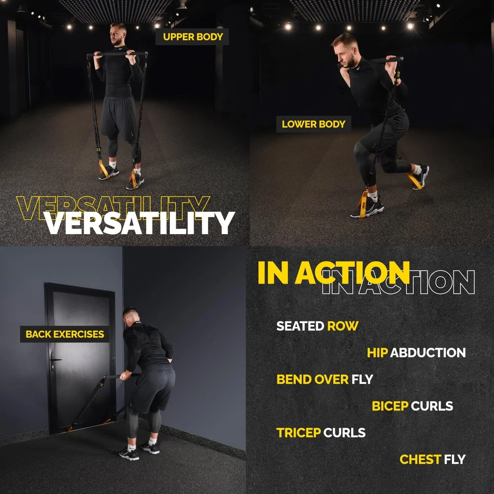 Unleash the potential of your at-home fitness routine with our unparalleled crossover symmetry bands for working out. With our resistance band set, you're not just receiving any ordinary set of therapy bands. Our work out bands for exercise are meticulously designed for those who seek to elevate their workouts, catering to both beginners and avid fitness enthusiasts. Our excersing bands redefine versatility. Crafted for optimal performance, these bands can effortlessly integrate into your resistant bands workout or be the cornerstone of a challenging resistant band workout. One of the standout features of our set is its capacity to offer up to 180lb of resistance when combining all tubes, ensuring an intensive workout every time. Dive into a range of popular exercises that this set has been perfected for: Upper Body: Bicep Curl, Triceps Pushdown, Overhead Press, Wide and Close Grip Pulls, Seated Row, Bent Over Fly, Chest Fly, Chest Press, Unilateral Fly Lower Body: Forward Lunges, Squat, Hip Abduction Core: Kneeling Crunch, Woodchopper, Upper Oblique Crunch, Lower Oblique Crunch The weight bands mimmik the resistance of traditional weights, these strength bands, provide a dynamic workout experience. Our workout resistance bands are tailored for varying exercises, from arm bands for workout focusing on the upper body to tension bands for exercise targeting the lower body. The heavy resistance bands for working out redefine high-intensity workouts. When combined with our training bands, athletes at all levels can expect an unbeatable workout challenge. The elastic exercise bands emphasize stretching and flexibility, ensuring warmed-up, ready muscles. If you're transitioning from traditional weights, our weight bands for exercise resistance men replicate the weight training experience with precision. In summary, from novices to seasoned pros, our bands set ensures every fitness goal is met with unmatched resistance and versatility. ποΈ Resistance Bands Set: Includes 2x20lb, 2x30lb, 2x40lb tubes, enabling up to 180lb resistance. Ideal for a range of workouts and adaptable for strength, flexibility, and rehabilitation exercises making these the perfect elastic bands for exercise π Heavy Duty Protection: Our resistance bands with handles feature a robust nylon protection sleeve, reducing wear and ensuring a longer lifespan. Whether you're into home workout or professional gym sessions, our bands endure the toughest routines π Comprehensive Package: Resistance Band Bar, Exercise bands with handles, 2 foot strap attachments, 2 door anchors, 2 ankle straps. Perfect for workout bands resistance for men as an all-in-one resistance band set, catering to both upper body and lower body exercises πͺ Versatile Workout Options: fitness bands are ideal for Bicep Curls, Tricep Pushdowns, Chest Press, Seated Rows, Forward Lunges, Squats, Kneeling Crunch, Woodchopper and more. Our bands offer a full-body workout experience π‘ At Home Fitness Essential: Whether you're focused on work from home fitness, physical therapy, or strength training, our bands are a versatile addition to your exercise equipment collection making it the perfect at home workout equipment set