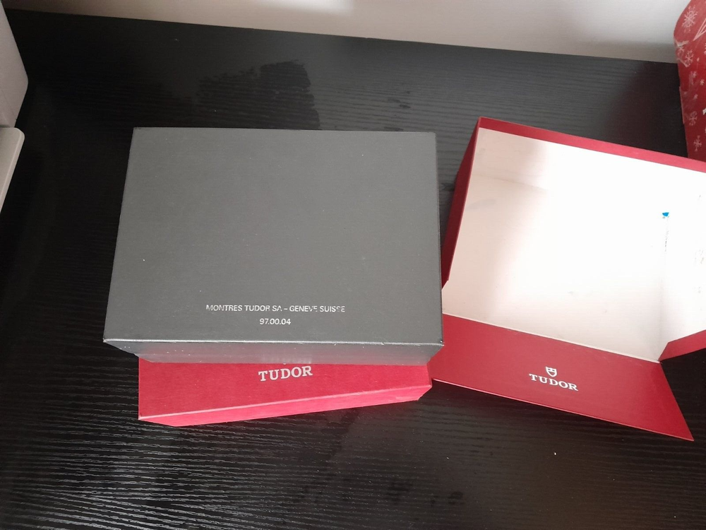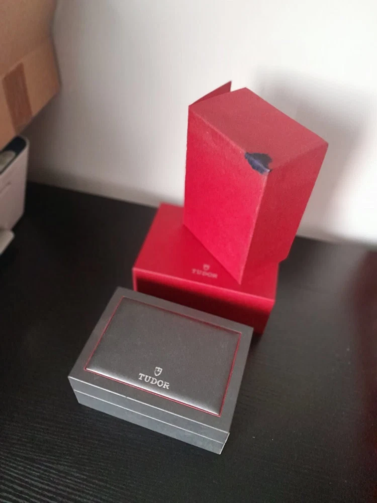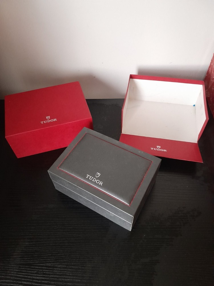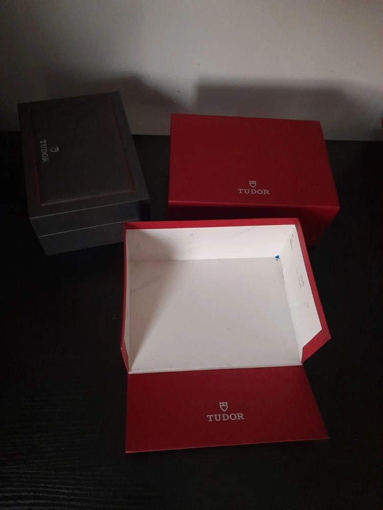 Original grey Tudor box complete with outer red box. The box design is likely from the 2000s. Good condition. There is a blue ink stain on the red paper box. Please see photos. Thanks.