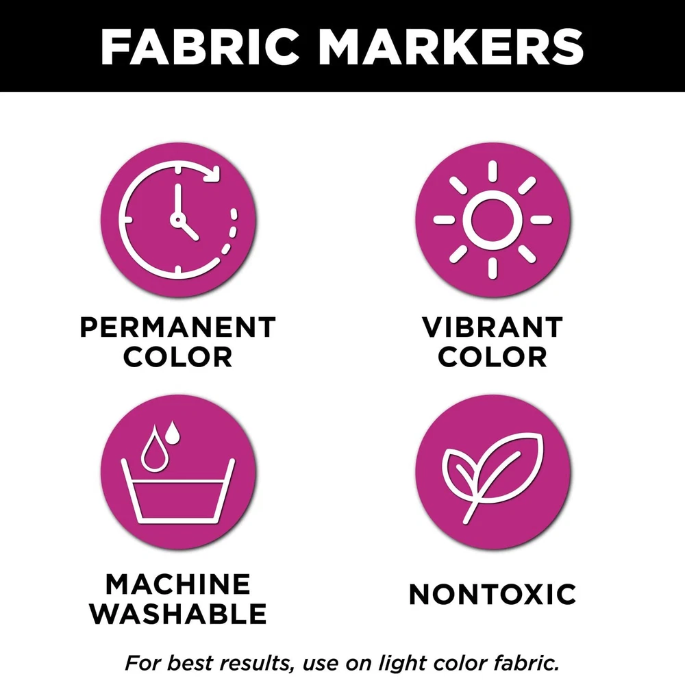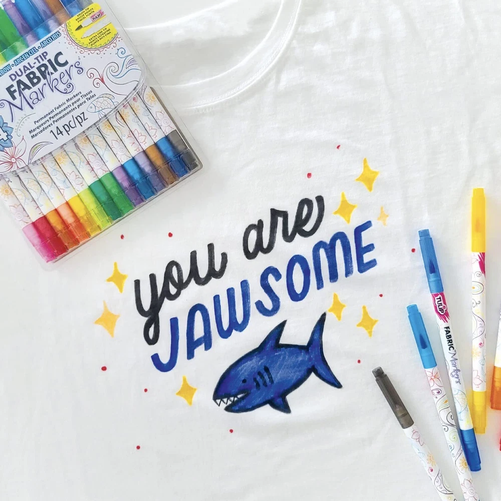 Whether you're drawing lines or filling in larger areas, these dual tip Tulip® Fabric Markers® are the perfect tool. Brush tips are great for coloring in and stenciling, and fine tips let you add colorful details and doodles. These Tulip® Fabric Markers are dual tip (brush and extra-fine tips), includes 14 colors, are permanent ink, nontoxic and washable. No heat setting required. These colorful Tulip® Fabric Markers® come in a pack of 14 colors. Inks Can Withstand Multiple Washings Best On White And Light-Colored Fabrics Fine Tip Works Well For Stippling Effect Country Of Origin: China