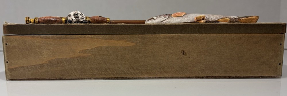 The Tumbler Gone Fishing Real Wood Box is a small, rustic trinket box perfect for storing fishing-themed keepsakes. Made of wood, this multicolor box features a fishing-themed design, ideal for any outdoor enthusiast. The real wood construction adds a unique touch to this decorative collectible, making it a great addition to any fishing collection.