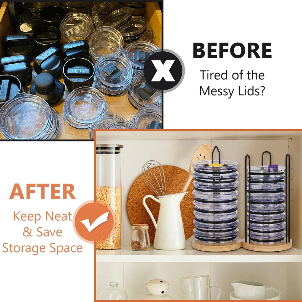 Tumbler Lid Organizer, 2 IN 1 Stacking Tumbler Lid Holder Vertical Storage for Up to 20 Lids, Space-Saving Design Cup Lid Organizer Storage Rack for Kitchen Cabinet and Countertop Organization 2 IN 1 Tumbler Lid Stacker: Innovatively Designed as a 2 in 1 cup lid holder storage, capable of accommodating up to 20 lids of various tumbler lid types, maximizing your need for kitchen and countertop organization space. Storage Space Maximization: The vertical stacking design of this tumbler lid organizer minimizes storage space usage, making lids easily accessible in your cabinet, it is a great space-saving ideal for your small kitchen, apartments, or any space where efficiency is key. Premium Natural Material: Our cup lid organizer is crafted from natural bamboo and sturdy iron, lightweight, resistant to deformation, and durable ensuring long-time use. The lid storage organizer is a friendly option that's perfect for your home needs. Design with slip-proof on the base of our cup lid storage organizer to stand firm, preventing any unwanted sliding or tipping. Home Organization Must Have: Say goodbye to kitchen lid clutter and countertop organization, our tumbler lid organizer is the best solution for organizing lids of cups. Secures your tumbler lids precisely, keeps your cabinets organized, and allows for quick retrieval of the needed within seconds. Detachable Design: Features a detachable design of our stacking cup lid holders for easy storage and use, providing your home with a tidy. Easy to install, simply insert the stick of the lid organizer holder firmly into the round hole position of the base and adjust as needed. SHIPPING - We offer FREE shipping on all orders! - We ship within 3 business days of payment, usually sooner - We use a selection of shipping services such as UPS, FedEx, USPS etc - We only ship to the lower 48 states, no APO/FPO addresses or PO Boxes allowed International buyers – please note: Import duties, taxes, and charges aren't included in the item price or postage cost. These charges are the buyer's responsibility. - Please check with your country's customs office to determine what these additional costs will be prior to bidding or buying. - We have confidence in our products, but if you are not fully satisfied please contact us within 30 days of purchase and you will get full refund. * Order Cancellation Policy ** You can return a product for up to 30 days from the date you purchased it. 1. The seller reserves the right to cancel the special case only due to eBay cancellation fee. 2. The decision of seller is the final. 3. The seller will respond to the cancellation request within 2 business days. Please wait for the result of cancellation. 4. In case the cancellation is not completed by some reasons, the buyer can follow the options below to get the refund. 4.1 The buyer can reject the item when it arrives. 4.2 The buyer can send the item back to the seller within 30 days If the buyer receives item (USA Shipment ONLY). The seller will provide the FREE return label to the buyer when the buyer opens " Return Item" case on eBay by using the reason as "Change my mind" ONLY. 5. When buyer has placed the order. The order will be processed and completed by automatic warehouse system within 5 minutes. In case that buyer sends the cancellation request after 5 minutes of placing the order, the request will be rejected. **Sending direct message to cancel the order is not allowed for every case.* Return Policy For the return case - If buyer would like to return the items for refund or replacement, please CONTACT SELLER to receive the free return label from seller. The refund or replacement will be processed with the tracking number of return label which is provided by seller only. The other ways of return which are not approved by seller will not be processed for the refund or replacement. CUSTOMER SERVICE - We try our best to make sure every customer is completely satisfied. - If there's a problem, feel free to message us! - We're happy to help.