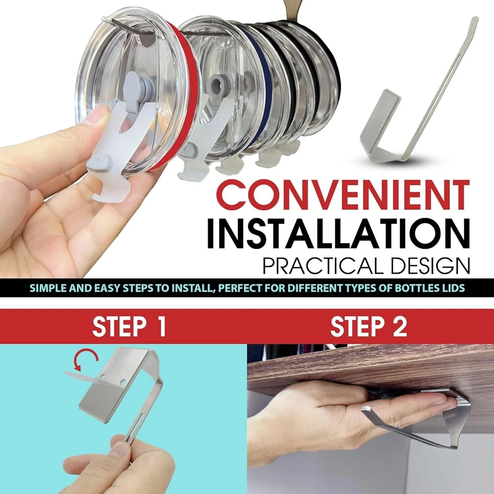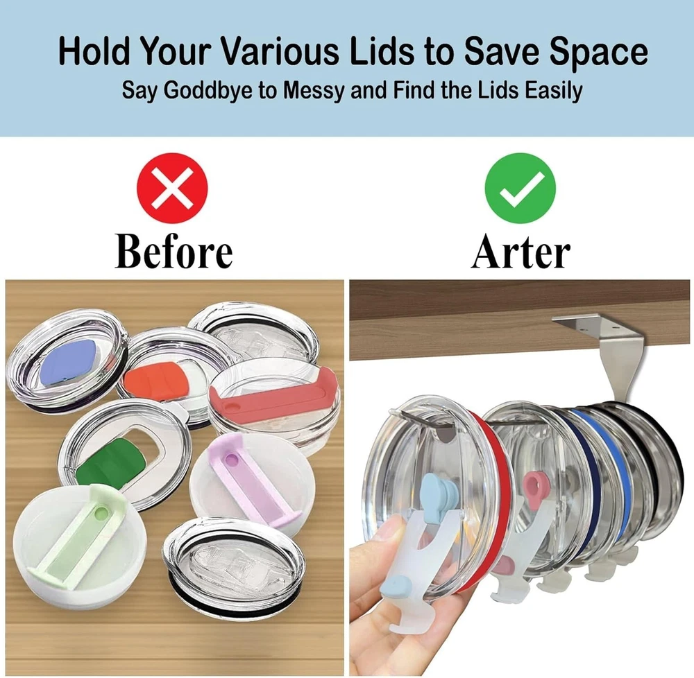 About this item Universal Fit for Under-Cabinet Use: Inventively designed to fit any size tumbler lid. Its horizontal stacking design maximizes space under shelves or cabinets, making it simple to arrange and store lids of different sizes. Maximized Space Utilization: This horizontal tumbler lid organizer was created to be a space-saving marvel. It effectively arranges your lids under shelves or cabinets, freeing up valuable cabinet space and encouraging a tidy kitchen. Streamlined Kitchen Organization: Your kitchen experience will be completely changed by our horizontal tumbler lid organizer, which provides quick and simple access to your lids. You can locate the precise lid you need in a matter of seconds, saving you the trouble of rummaging through cluttered cupboards and drawers. Optimized Space Efficiency: With its clever design, this little, horizontal organizer makes the most of every square inch of your kitchen space. It is the ideal solution for tiny kitchens, apartments, or any other area where making the most use of available space is crucial to maintaining a neat and orderly atmosphere. Intellectual Property Notice: Imitation or reproduction of this product is illegal; a patent is presently pending. Product Description Top About this item Similar Questions Product information Reviews