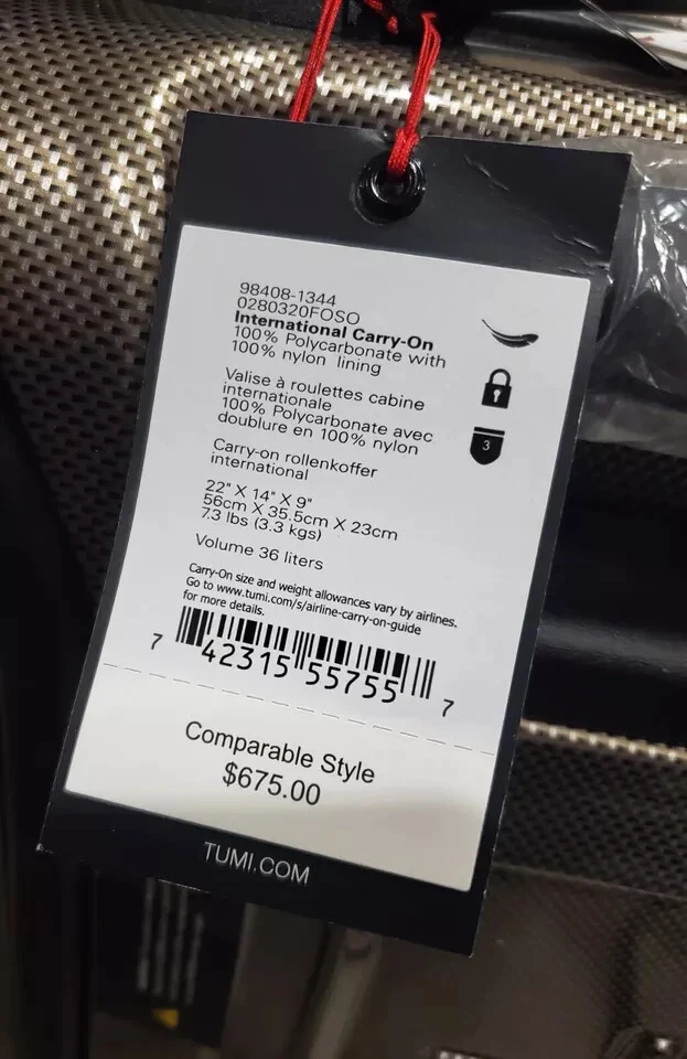 Carry-on arrived in new condition, as advertised. Quick shipping. Great seller. Thanks.