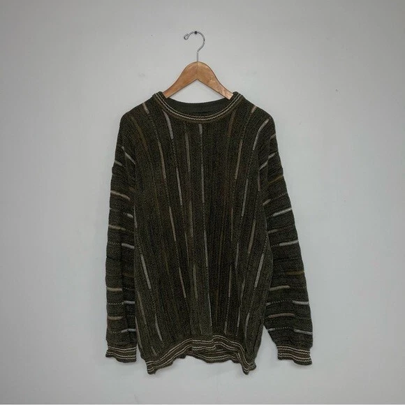 Tundra Canada Vintage Sweater Men's size large Excellent vintage condition, minor wear Colour: Green with brown/tan/ivory details DETAILS This cool vintage sweater has all the Coogi vintage 90s vibes! The green, brown, tan and ivory tones are the perfect blend for your neutral wardrobe. The velour fabric has depth and softness and begs to be touched. The close-ups highlight the artistry of this beautiful sweater. Round neckline Cuffed hem & sleeve hems Really cool textured knit Cotton/acrylic blend Approx measurements (flat): Pit-to-pit: 23.5" Shoulder-to-hem length: 29"