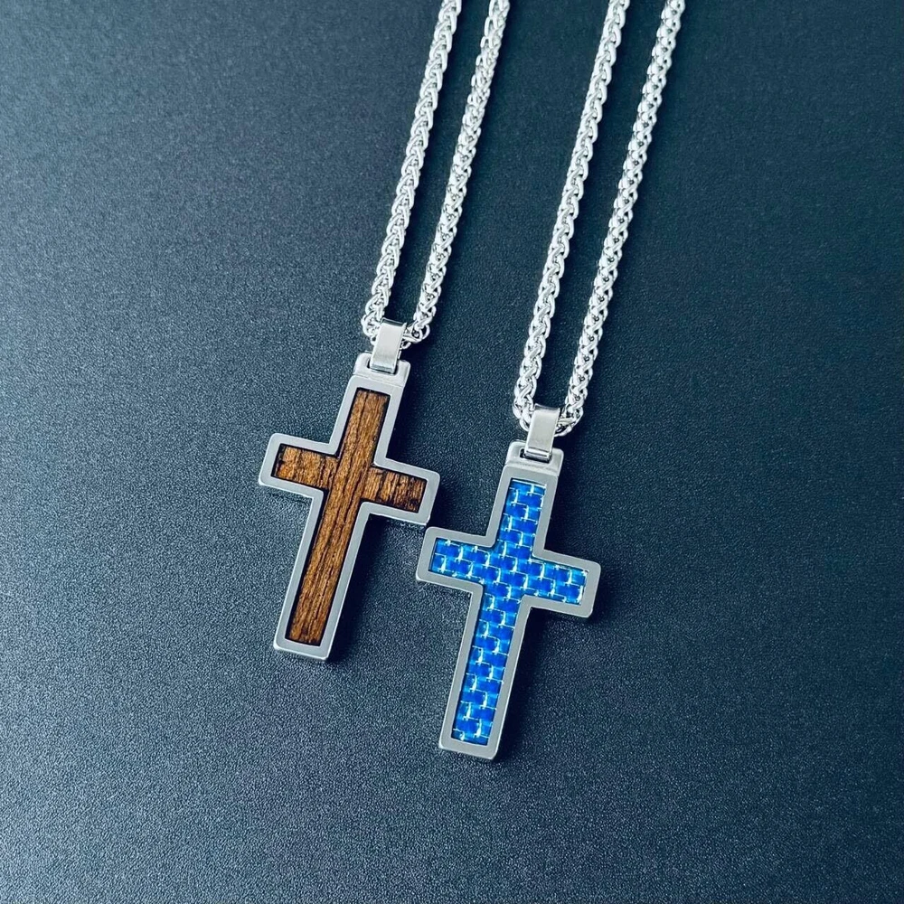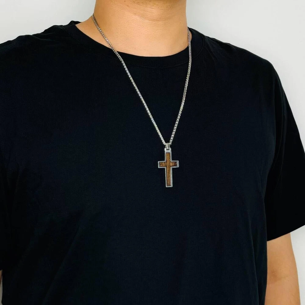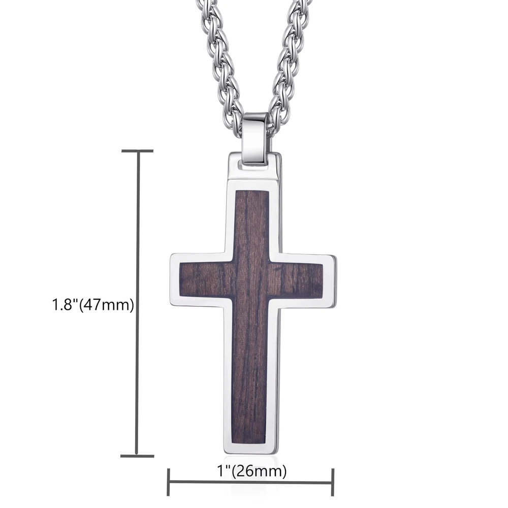 Tungsten steel is known for its super hardness, nothing other than a diamond can scratch a tungsten steel pendant, great material for long lasting jewelry without any fading or scratches Tungsten carbide has a density 1.5 times that of regular stainless steel, providing a more pronounced drape and better wearing experience. Good choice for mens cross necklace The tungsten cross pendant is nicely polished, has smooth touching sense. Super hardness and density also makes the tungsten pendant stand out in both texture and appearance, making it an ideal choice for those who value quality and style Tungsten steel cross pendant with wood inlaid. The warmth of natural wood meets the strength and sleekness of tungsten steel, offering a unique and timeless piece of jewelry that blends nature with modernity Package with branded velvet gift pouch, comes with 24" stainless steel link chain. A good gift for men, suitable for Birthday, Anniversary, Christmas, Valentine's Day, etc