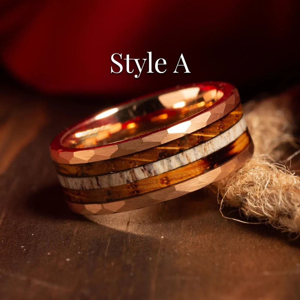 Whiskey Barrel Men’s Ring – 8mm Tungsten Wedding Band with Deer Antler, Guitar String & Aged Oak Wood Inlay | Handmade by NapoleonBands A Story Worth Wearing – Rustic, Refined, and 100% Unique This isn’t just a ring—it’s a legacy. Our Whiskey Barrel Collection transforms reclaimed oak wood from aged whiskey barrels into a bold, masculine 8mm tungsten wedding band that tells a story as rich as the spirit it once held. Paired with natural deer antler and guitar string inlays , this ring is for the man who values craftsmanship, meaning, and individuality. To complete the experience, each Napoleonbands ring is elegantly presented in a premium, artisan-crafted wooden box , complete with personalized laser engraving : https://www.ebay.com/itm/405600082986 For those seeking an elevated presentation, you can upgrade upon request to our luxurious, handcrafted koa wooden ring box — a true statement of craftsmanship and distinction: https://www.ebay.com/itm/405948705902 Ring Details: Material: Genuine Tungsten Carbide Inlays: Whiskey Barrel Oak, Deer Antler, Guitar String Band Width: 8mm Fit: Comfort-Fit (True to Size) Finish: Polished Tungsten with Rustic Accents Protection: Sealed with Ring Armor Resin – water & dirt resistant Customization Available: Add a personal engraving Shipping: We offer free shipping within the U.S. Returns: If your ring is not engraved, you’re welcome to return or exchange it—just reach out to us. If your ring is engraved, we’re unable to accept returns. However, if there’s an error on our part with the engraving, we’ll make it right. Why You'll Love It: ✔ Made from reclaimed whiskey barrel oak – no two rings are alike ✔ Durable, scratch-resistant, and built for 24/7 wear ✔ Safe for sensitive skin – hypoallergenic materials ✔ Free ring sizer available after purchase ✔ Comes with a handcrafted antique wooden ring box ✔ Lifetime warranty + 30-day exchange/return policy ✔ Ships fast and free within the U.S. The Craft Behind the Ring: Each ring starts its journey in a white oak tree, aged through years of whiskey storage. Once retired, the barrels are reclaimed and hand-finished into striking ring inlays. The natural deer antler and guitar string add a rugged edge, blending nature and music into a statement of strength, creativity, and passion. Perfect For: Grooms who love whiskey, nature, or music Anniversary gifts with character Rustic weddings or everyday wear Limited Quantities Available Due to high demand and the unique sourcing of our materials, this ring may sell out quickly. Secure your size while it’s still available.