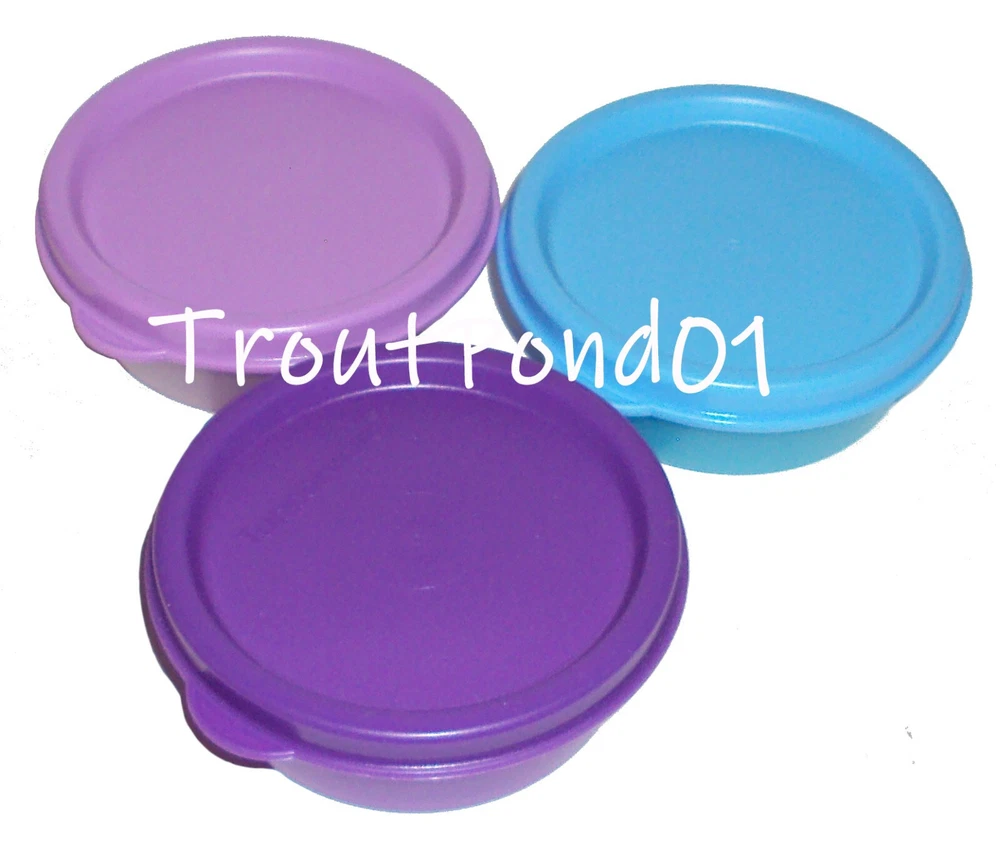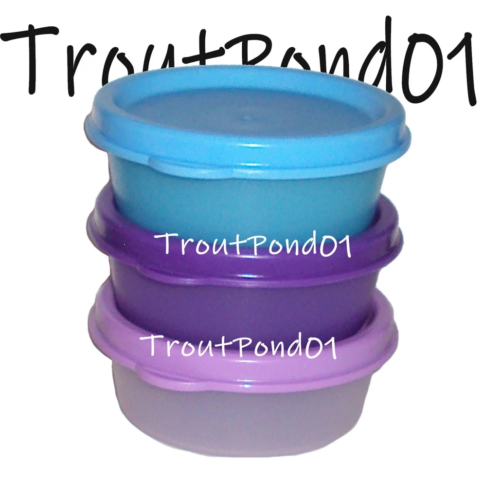 Tupperware Set of 3 Small Storage Containers. (3) Half Snack Cups (Giant Smidget), hold approximately 2 ounces. Measure approximately 3 inches diameter by 1 inch deep. Part number 1642 (container) and 4922 (seal). Colors are purple, blue, and lavender. Virtually airtight, liquid-tight seals. Dishwasher safe and BPA-free. Perfect for travel, lunch box, diaper bag, back pack, on the boat, camping, anytime! Ideal size for condiments, salad dressing, etc. Personal sized individual dipping bowls. Perfect for on-the-go and take out. Brand New. Questions are welcome, combined shipping available, fast service! International Buyers: Please be aware of the laws regarding import into your country. Your country may assess a customs fee or tax on this purchase. United States sellers do not have any control over the tariffs, taxes, and customs fees imposed by your country. You are solely responsible for any import duty or tax that your country may impose. No refunds or partial refunds will be made if you choose to abandon the package due to import fees. If a package is returned to the seller, shipping cost is non-refundable. Please do not ask to have customs information falsified as it is against the law.