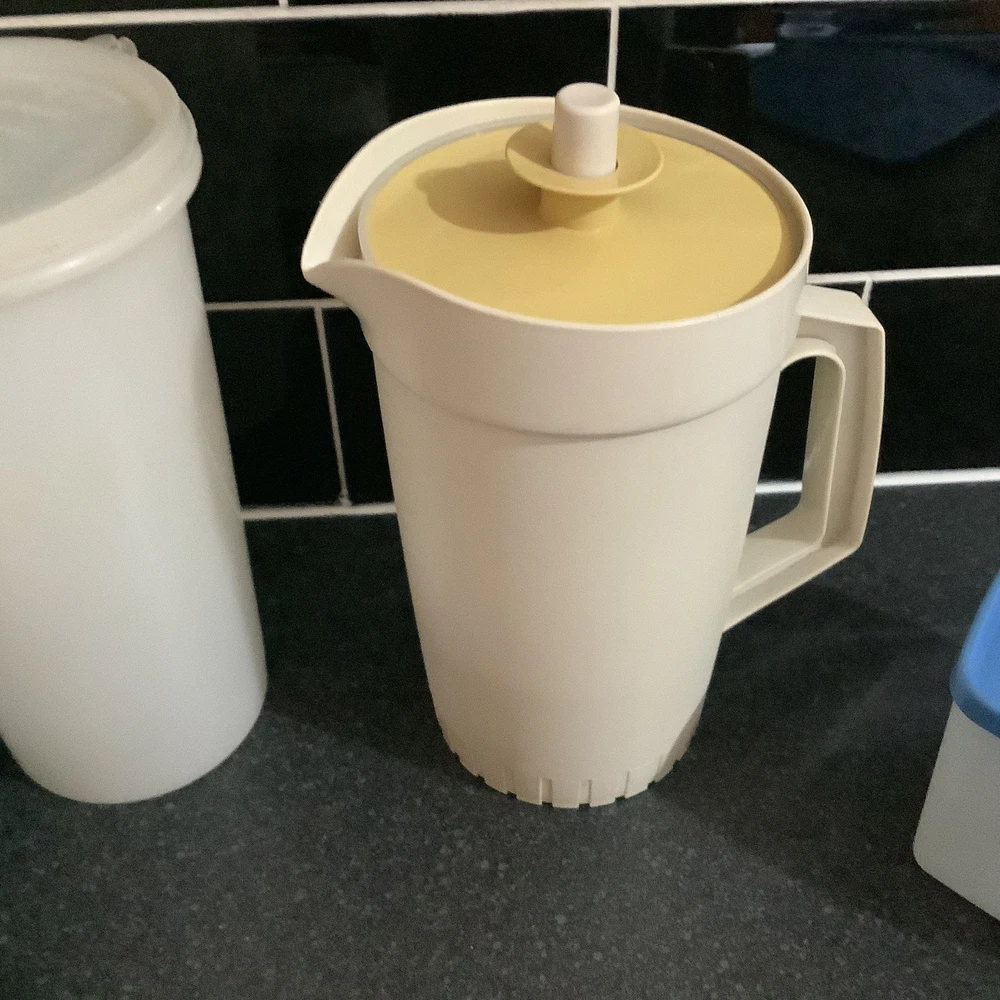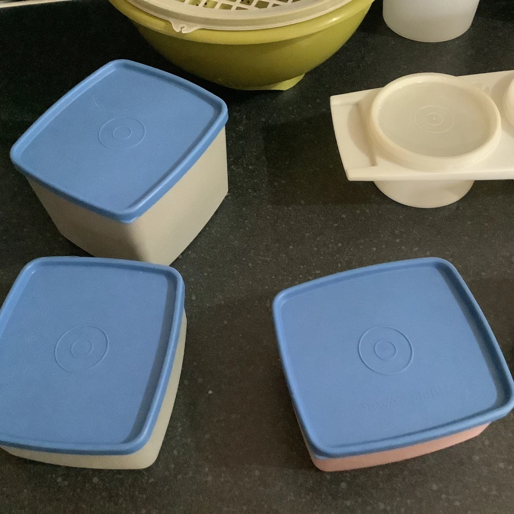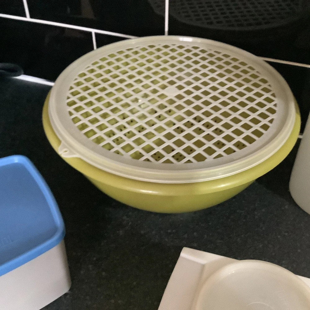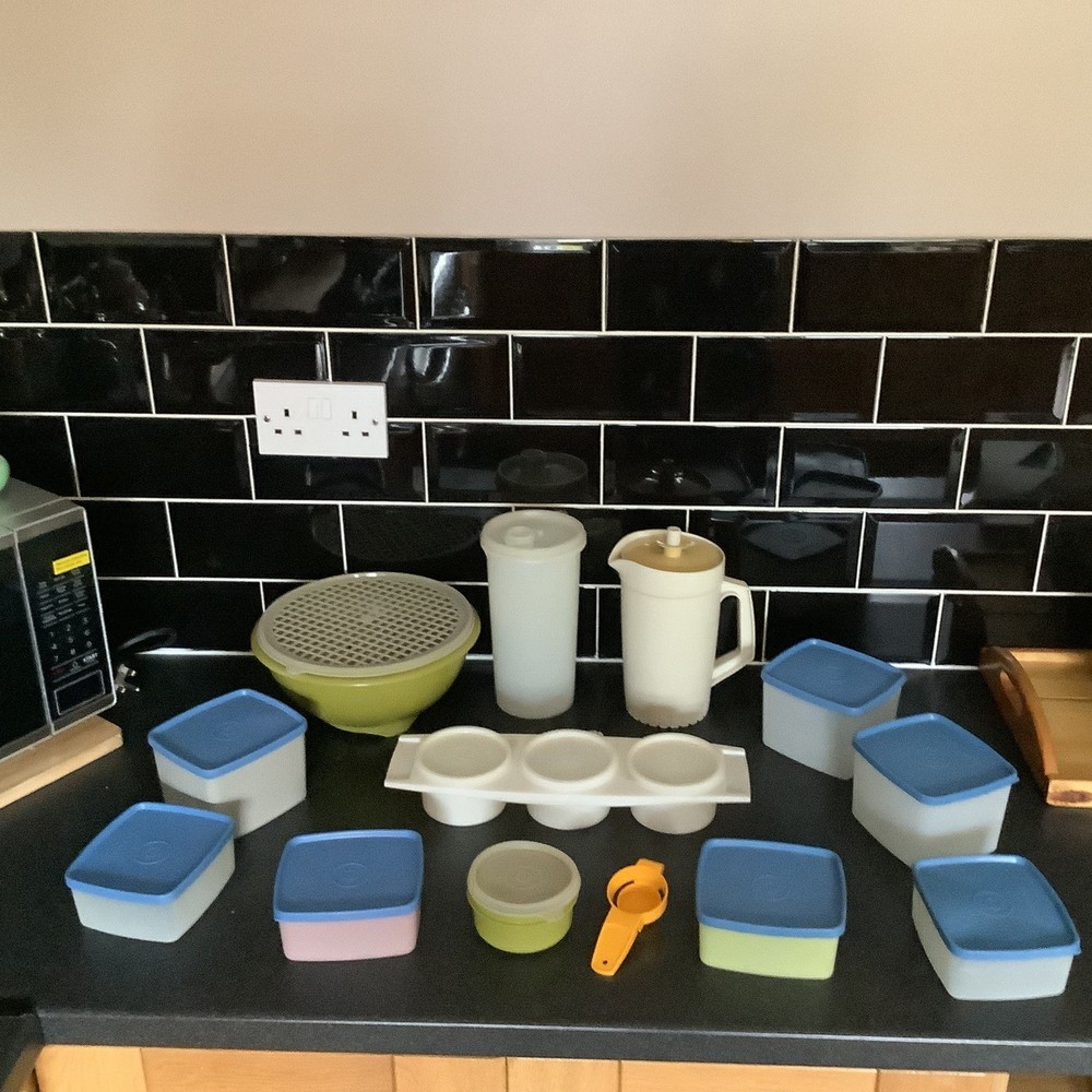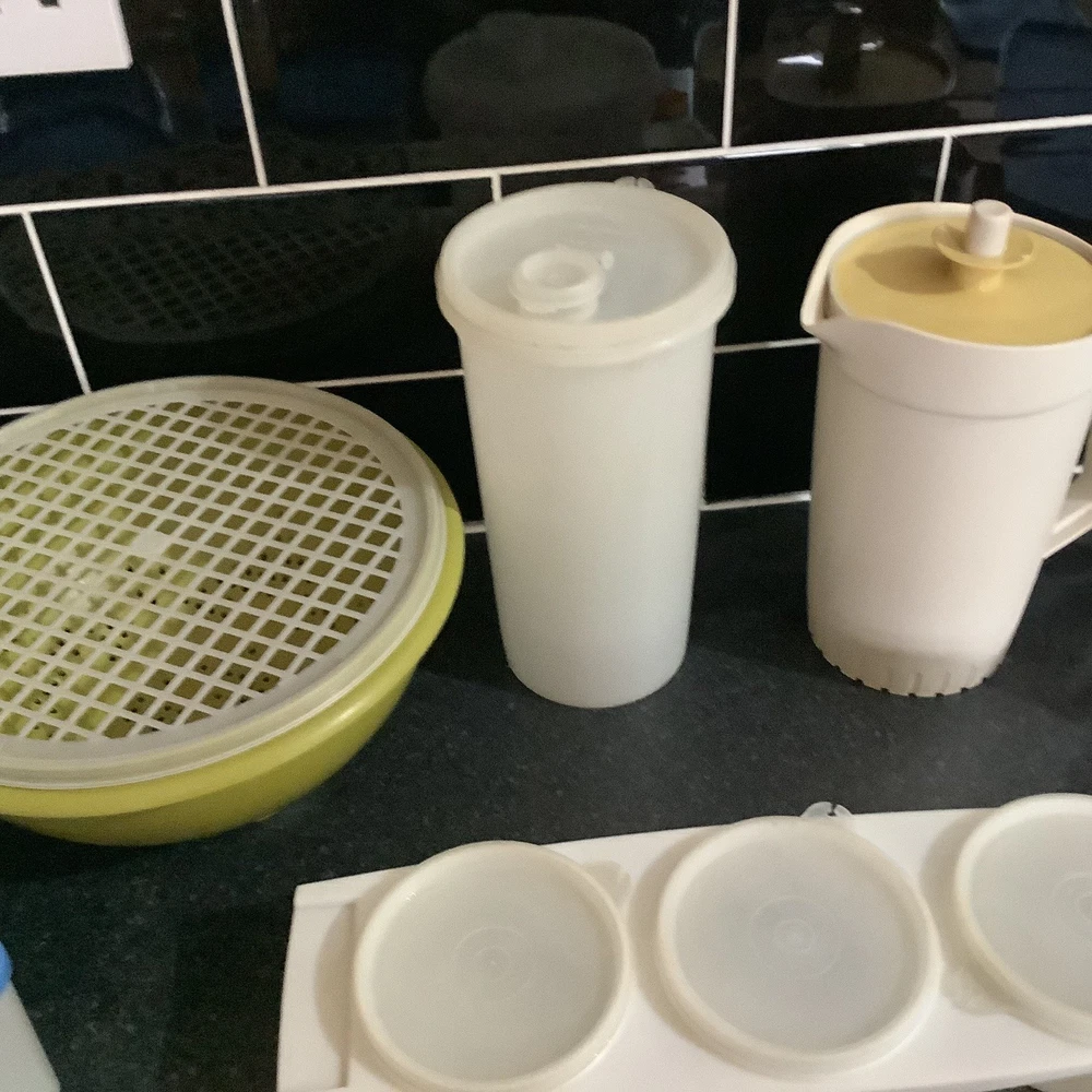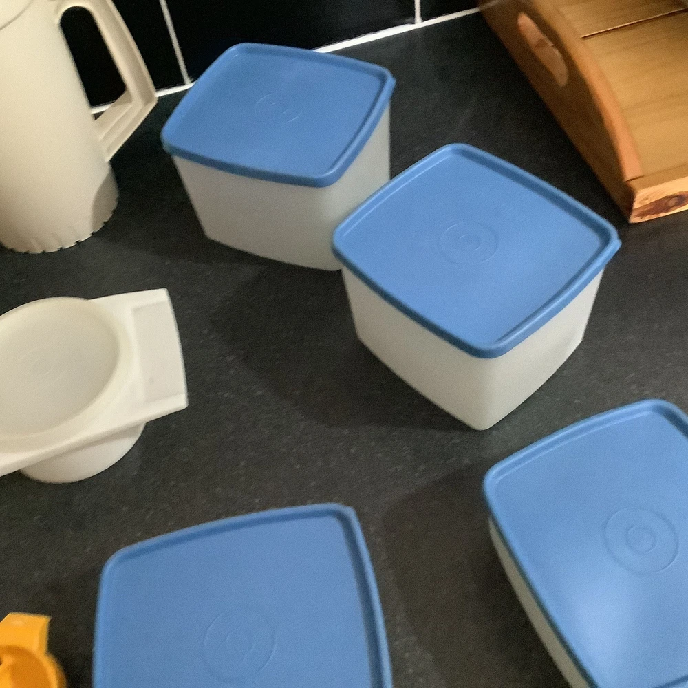 Tupperware Vintage Lot of 13 Tupperware Storage Containers Various Pieces Drainer with net top Jug with press button lid Egg separater Dip condiment tray with lids Small round green tub with lid 7 containers with lids various colours all blue lid Container for juice - small round lip comes off. Please not all are used condition and been in storage. May had marks from wear and age, storage tubs are slightly faded and may have a marks. Any question please ask.