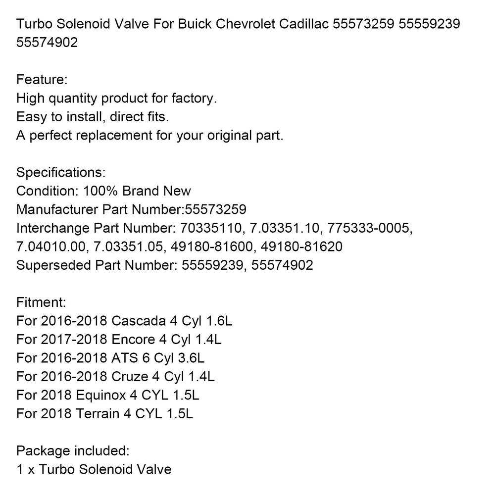 CNC Adjustable Kickstand Side Stand Fit HONDA CBR 600 1000 RR 600RR 1000RR 35.99 USD Free shipping U760E U760 TOYOTA RAV4 Transmission Valve Body For Toyota Camry RAV4 269.87 USD Free shipping Carburetor Carb Rebuild Kit for Yamaha F50-T50hp 4 Stroke 62Y-W0093-11-00 01-04 14.99 USD Free shipping FUEL PUMP FUSE RELAY fit for Yamaha YZF R1 R6 FZ1 Fazer FZ8-N Naked 5VK-81950-40 28.99 USD Free shipping STARTER CLUTCH ASSY FOR YAMAHA FZ1 FZ8 YZF-R1 R1 2004-2015 # 5VY-15570-00-00 21.79 USD Free shipping Gbox Detent Kit for Porsche Transmission 996 997GT3 Boxster S Fixes 2ND Gear WR 18.99 USD Free shipping 6L80 6L90 Transmission Rebuild 1-2-3-4 3-5-Reverse Clutch Seals Pack O-Rings 21.99 USD Free shipping Voltage Rectifier Regulator For Ski-Doo Lynx Forest Legend Touring 515175661 36.69 USD Free shipping Heater Hose Output T Pipes 87248-60460 Fit Toyota Land Cruiser FZJ80 100Series 11.99 USD Free shipping 0B5 DL501 Transmission Valve Body For Audi VW Porsche 629.99 USD Free shipping 7Pcs Pneumatic Fan Clutch Wrench Set Removal Tool Kit For Ford/GM/Chrysler/Jeep 49.87 USD Free shipping Rear Hugger Fender Mudguards ABS Fairing For Honda CBR954RR 2002-2003 Carbon 39.76 USD Free shipping A Fantastic Shop Send us a message Our Store Seller Profile Feedbacks Save this seller Contact Turbo Solenoid Valve For Buick Chevrolet Cadillac 55573259 55559239 55574902 Turbo Solenoid Valve For Buick Chevrolet Cadillac 55573259 55559239 55574902 Feature: High quantity product for factory. Easy to install, direct fits. A perfect replacement for your original part. Specifications: Condition: 100% Brand New Manufacturer Part Number:55573259 Interchange Part Number: 70335110, 7.03351.10, 775333-0005, 7.04010.00, 7.03351.05, 49180-81600, 49180-81620 Superseded Part Number: 55559239, 55574902 Fitment: For 2016-2018 Cascada 4 Cyl 1.6L For 2017-2018 Encore 4 Cyl 1.4L For 2016-2018 ATS 6 Cyl 3.6L For 2016-2018 Cruze 4 Cyl 1.4L For 2018 Equinox 4 CYL 1.5L For 2018 Terrain 4 CYL 1.5L Package included: 1 x Turbo Solenoid Valve About US About Our Items We strive to describe all items accurately and thoroughly, with the utmost care and attention to detail. However, to ensure a mutually satisfactory transaction, we kindly ask for your assistance in thoroughly reviewing the item description and photos, and addressing any questions before placing a bid. Customer Satisfaction We stand behind our commitment with exceptional service, a 100% money-back guarantee, and a dedication to customer satisfaction. I am readily available to address any inquiries or concerns you may have, both before and after your purchase. Our aim is to ensure your shopping experience is enjoyable and that you're delighted with your purchase. Feedback Your feedback is crucial to our business's success. If you're satisfied with your purchase and the service you received, we would greatly appreciate your positive feedback, along with an overall Detailed Selling Rating (DSR) of 5. Please take a moment to leave us positive feedback. Our eBay account is set up to automatically reciprocate positive feedback once yours is received. If you're considering leaving neutral/negative feedback or opening an eBay/PayPal case, we encourage you to reach out to us immediately. We're committed to resolving any issues to the best of our ability. Shipping Parcel will be shipped using Standard shipping method. For security purposes, items will be shipped exclusively to the confirmed address on Paypal. Please ensure your Shipping address is up to date before proceeding with payment. Estimated delivery time within the United States ranges from 3 to 10 business days, depending on your location. Returns We accept returns within 60 days from the date the buyer receives the item. If the item is found to be defective upon receipt, the customer has up to 30 days from the date of receipt to request an exchange for a new item or a refund. For returns due to a change of mind, we accept items in their original selling condition. However, if the package has been opened due to a mistaken order, it does not qualify for our return policy. Please note that the buyer is responsible for covering the cost of return postage. If you encounter any issues, please reach out to us via eBay message, and we'll respond within 24 hours. 3.5" Black High Flow Turbo Intake Elbow For GM 6.6L LML Duramax Diesel 11-16 109.87 USD Free shipping New Turbo Turbocharger for Honda Civic CR-V 1.5L L15B7 2016-2021 49373-07011 US 269.99 USD Free shipping 2PCS Air Duct Seal To Turbocharger 6420940480 6420940580 Fit Mercedes! 13.79 USD Free shipping 2PC TiAL MV-S 38mm Wastegate V-Band Clamp Set Kit with Screws Nuts and Seals YU 32.77 USD Free shipping Charge Pipe C Clip Fit For BMW N54 N55 335i 535i 535xi 335xi 335is 135 UE 11.21 USD Free shipping Electronic Turbocharger Actuator for Jaguar / Land Rover 2.2D 49477-01214 108.99 USD Free shipping Tial Sport 50mm Weld Blow Off Valve BOV Aluminum Flange Turbo 50mm TiAL Flange 13.79 USD Free shipping NEW Turbo Turbocharger Fit Fiat Viaggio Bravo Ottimo 1.4T-Jet 55235154 807072 US 139.99 USD Free shipping New Turbo Electric Actuator For Audi A6 EA888 Gen3 2.0T 06L145612L 70597387 75.79 USD Free shipping Turbo Boost Pressure Control Valve for BMW 1 3 5 6 7 X3 X5 X6 11747796338 F8 26.62 USD Free shipping Turbocharger Wastegate Actuator 04E145725CM 49180-18821 for VW Golf Passat 90.99 USD Free shipping 3 PCS A/C Heater Control Knob Fit For Toyota Tacoma 1995-2004 55905-35310 18.99 USD 19.99 USD Free shipping 5% off