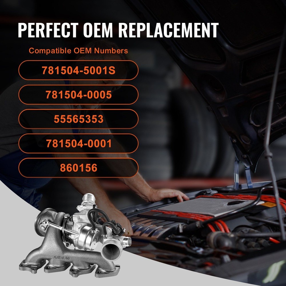 Original Quality, Restore Your Vehicle's Power This turbo turbocharger ensures perfect compatibility and installation with original parts, requiring no modifications. Note: Please lubricate the turbocharger and gaskets with oil before use. Professional installation is highly recommended. The turbo charger's impeller and compressor wheels undergo dynamic balance testing, significantly reducing wear and extending service life. This process minimizes vibrations and noise during operation, ensuring a smoother driving experience. The impeller is made from K418 nickel-based cast alloy, a high-temperature resistant material that maintains optimal performance even under sustained high temperatures, prolonging the engine turbocharger's lifespan. The safety valve of the turbocharger with gasket kit effectively prevents damage to the turbocharger and engine caused by excessive pressure, ensuring secure and stable operation during various driving conditions. The turbocharger housing is made from high-strength ductile iron, delivering excellent performance in high-temperature resistance, durability, and lifespan. The precisely engineered housing ensures proper sealing and avoids leaks.