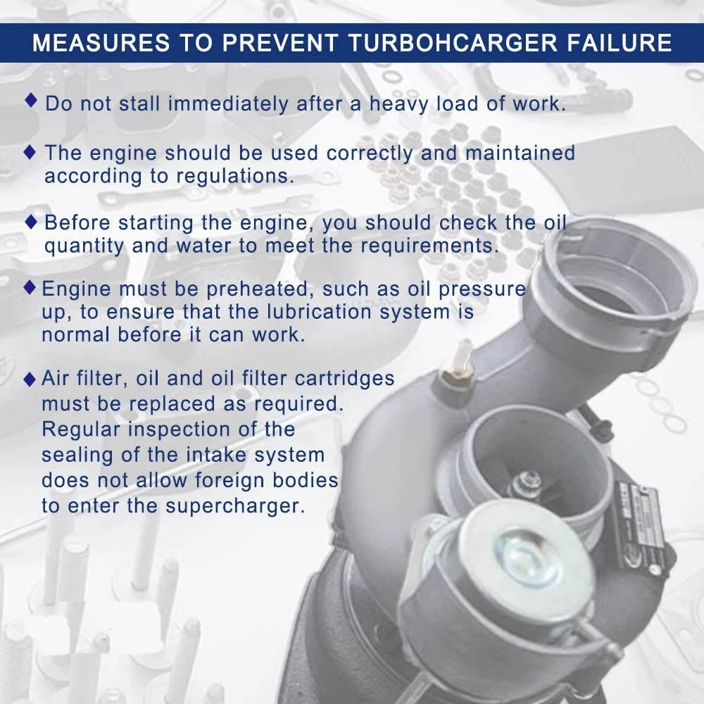 INITIAL INSPECTION AND GENERAL CARE Carefully inspect the air cleaner, air cleaner duct, and the exhaust manifold for any foreign material. Objects left in these areas can severely damage the turbocharger immediately on engine startup. Remove old gaskets and left-over material from the exhaust manifold, the oil supply line and oil drain line flanges. Inspect these surfaces for cracks, flatness, or erosion. Inspect the oil supply and drain lines for degradation and cracking. Make sure that there are no kinks or any other type of restriction or clogging in either line. FINAL INSTALLATION New Turbocharger with Gasket Kit fit for Chevy Cruze Sonic Trax Buick Encore INITIAL INSPECTION AND GENERAL CARE Carefully inspect the air cleaner, air cleaner duct, and the exhaust manifold for any foreign material. Objects left in these areas can severely damage the turbocharger immediately on engine startup. Remove old gaskets and left-over material from the exhaust manifold, the oil supply line and oil drain line flanges. Inspect these surfaces for cracks, flatness, or erosion. Inspect the oil supply and drain lines for degradation and cracking. Make sure that there are no kinks or any other type of restriction or clogging in either line. FINAL INSTALLATION Install the turbocharger, taking care to ensure that no dirt or foreign material enters the turbocharger openings. Always, use new gaskets and O-rings (where applicable). Do not connect the oil supply line or the air cleaner duct yet, see later steps. Pre-lube the turbocharger by pouring clean engine oil into the oil inlet hole of the turbo. With your fingers, spin the compressor wheel several times to coat the turbocharger bearings with oil. Pour more oil into the oil inlet hole to top it off. There may be some drainage, but this is of no concern. Connect the oil supply line and the air cleaner duct. Check for proper crankcase oil level. With the fuel shut off to prevent engine start, crank the engine for 10-15 seconds, or until the gauge shows an oil pressure build up. Start the engine and let it idle for 5-10 minutes. Do not rev the engine during this time. Check the installation for any oil leaks. The installation tips listed here are general guidelines that apply to all turbos and do not include vehicle-specific details. Please refer to the authorized original equipment service manual for detailed installation instructions. If you do not have the experience, proper tools or manuals, please seek the services of a qualified technician. 6 Ways to Protect Your Turbo Engine 1. Regular Oil Maintenance For the best performance from a turbocharger, change the oil at least every 5,000 miles. 2. Warm Up the Engine For the first 10 minutes of driving a cold car, go easy on the accelerator pedal to limit the strain on the oil pump and prevent unnecessary wear and tear on the turbo system. Wait at least 10 minutes before going full throttle, or watch the oil gauge for when it’s reached its optimum temperature. 3. Don’t Overstep the Limits of the Turbo when Cruising When cruising around town or on the motorway, try not to jab the accelerator. Instead, ease the power on slowly to give the turbo a chance to start spinning freely, and use the accelerator sparingly to maintain your speed. While turbos are rigorously stress-tested, and should last the lifetime of the engine, regular bouts of aggressive driving could take their toll, and cause costly issues. And remember – not only will gentle cruising spare your turbo, it’ll give you great fuel economy, too. 4. Use Your Gears to Overtake Whether you’re driving up a long hill, overtaking on an A road or accelerating into the fast lane on the motorway, downshifting into a lower gear is a safer long-term option than relying purely on the turbocharger. Gears were built for aiding performance up and down the rev range, so using a combination of gear changes and turbo boost will help to limit the wear and tear suffered through the turbo system. 5. Let the Engine Cool After Driving Turbos produce a lot of heat while driving, and if you turn off the engine straight away, this residual heat will boil the oil in the turbo system, leading to a build-up of carbon particles that can cause corrosion and premature engine wear. After driving, get in the habit of leaving the engine running for a couple of minutes at idle, which will cool the turbo enough to switch off the engine without cooking the engine oil. 6. Don’t Blip the Throttle Before Turning the Engine Off Whether you’re parking or simply want to hear the whizz of the turbo charger, don’t blip the throttle right before turning the ignition off. Pressing the accelerator causes the rotating turbines in the turbo to spin; when the engine is switched off, the flow of oil lubricating these moving parts will stop, but the turbines won’t stop spinning. This puts strain on the bearings, causing friction and a build-up of heat which can lead to a failure in the turbo system. You can reduce this risk by following the advice in point five – leaving the engine to cool before switching off the ignition. Item Specifics Brand gdcarpartsin Manufacturer Part Number GD842545CAR Warranty 1 Year Model GT1446V,GT1446V-781504,GT1446SLM Type Turbo Charger Fitment Type Direct Replacement Placement on Vehicle Front Custom Bundle Yes Interchange Part Number 55565353,25201063,7815041,7815042,7815044,7815045 Other Part Number 7815040002,7815040004,7815040005,7815040006,7815040007 Superseded Part Number 781504-1,781504-2,781504-4,781504-5,7815045006,8471446 Package Contents As the picture shows Modified Item NO OE Spec or Performance/Custom OE Spec Non-Domestic Product No Fit 1 2013-2021 Chevrolet Trax 1.4L Fit 2 2011-2015 Chevrolet Cruze 1.4L Fit 3 2013-2021 Buick Encore 1.4L Fit 4 2012-2020 Chevrolet Sonic 1.4 Fit5 2016 Chevrolet Cruze Limited 1.4L RPM Max 4900 Fuel Gas KW 138/140 Engine Code A14NET Displacement 1.4L, 1364 ccm, 4 Cylinders DOHC Shipping 1. Orders processed wit