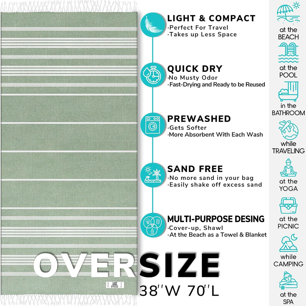 Our Turkish beach towel is much thinner than standard towels and takes up very little space in your bag. Thus, it offers a very practical solution during your travels. Say goodbye to damp towels! This quick-drying design saves you time and energy in the laundry. Also, a simple shake removes the sand. Our towels are pre-washed and Made in Turkey. This isn't just a beach towel! Use it as a yoga mat, picnic blanket, cozy wrap, or stylish cover-up. With a lot of vibrant colors to choose from, find the perfect one to match your personality. The Gift of Relaxation: Surprise your loved ones with the Turksh Beach Towels. Our Turkish beach towels make fantastic birthday, housewarming, or any occasion gifts for men and women who appreciate style. Product Description The video showcases the product in use. The video guides you through product setup. The video compares multiple products. The video shows the product being unpacked. Our Other Products Add to Cart Customer Reviews 4.4 out of 5 stars 2,404 5.0 out of 5 stars 5 4.4 out of 5 stars 2,404 4.1 out of 5 stars 1,875 4.1 out of 5 stars 1,875 4.1 out of 5 stars 1,875 Price $12.90 $ 12 . 90 — — — — — Element Cotton Polyester Blend Cotton Polyester Blend Cotton Polyester Blend Cotton Polyester Blend Cotton Polyester Blend Cotton Polyester Blend Design Sultan Herringbone Diamond Sultan Herringbone Diamond Dimension 38 x 70 inch 36 x 70 inch 36 x 70 inch 18 x 30 inch 18 x 30 inch 18 x 30 inch Absorbency High High High High High High Dry time Fast Fast Fast Fast Fast Fast Number of Items in Package 1 1 1 2 2 2 Color Variations 30 30 30 30 30 30 Areas of Use Beach & Pool & Bathroom Beach & Pool & Bathroom Beach & Pool & Bathroom Kitchen & Bathroom & Gym Kitchen & Bathroom & Gym Kitchen & Bathroom & Gym Wonderful Present ✔ ✔ ✔ ✔ ✔ ✔ Pre-laundered ✔ ✔ ✔ ✔ ✔ ✔ Drying machine ✔ ✔ ✔ ✔ ✔ ✔ Can Be Ironed ✔ ✔ ✔ ✔ ✔ ✔