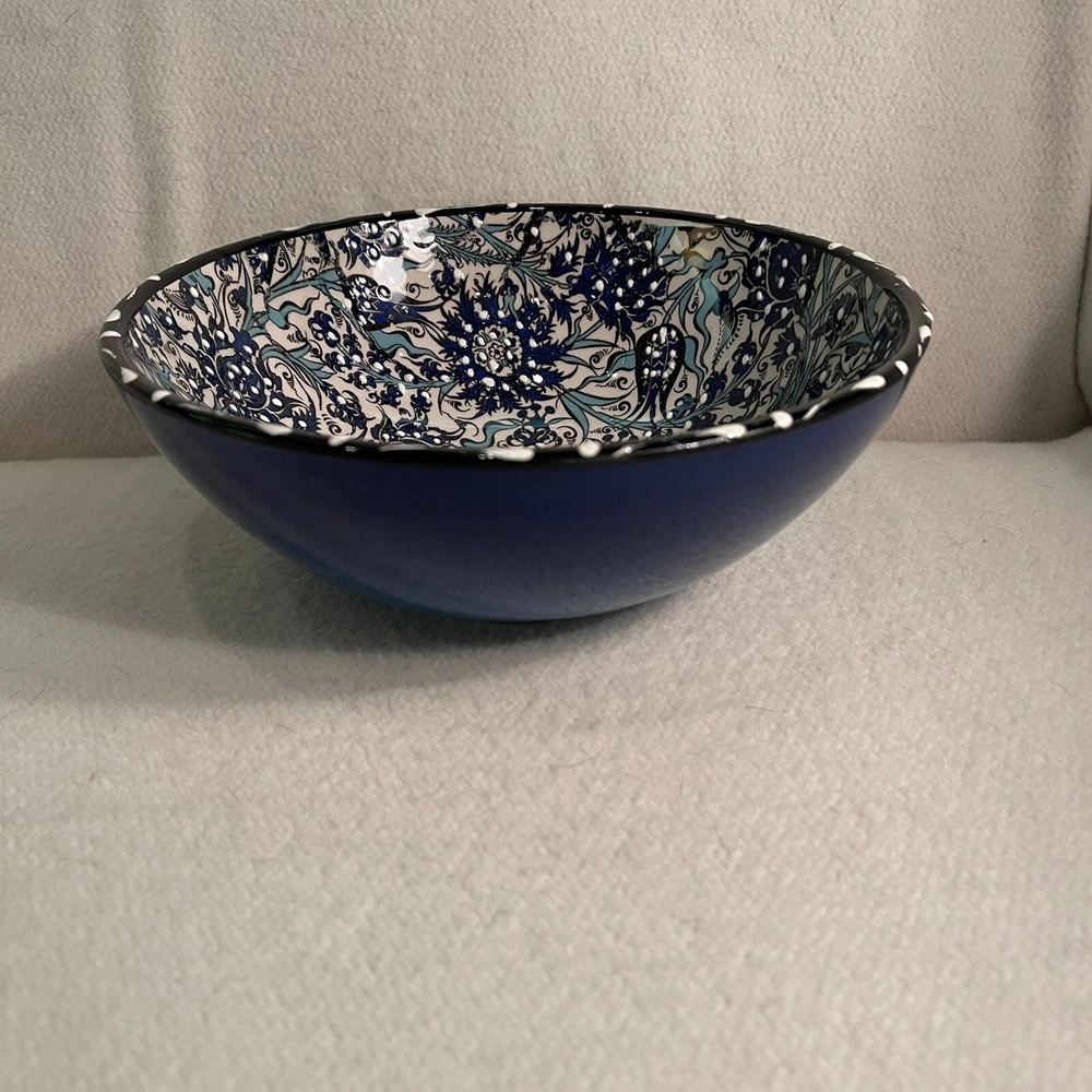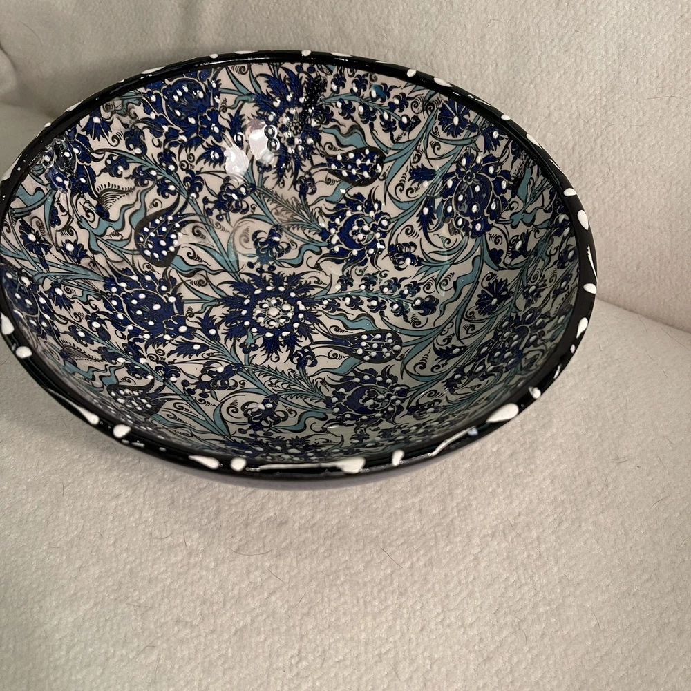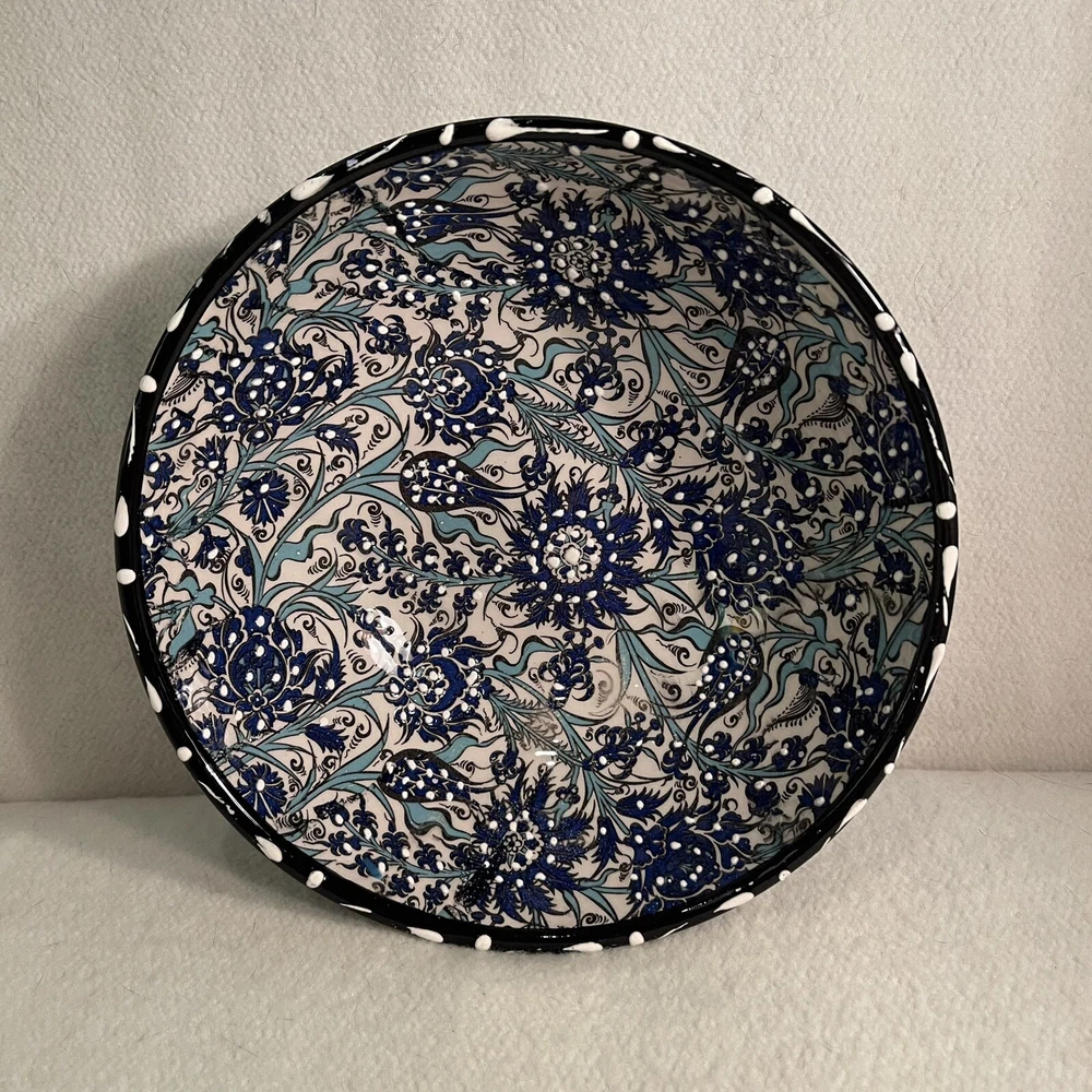 Material: Ceramic Pattern: Floral Shape: Round Country/Region of Manufacture: Turkey Style: Contemporary Item Height: 3” Theme: Flower Backstamp: Printed Item Weight: 1.5 Lbs Item Diameter: 8.25” Time Period Manufactured: 1990-1999 Brand: Turkish Vintage: Yes Features: Hand Painted, Decorative Production Style: Art Pottery Color: Blue White Black Type: Serving Bowl