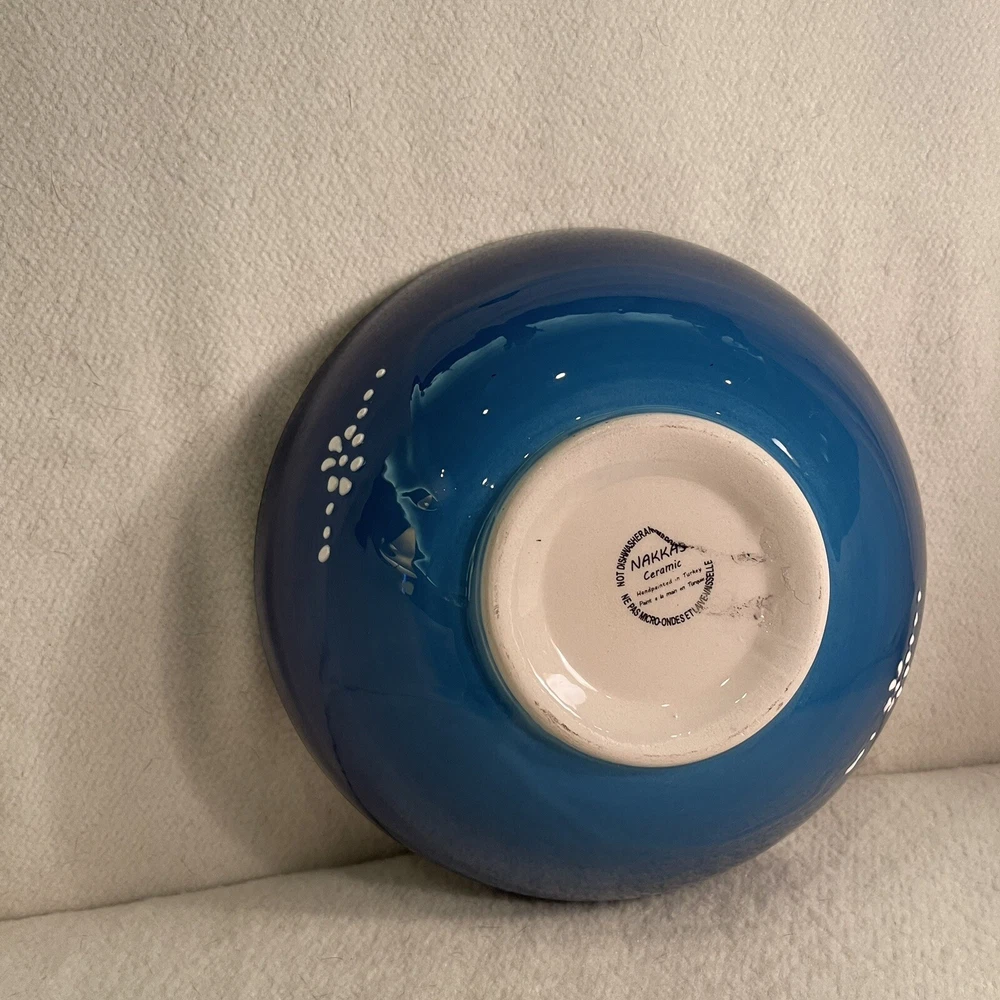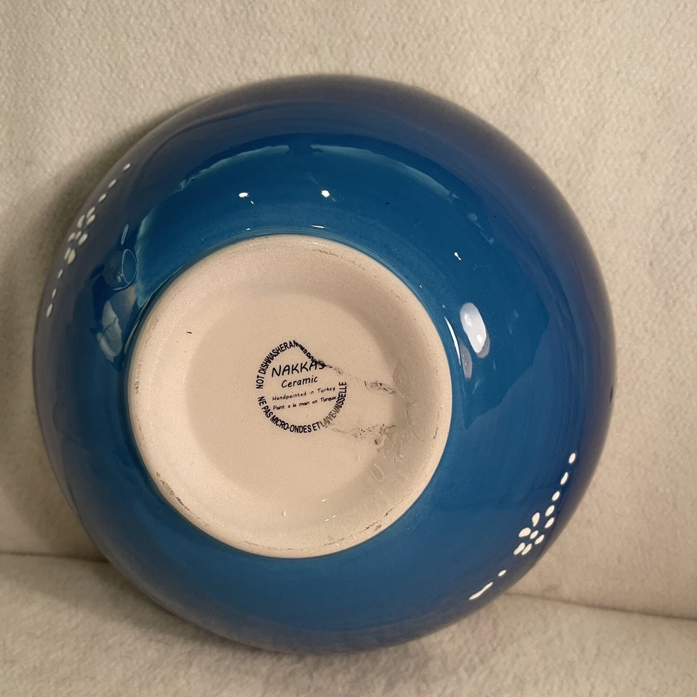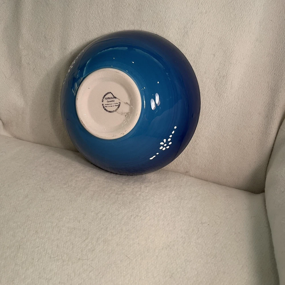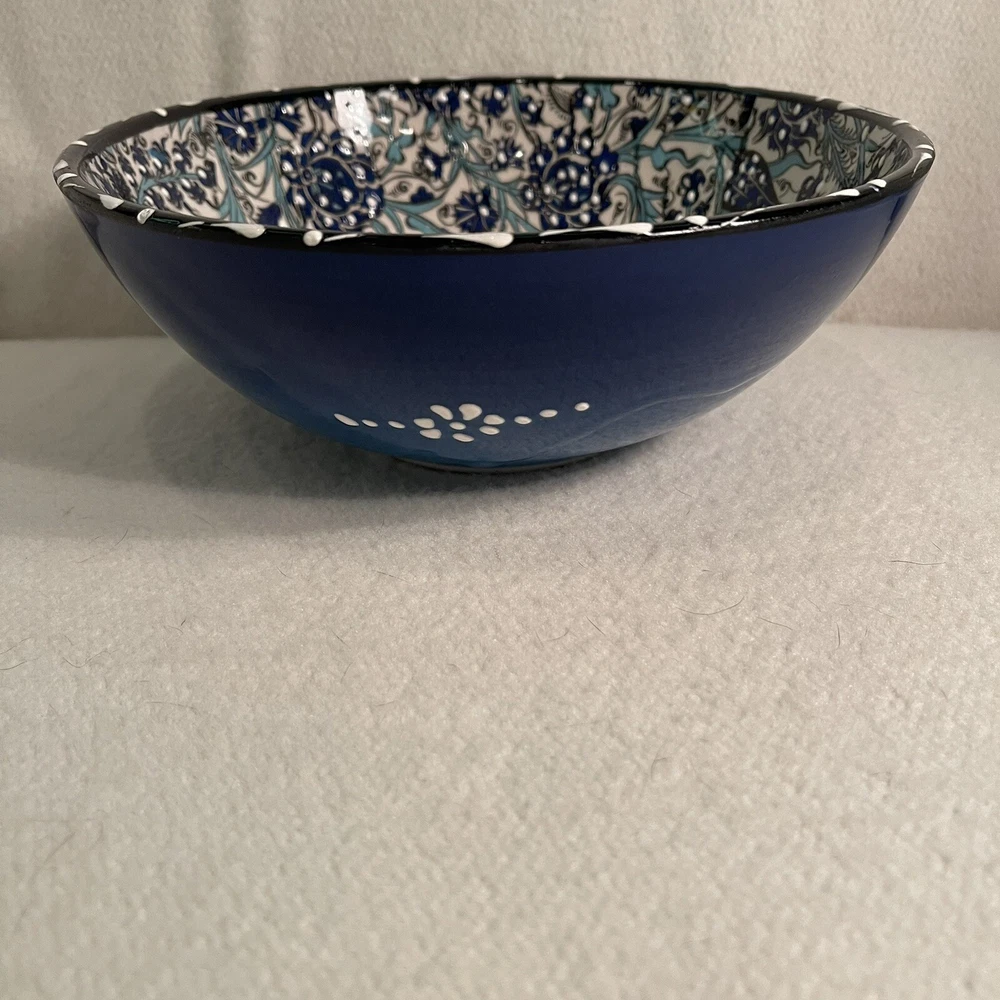 Material: Ceramic Pattern: Floral Shape: Round Country/Region of Manufacture: Turkey Style: Contemporary Item Height: 3” Theme: Flower Backstamp: Printed Item Weight: 1.5 Lbs Item Diameter: 8.25” Time Period Manufactured: 1990-1999 Brand: Turkish Vintage: Yes Features: Hand Painted, Decorative Production Style: Art Pottery Color: Blue White Black Type: Serving Bowl