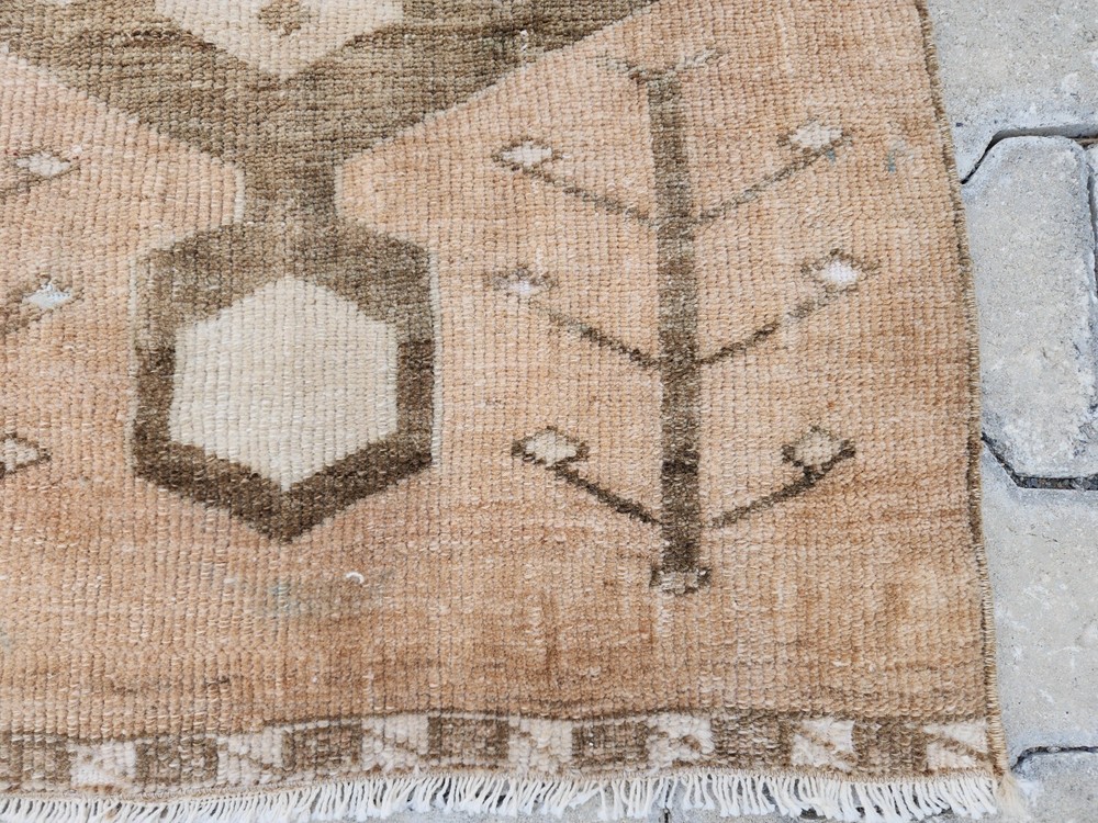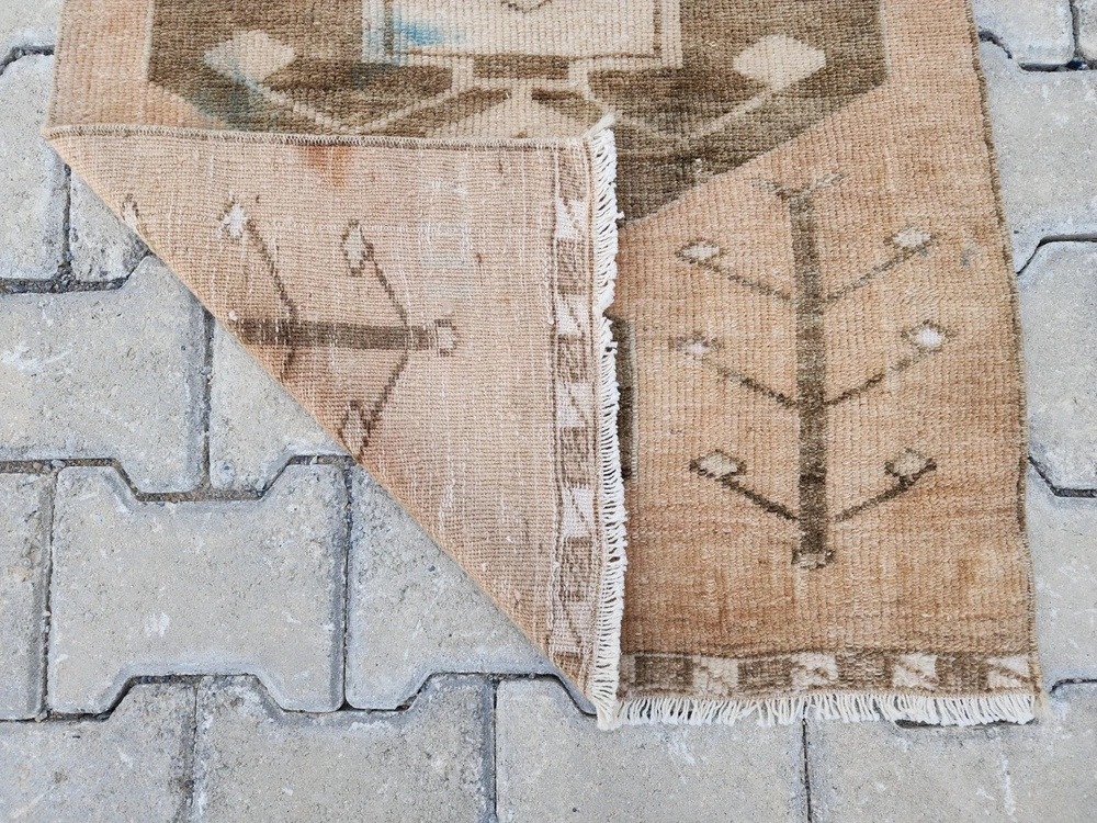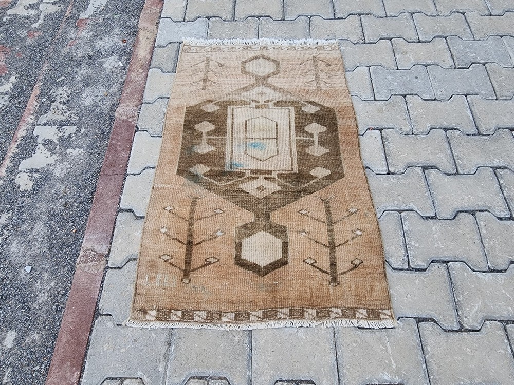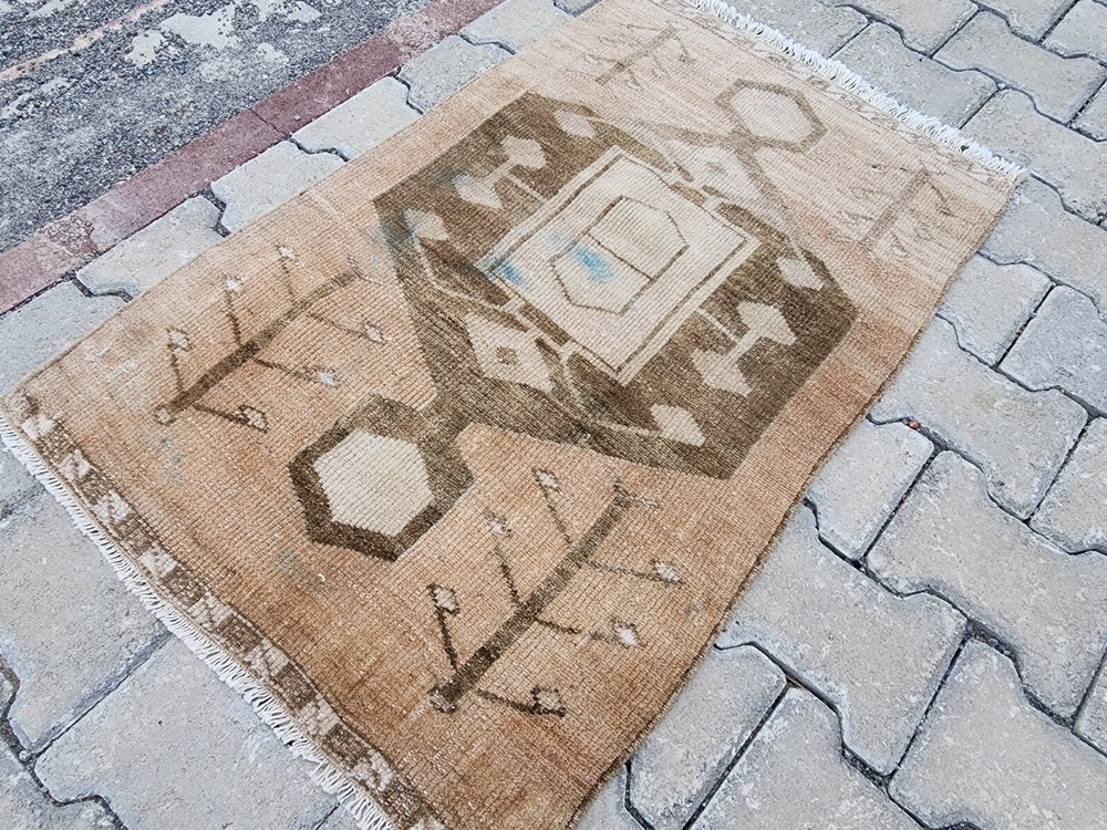 Turkish Vintage Rug – Camel Brown Medallion | Handwoven Minimalist Kilim This authentic Turkish rug reflects the artistry of Anatolian weaving with its soft, naturally faded look and clean geometric details. Likely from regions like Uşak, Kars, or Konya, it's a perfect fit for bohemian, rustic, or minimalist interiors. 🎨 Color Palette Main Color: Light brown (camel tone – a mix of beige and earthy hues) Detail Colors: Dark brown and cream Its washed-out appearance gives a warm, grounded, and vintage charm. 🧵 Pattern & Style A bold geometric motif stands at the center, interpreted as a stylized medallion. Around it, subtle botanical elements—resembling tree branches or floral stems—add character without overwhelming the design. The border features clean, minimalist geometric lines that preserve the simplicity of the overall piece. 🧶 Craftsmanship Handwoven in Turkey using natural wool and traditional vegetable dyes, this vintage rug showcases refined minimalism with cultural depth. Product Features 📌 Origin : Turkey – Central or Eastern Anatolia 📌 Material : Natural wool with vegetable-based dyes 📌 Weaving : Handwoven kilim, vintage style 📌 Condition : Well-preserved 📌 Return Policy : 30-day return guarantee 📏 Dimensions ➡ Width: 64 cm ➡ Length: 99 cm 📦 Shipping & Delivery 🚀 Free shipping within 1–3 business days 🌍 Ships worldwide – Secure packaging 💬 Questions? Just send us a message—glad to help.