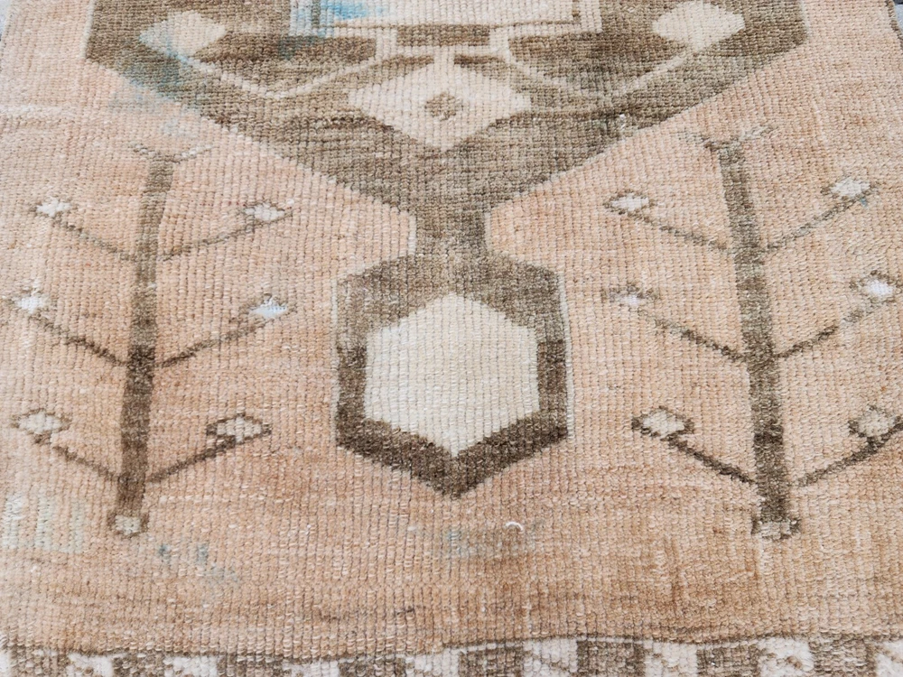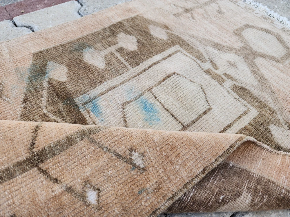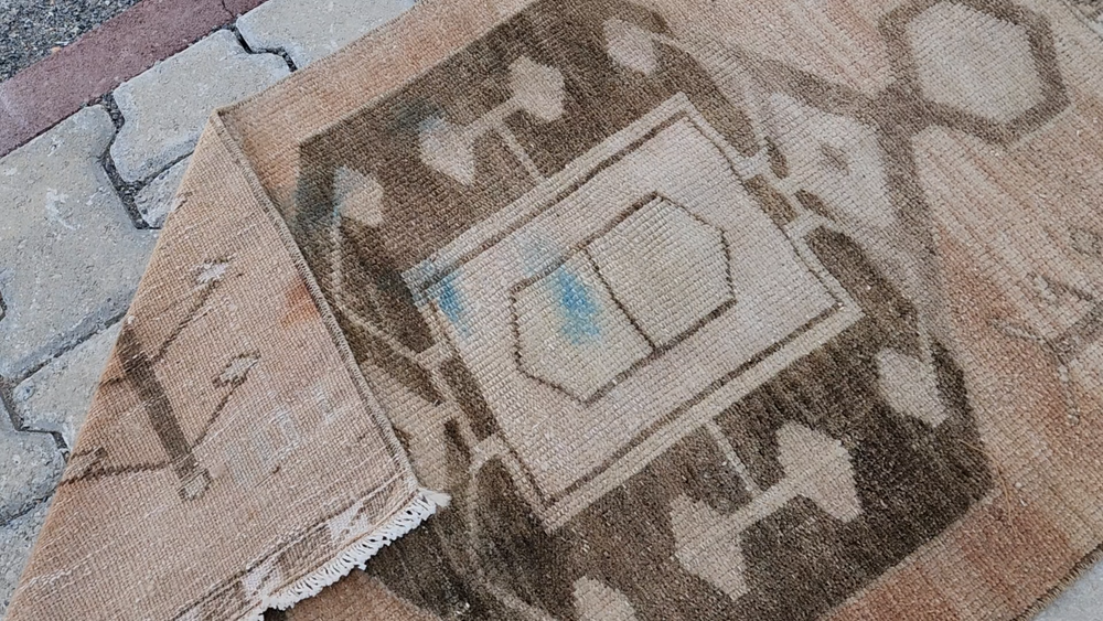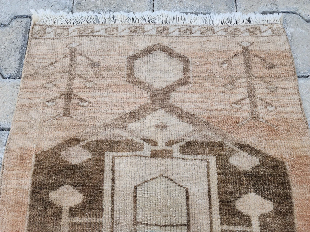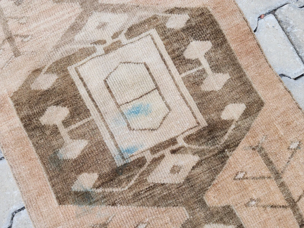 Turkish Vintage Rug – Camel Brown Medallion | Handwoven Minimalist Kilim This authentic Turkish rug reflects the artistry of Anatolian weaving with its soft, naturally faded look and clean geometric details. Likely from regions like Uşak, Kars, or Konya, it's a perfect fit for bohemian, rustic, or minimalist interiors. 🎨 Color Palette Main Color: Light brown (camel tone – a mix of beige and earthy hues) Detail Colors: Dark brown and cream Its washed-out appearance gives a warm, grounded, and vintage charm. 🧵 Pattern & Style A bold geometric motif stands at the center, interpreted as a stylized medallion. Around it, subtle botanical elements—resembling tree branches or floral stems—add character without overwhelming the design. The border features clean, minimalist geometric lines that preserve the simplicity of the overall piece. 🧶 Craftsmanship Handwoven in Turkey using natural wool and traditional vegetable dyes, this vintage rug showcases refined minimalism with cultural depth. Product Features 📌 Origin : Turkey – Central or Eastern Anatolia 📌 Material : Natural wool with vegetable-based dyes 📌 Weaving : Handwoven kilim, vintage style 📌 Condition : Well-preserved 📌 Return Policy : 30-day return guarantee 📏 Dimensions ➡ Width: 64 cm ➡ Length: 99 cm 📦 Shipping & Delivery 🚀 Free shipping within 1–3 business days 🌍 Ships worldwide – Secure packaging 💬 Questions? Just send us a message—glad to help.