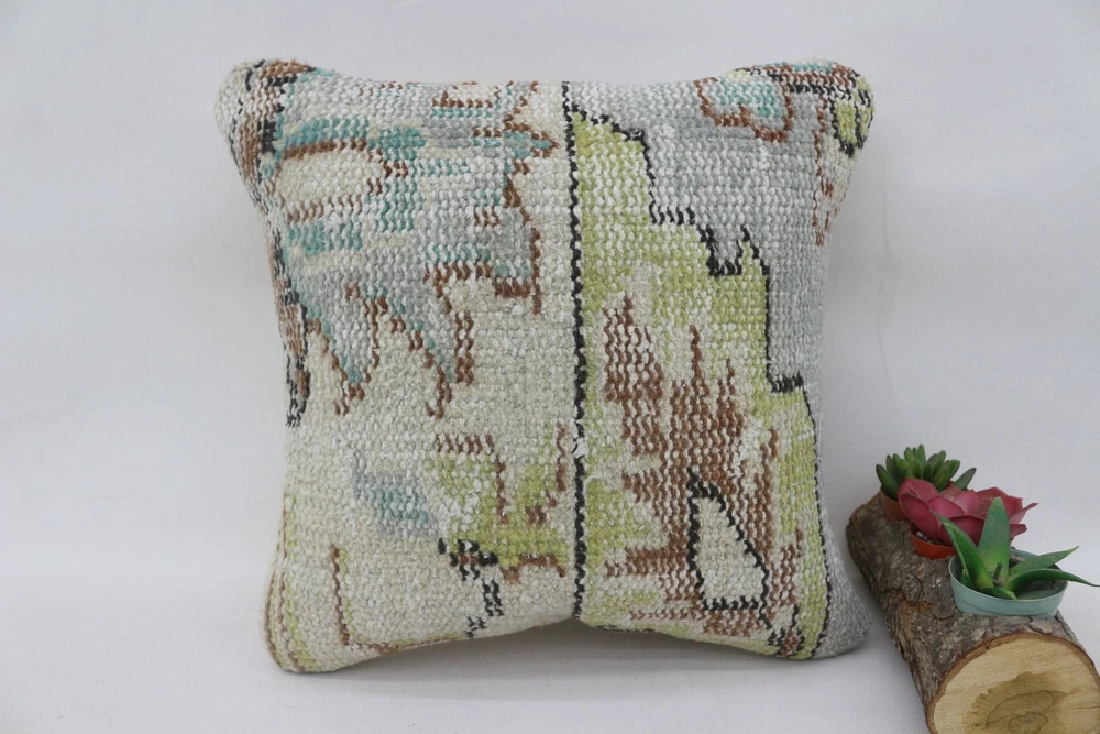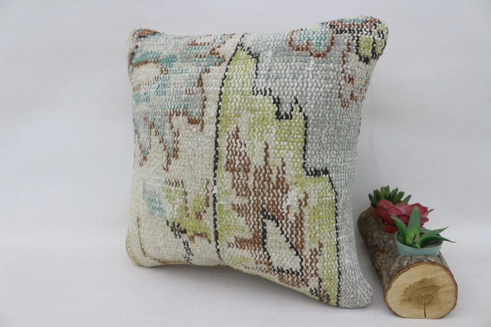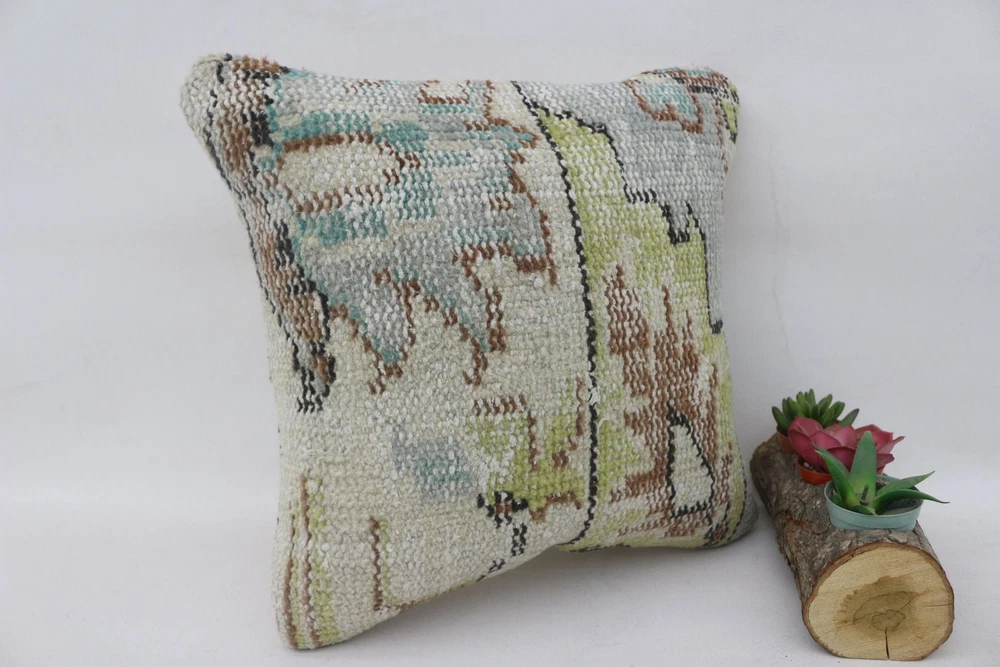 Turkish Pillow, 14"x14" Beige Cushion Case, Ethnical Kilim Rug Pillow